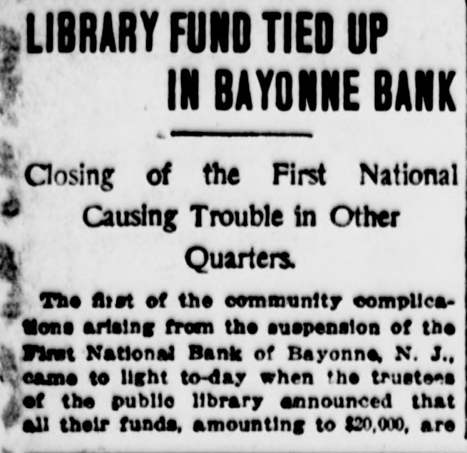 LIBRARY FUND TIED UP IN BAYONNE BANK Closing of the First National Causing Trouble in Other Quarters. The first of the community complicaMons arising from the suspension of the First National Bank of Bayonne, N. J., came to light to-day when the trustees of the public library ennounced that all their funds, amounting to $20,000, are
