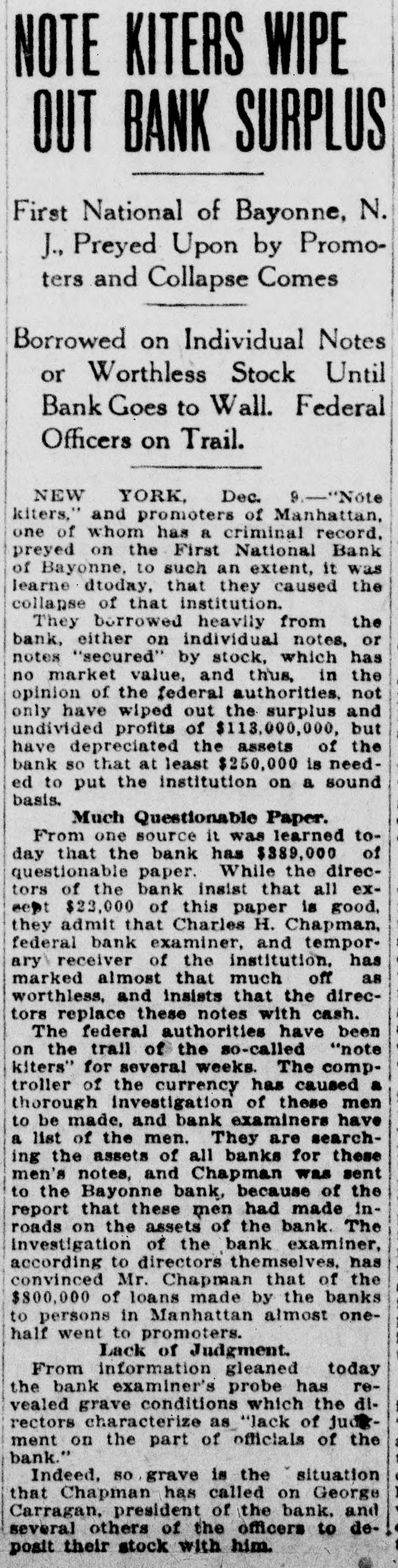 NOTE KITERS WIPE OUT BANK SURPLUS First National of Bayonne, N. J., Preyed Upon by Promoters and Collapse Comes Borrowed on Individual Notes or Worthless Stock Until Bank Goes to Wall. Federal Officers on Trail. NEW YORK, Dec. 9.-"Note kiters," and promoters of Manhattan, one of whom has a criminal record. preyed on the First National Bank of Bayonne, to such an extent, it was learne dtoday, that they caused the collanse of that institution. They borrowed heavily from the bank, either on individual notes, or notes "secured" by stock, which has no market value, and thus, in the opinion of the federal authorities. not only have wiped out the surplus and undivided profits of $113,000,000, but have depreciated the assets of the bank so that at least $250,000 is needed to put the institution on a sound basis. Much Questionable Paper. From one source it was learned today that the bank has $389,000 of questionable paper. While the directors of the bank insist that all exeept $23,000 of this paper is good, they admit that Charles H. Chapman, federal bank examiner, and temporary receiver of the institution. has marked almost that much off as worthless, and insists that the directors replace these notes with cash. The federal authorities have been on the trail of the so-called "note kiters" for several weeks. The comptroller of the currency has caused a thorough investigation of these men to be made, and bank examiners have a list of the men. They are searching the assets of all banks for these men's notes, and Chapman was sent to the Bayonne bank, because of the report that these men had made inroads on the assets of the bank. The investigation of the bank examiner, according to directors themselves. has convinced Mr. Chapman that of the $800,000 of loans made by the banks to persons in Manhattan almost onehalf went to promoters. Lack of Judgment. From information gleaned today the bank examiner's probe has revealed grave conditions which the directors characterize as "lack of judgment on the part of officials of the bank." Indeed, so grave is the situation that Chapman has called on George Carragan, president of the bank. and several others of the officers to deposit their stock with him.