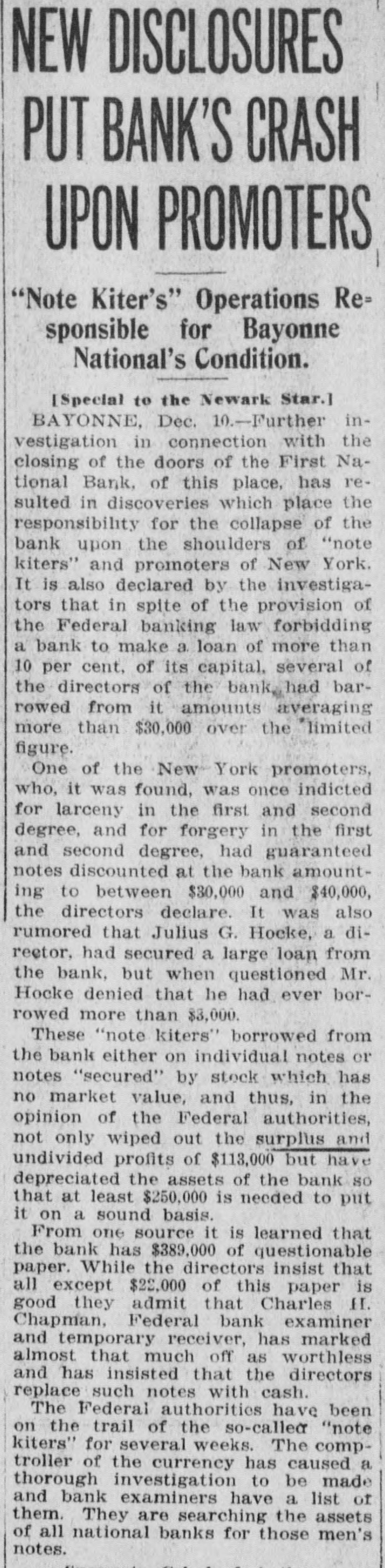 NEW DISCLOSURES PUT BANK'S CRASH UPON PROMOTERS "Note Kiter's" Operations Re= sponsible for Bayonne National's Condition. [Special to the Newark Star.] BAYONNE, Dec. 10.-Further investigation in connection with the closing of the doors of the First National Bank, of this place, has resulted in discoveries which place the responsibility for the collapse of the bank upon the shoulders of "note kiters" and promoters of New York. It is also declared by the investigators that in spite of the provision of the Federal banking law forbidding a bank to make a loan of more than 10 per cent, of its capital, several of the directors of the bank had barrowed from it amounts averaging more than $30,000 over the limited figure. One of the New York promoters, who, it was found, was once indicted for larceny in the first and second degree, and for forgery in the first and second degree, had guaranteed notes discounted at the bank amounting to between $30,000 and $40,000, the directors declare. It was also rumored that Julius G. Hocke, a director, had secured a large loan from the bank, but when questioned Mr. Hocke denied that he had ever borrowed more than $3,000. These "note kiters" borrowed from the bank either on individual notes or notes "secured" by stock which has no market value, and thus, in the opinion of the Federal authorities, not only wiped out the surplus and undivided profits of $113,000 but have depreciated the assets of the bank so that at least $250,000 is needed to put it on a sound basis. From one source it is learned that the bank has $389,000 of questionable paper. While the directors insist that all except $22,000 of this paper is good they admit that Charles H. Chapman, Federal bank examiner and temporary receiver, has marked almost that much off as worthless and has insisted that the directors replace such notes with cash. The Federal authorities have been on the trail of the so-called "note kiters" for several weeks. The comptroller of the currency has caused a thorough investigation to be made and bank examiners have a list of them. They are searching the assets of all national banks for those men's notes.