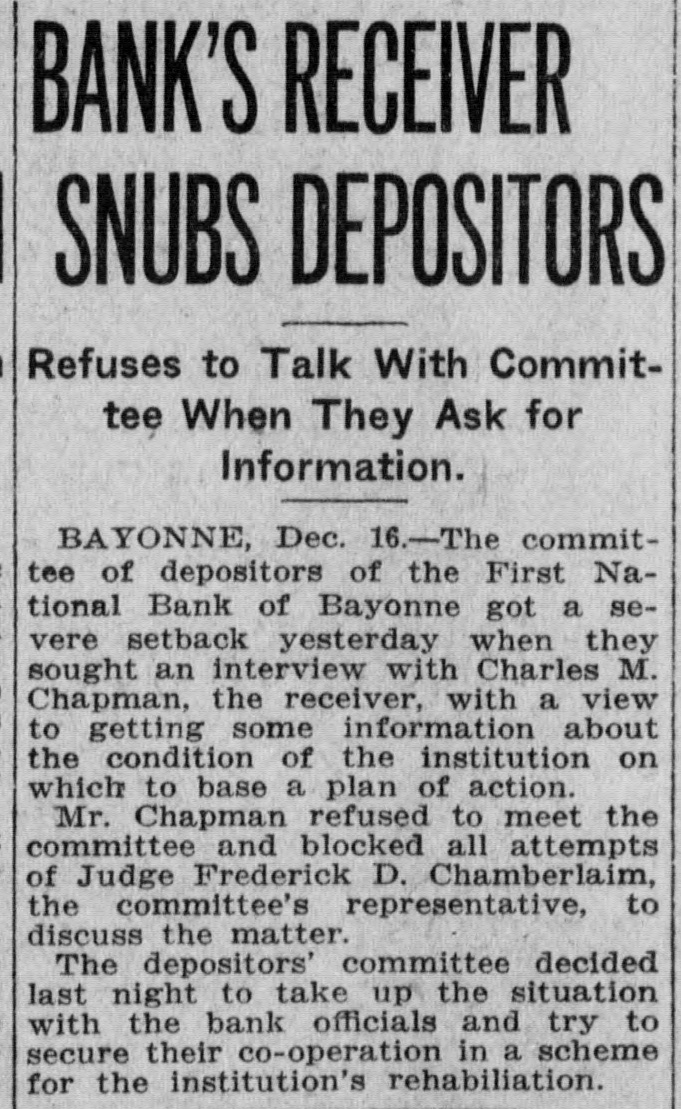 BANK'S RECEIVER SNUBS DEPOSITORS Refuses to Talk With Committee When They Ask for Information. BAYONNE, Dec. 16.-The committee of depositors of the First National Bank of Bayonne got a severe setback yesterday when they sought an interview with Charles M. Chapman, the receiver, with a view to getting some information about the condition of the institution on which to base a plan of action. Mr. Chapman refused to meet the committee and blocked all attempts of Judge Frederick D. Chamberlaim, the committee's representative, to discuss the matter. The depositors' committee decided last night to take up the situation with the bank officials and try to secure their co-operation in a scheme for the institution's rehabiliation.