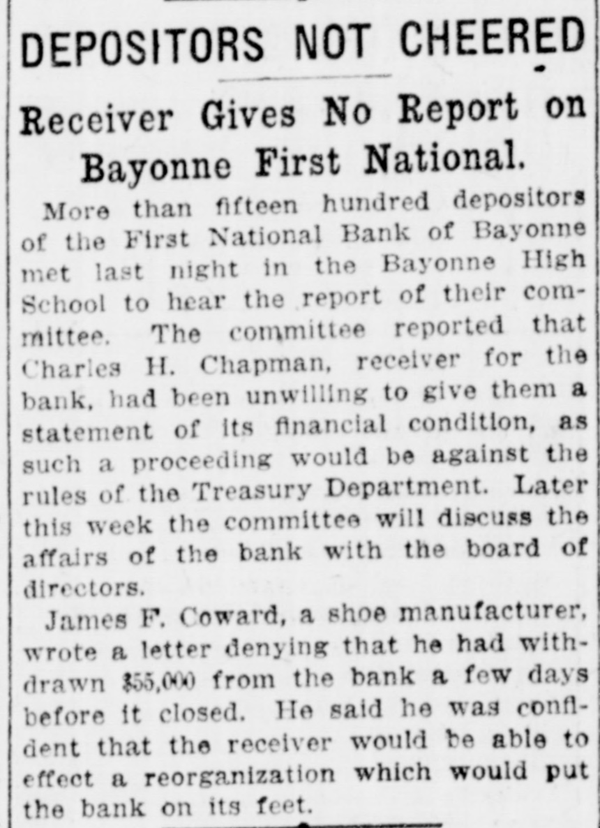 DEPOSITORS NOT CHEERED Receiver Gives No Report on Bayonne First National. More than fifteen hundred depositors of the First National Bank of Bayonne met last night in the Bayonne High School to hear the report of their committee. The committee reported that Charles H. Chapman, receiver for the bank, had been unwilling to give them a statement of its financial condition, as such a proceeding would be against the rules of the Treasury Department. Later this week the committee will discuss the affairs of the bank with the board of directors. James F. Coward, a shoe manufacturer, wrote a letter denying that he had withdrawn $55,000 from the bank a few days before it closed. He said he was confldent that the receiver would be able to effect a reorganization which would put the bank on its feet.