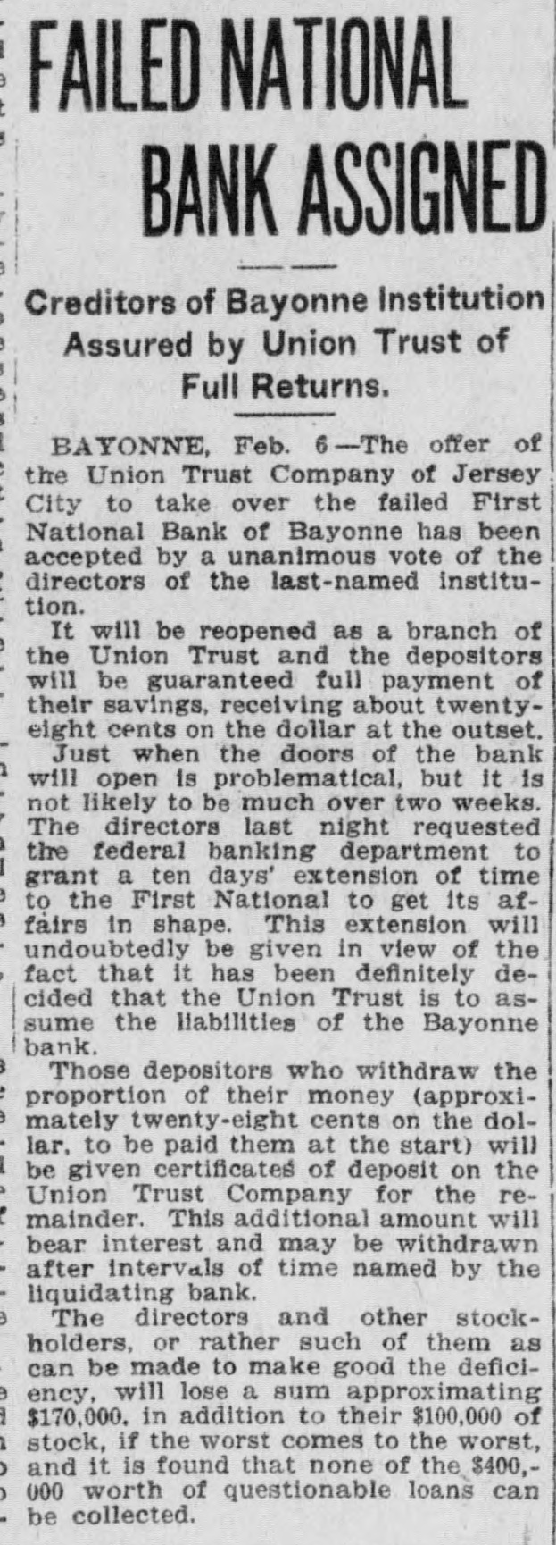 FAILED NATIONAL BANK ASSIGNED Creditors of Bayonne Institution Assured by Union Trust of Full Returns. BAYONNE, Feb. 6-The offer of the Union Trust Company of Jersey City to take over the failed First National Bank of Bayonne has been accepted by a unanimous vote of the directors of the last-named institution. It will be reopened as a branch of the Union Trust and the depositors will be guaranteed full payment of their savings, receiving about twentyeight cents on the dollar at the outset. Just when the doors of the bank will open is problematical, but it is not likely to be much over two weeks. The directors last night requested the federal banking department to grant a ten days' extension of time to the First National to get its affairs in shape. This extension will undoubtedly be given in view of the fact that it has been definitely decided that the Union Trust is to assume the liabilities of the Bayonne bank. Those depositors who withdraw the proportion of their money (approximately twenty-eight cents on the dollar, to be paid them at the start) will be given certificates of deposit on the Union Trust Company for the remainder. This additional amount will bear interest and may be withdrawn after intervals of time named by the liquidating bank. The directors and other stockholders, or rather such of them as can be made to make good the deficiency, will lose a sum approximating $170,000. in addition to their $100,000 of stock, if the worst comes to the worst, and it is found that none of the $400,000 worth of questionable loans can be collected.