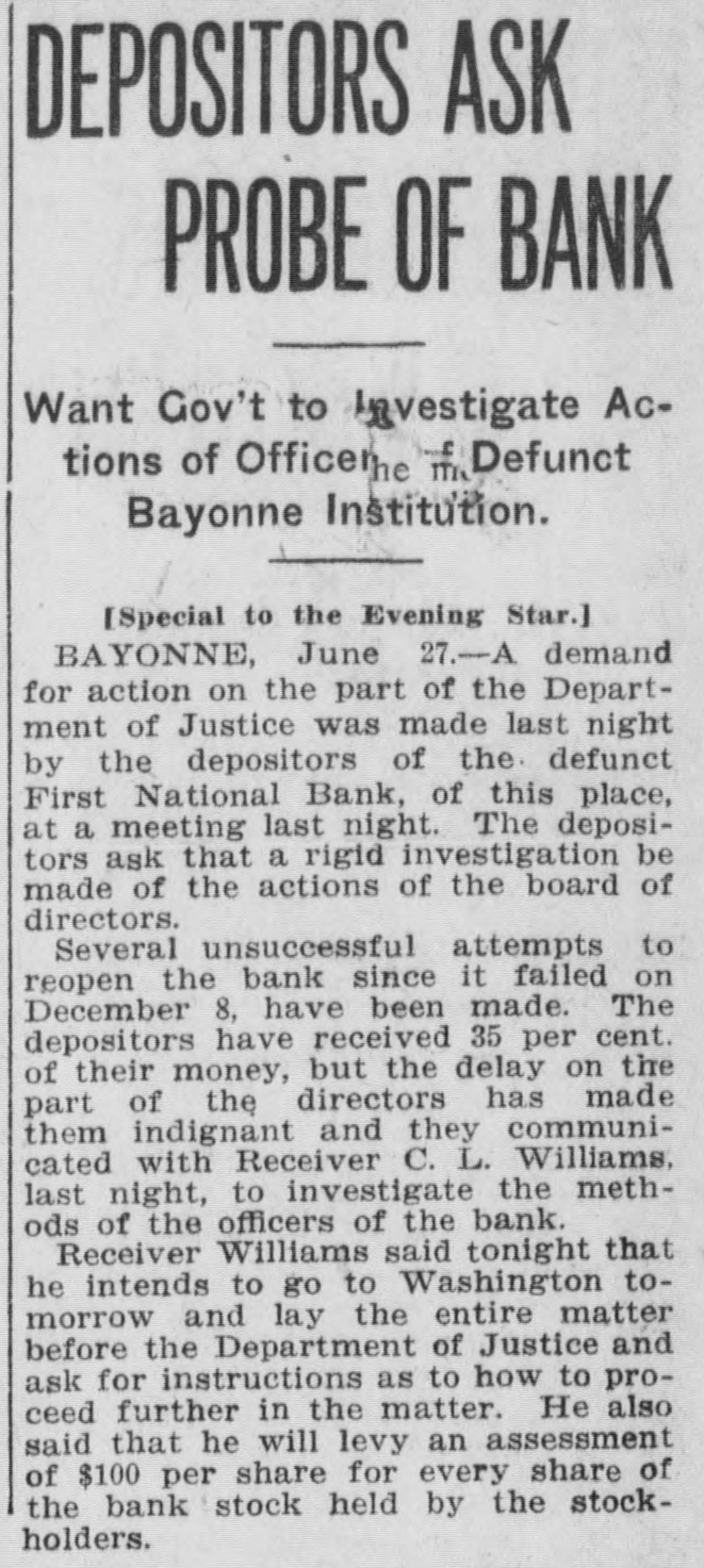 DEPOSITORS ASK PROBE OF BANK Want Gov't to Investigate Actions of Officer he m Defunct Bayonne Institution. [Special to the Evening Star.] BAYONNE, June 27.-A demand for action on the part of the Department of Justice was made last night by the depositors of the. defunct First National Bank, of this place, at a meeting last night. The depositors ask that a rigid investigation be made of the actions of the board of directors. Several unsuccessful attempts to reopen the bank since it failed on December 8, have been made. The depositors have received 35 per cent. of their money, but the delay on the part of the directors has made them indignant and they communicated with Receiver C. L. Williams, last night, to investigate the methods of the officers of the bank. Receiver Williams said tonight that he intends to go to Washington tomorrow and lay the entire matter before the Department of Justice and ask for instructions as to how to proceed further in the matter. He also said that he will levy an assessment of $100 per share for every share of the bank stock held by the stockholders.