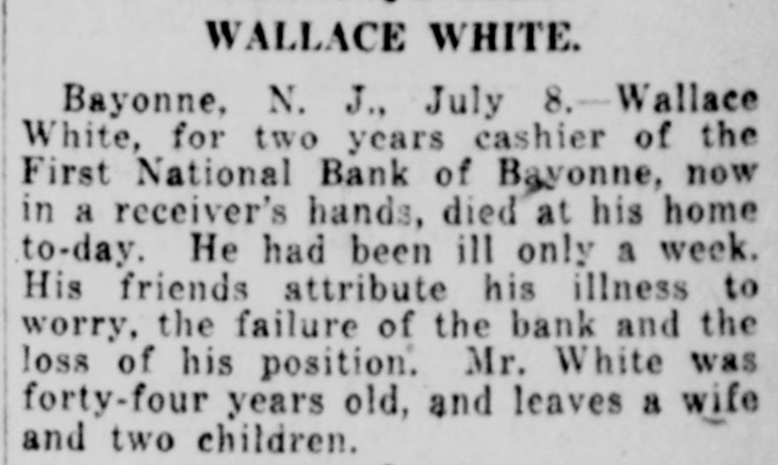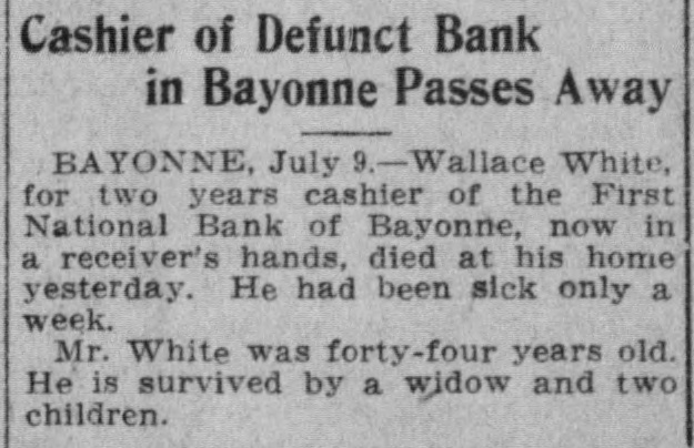 Cashier of Defunct Bank in Bayonne Passes Away BAYONNE, July 9.-Wallace White, for two years cashier of the First National Bank of Bayonne, now in a receiver's hands, died at his home yesterday. He had been sick only a week. Mr. White was forty-four years old. He is survived by a widow and two children.