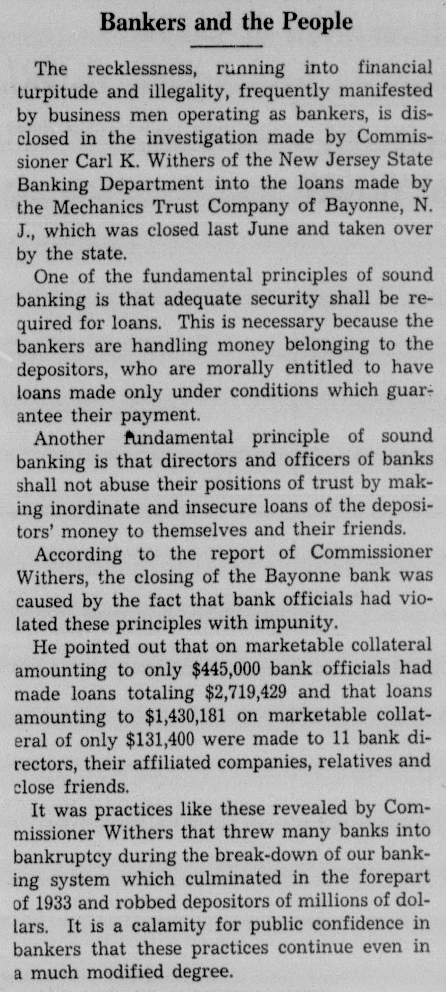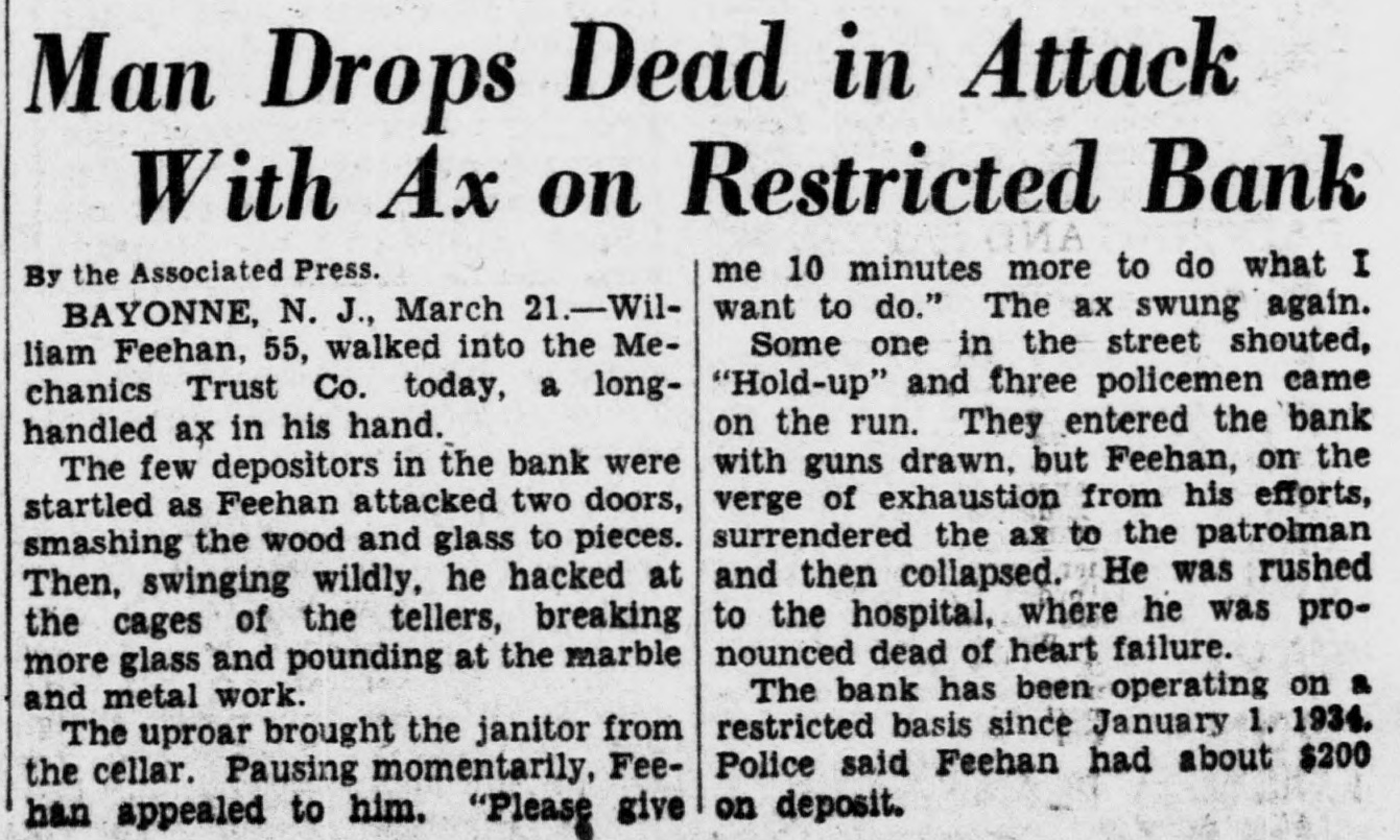 Man Drops Dead in Attack With Ax on Restricted Bank me 10 minutes more to do what I By the Associated Press. want to do." The ax swung again. BAYONNE, N. J., March 21. - WilSome one in the street shouted, liam Feehan, 55, walked into the Me"Hold-up" and three policemen came chanics Trust Co. today, a longon the run. They entered the bank handled ax in his hand. with guns drawn. but Feehan, on the The few depositors in the bank were verge of exhaustion from his efforts, startled as Feehan attacked two doors, surrendered the ax to the patrolman smashing the wood and glass to pieces. and then collapsed. He was rushed Then, swinging wildly, he hacked at to the hospital, where he was prothe cages of the tellers, breaking nounced dead of heart failure. more glass and pounding at the marble The bank has been operating on a and metal work. restricted basis since January 1. 1934. The uproar brought the janitor from Police said Feehan had about $200 the cellar. Pausing momentarily, Feeon deposit. han appealed to him. "Please give