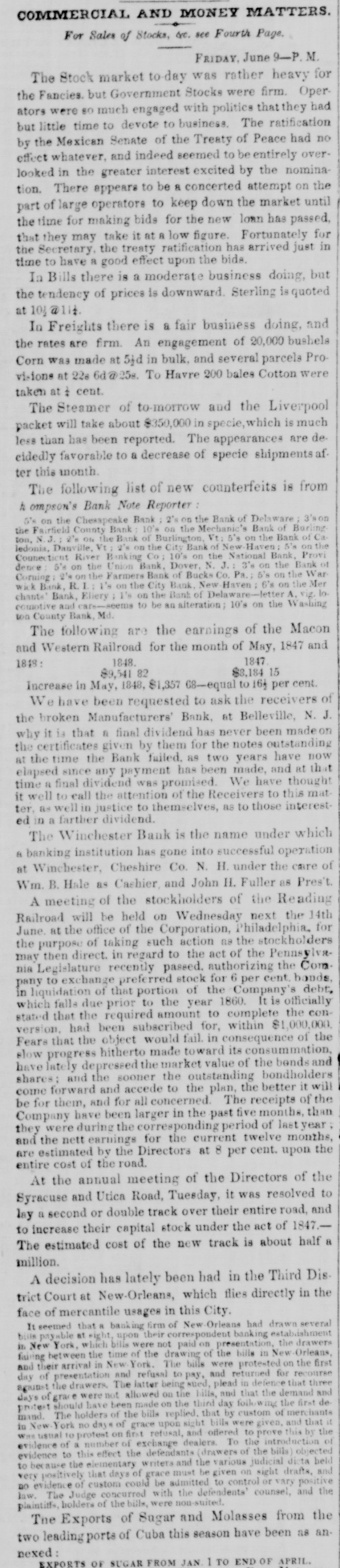 COMMERCIAL AND MONEY MATTERS. For Sales of Stocks, se. see Fourth Page. Friday,June 9-P.M. The Stock market to day was rather heavy for the Fancies. but Government Stocks were firm. Operators were so much engaged with politics that th had but little time to devote to business The ratification by the Mexican Senate of the Treaty of Peace had no effect whatever. and indeed seemed to be entirely overlooked in the greater interest excited by the nomination. There appears to be 8 concerted attempt on the part of large operators to keep down the market until betime for making bids for the new loan has passed, that they may take it at a low figure. Fortunately for the Secretary. the treaty ratification has arrived just in time to have a good effect upon the bide. In Bills there is a moderate business doing, but the tendency of prices is downward Sterling is quoted at 10/2 @111. In Freights there is a fair business doing, and the rates are firm. An engagement of 20,000 bushels Corn was made at 54d in bulk, and several parcels Provisions at 22a 6d@25s. To Havre 200 bales Cotton were taken at 1 cent. The Steamer of to-morrow and the Liverpool packet will take about $350,000 in specie, which is much less than has been reported. The appearances are deeidedly favorable to a decrease of specie shipments after this month The following list of new counterfeits is from h ompson's Bank Note Reporter 5's on the Chesspeake Bank 2's on the Bank of Delaware: 3'son the Fairfield County Bank 10's on the Mechanic's Bank of Burling ton. N.J.: 2's On the Bank of Burlington, Vt: 5's on the Bank of Ca. ledonia, Danville, Vt : 2's on the City Bank of New-Haven; 5's on the Connecticut River Banking Co : 10's on the National Bank, Provi dence 5's on the Union Bank, Dover, N.J.: 3's on the Bank of Corning 2's on the Farmers Bank of Bucks Co. Pa.: 5's on the War wick Bank, R.I.:'s on the City Bank New Haven : 6's on the Mer chants' Bank, Eliery : I's on the Bank of Delaware -letter A. vig. la comotive and cars-seems to be an alteration; 10's on the Washing too County Bank, Md. The following are the earnings of the Macon and Western Railroad for the month of May, 1847 and 1847 1848. 1848 $8,184 15 $9,541 82 Increase in May, 1848, $1,357 68-equal to 16 per cent. We have been requested to ask the receivers of the broken Manufacturers' Bank, at Belleville, N. J. why it is that a final dividend has never been made on the certificates given by them for the notes outstanding at the time the Bank failed. as two years have now elapsed since any payment has been made, and at that time a final dividend was promised. We have thought it well to call the attention of the Receivers to this mat ter. as well in justice to themselves, as to those interested in a farther dividend. The Winchester Bank is the name under which A banking institution has gone into successful operation at Winchester, Cheshire Co. N. H. under the care of Wm. B. Hale as Cashier and John H. Fuller as Pres't A meeting of the stockholders of the Reading Railroad will be held on Wednesday next the 14th June. at the office of the Corporation, Philadelphia, for the purpose of taking such action 08 the stockholders may then direct. in regard to the act of the Pennsylvania Legislature recently passed. authorizing the Com pany to exchange preferred stock for 6 per cent. bands, in liquidation of that portion of the Company's debt, which falls due prior to the year 1860. It is officially stated that the required amount to complete the conversion. had been subscribed for, within $1,000,000. Fears that the object would fail. in consequence of the slow progress hitherto made toward its consummation, have lately depressed the market value of the bends and shares: and the sooner the outstanding bondholders come forward and accede to the plan, the better it will be for them, and for all concerned. The receipts of the Company have been larger in the past five months, than they were during the corresponding period of last year and the nett earnings for the current twelve months, are estimated by the Directors at 8 per cent. upon the entire cost of the road. At the annual meeting of the Directors of the Syracuse and Utica Road, Tuesday, it was resolved to lay a second or double track over their entire road, and to increase their capital stock under the act of 1847.The estimated cost of the new track is about half a million. A decision has lately been had in the Third Dis. trict Court at New-Orleans, which flies directly in the face of mercantile usages in this City. It seemed that a banking firm of New Orleans had drawn several bills payable at eight, upon their correspondent banking estab.ishment in New York, which bills were not paid on presentation, the drawers fairing hetween the time of the drawing of the bills in New Orleans and their arrival in New York. The bills were protested on the first day of presentation and refusal to pay, and returned for recourse against the drawers. The latter being sued, plead in defence that three days of grace were not allowed on the hills, and that the demand and protest should have been made on the third day following the first de mand. The holders of the bills replied. that by custom of merchants in New-York no days of grace upon sight bills were given, and that it usual to protest on first refusal, and offered to prove this by the evidence of a number of exchange dealers. To the introduction of evidence to this effect the defendants (drawers of the bills objected to because the elementary writers and the various judicial dieta held very positively that days of grace must be given on sight drafts. and DO evidence of custom could be admitted to control or vary positive law. The Judge concurred with the defendents' counsel, and the plaintiffs, holders of the bills, were non-suited. The Exports of Sugar and Molasses from the two leading ports of Cuba this season have been as annexed: EXPORTS FROM JAN TO END OF APRIL.
