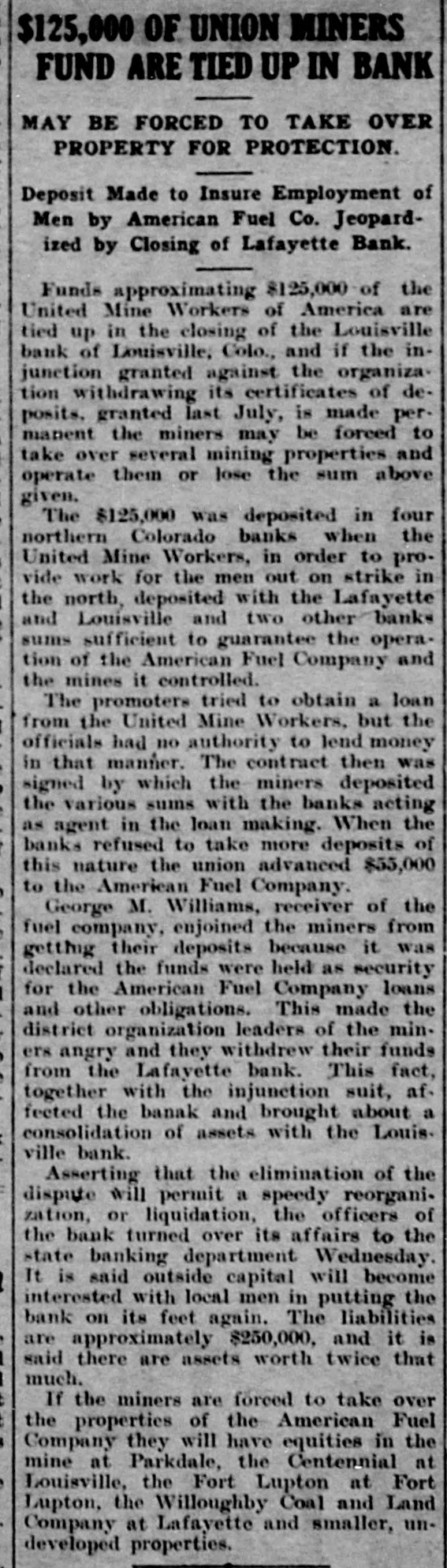 $125,000 OF UNION MINERS FUND ARE TIED UP IN BANK MAY BE FORCED TO TAKE OVER PROPERTY FOR PROTECTION. Deposit Made to Insure Employment of Men by American Fuel Co. Jeopardized by Closing of Lafayette Bank. Funds approximating $125,000 of the United Mine Workers of America are tied up in the closing of the Louisville bank of Louisville, Colo., and if the injunction granted against the organization withdrawing its certificates of deposits, granted last July, is made permanent the miners may be forced to take over several mining properties and operate them or lose the sum above given. The $125,000 was deposited in four northern Colorado banks when the United Mine Workers, in order to provide work for the men out on strike in the north, deposited with the Lafayette and Louisville and two other banks sums sufficient to guarantee the operation of the American Fuel Company and the mines it controlled. The promoters tried to obtain a loan from the United Mine Workers, but the officials had no authority to lend money in that manner. The contract then was signed by which the miners deposited the various sums with the banks acting as agent in the loan making. When the banks refused to take more deposits of this nature the union advanced $55,000 to the American Fuel Company. George M. Williams, receiver of the fuel company, enjoined the miners from getthig their deposits because it was declared the funds were held as security for the American Fuel Company loans and other obligations. This made the district organization leaders of the min. ers angry and they withdrew their funds from the Lafayette bank. This fact, together with the injunction suit, af. feeted the banak and brought about a consolidation of assets with the Louis. ville bank. Asserting that the elimination of the dispute will permit a speedy reorganization, or liquidation, the officers of the bank turned over its affairs to the state banking department Wednesday. It is said outside capital will become interested with local men in putting the bank on its feet again. The liabilities are approximately $250,000. and it is said there are assets worth twice that much. If the miners are forced to take over the properties of the American Fuel Company they will have equities in the mine at Parkdale, the Centennial at Louisville, the Fort Lupton at Fort Lupton, the Willoughby Coal and Land Company at Lafayette and smaller, undeveloped properties.