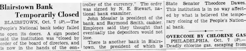 Blairstown Bank Temporarily Closed BLAIRSTOWN, Oct. 7 (P).-The People's National bank today failed to open its doors. A sign posted said the institution was "closed by order of the board of directors, and is now in the hands of the con- troller of the currency." The order was signed by N. E. Stewart, national bank examiner John Messlar is president of the bank, and Raymond Smith, cashier Employes said they thought that eventually the depositors would not lose. There is another bank in Blairstown, the president of which is State Senator Theodore Dawes. This institution is in no way affected by what is believed the temporary closing of the People's National bank. OVERCOME BY CHLORINE GAS PHILADELPHIA, Oct. (P).Deadly chlorine gas. escaping from