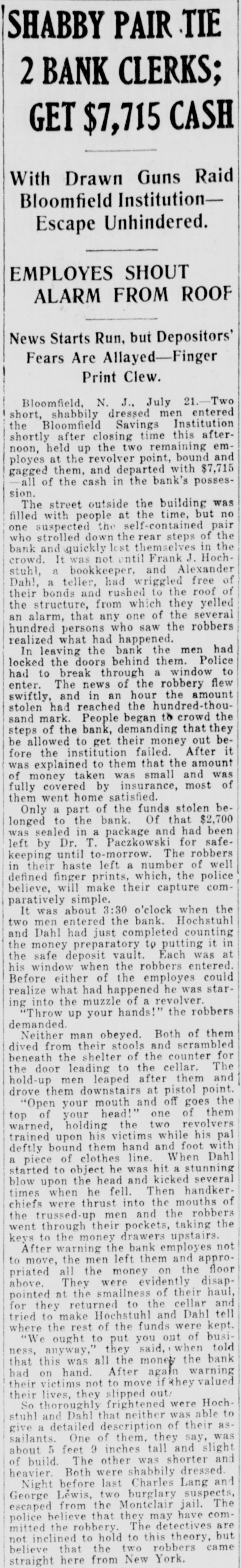 SHABBY PAIR TIE 2 BANK CLERKS; GET $7,715 CASH With Drawn Guns Raid Bloomfield InstitutionEscape Unhindered. EMPLOYES SHOUT ALARM FROM ROOF News Starts Run, but Depositors' Fears Are Allayed-Finger Print Clew. Bloomfield, N. J., July 21.-Two short, shabbily dressed men entered the Bloomfield Savings Institution shortly after closing time this afternoon, held up the two remaining employes at the revolver point, bound and gagged them, and departed with $7,715 -all of the cash in the bank's possession. The street outside the building was filled with people at the time, but no one suspected the self-contained pair who strolled down the rear steps of the bank and quickly lost themselves in the crowd. It was not until Frank J. Hochstuhl, a bookkeeper, and Alexander Dah!, a teller, had wriggled free of their bonds and rushed to the roof of the structure, from which they yelled an alarm, that any one of the several hundred persons who saw the robbers realized what had happened. In leaving the bank the men had locked the doors behind them. Police had to break through a window to enter. The news of the robbery flew swiftly, and in an hour the amount stolen had reached the hundred-thousand mark. People began to crowd the steps of the bank, demanding that they be allowed to get their money out before the institution failed. After it was explained to them that the amount of money taken was small and was fully covered by insurance, most of them went home satisfied. Only a part of the funds stolen belonged to the bank. Of that $2,700 was sealed in a package and had been left by Dr. T. Paczkowski for safekeeping until to-morrow. The robbers in their haste left a number of well defined finger prints, which, the police believe, will make their capture comparatively simple. It was about 3:30 o'clock when the two men entered the bank. Hochstuhl and Dahl had just completed counting the money preparatory to putting it in the safe deposit vault. Each was at his window when the robbers entered. Before either of the employes could realize what had happened he was staring into the muzzle of a revolver. "Throw up your hands!" the robbers demanded. Neither man obeyed. Both of them dived from their stools and scrambled beneath the shelter of the counter for the door leading to the cellar. The hold-up men leaped after them and drove them downstairs at pistol point. "Open your mouth and off goes the top of your head!" one of them warned, holding the two revolvers trained upon his victims while his pal deftly bound them hand and foot with a piece of clothes line. When Dahl started to object he was hit a stunning blow upon the head and kicked several times when he fell. Then handkerchiefs were thrust into the mouths of the trussed-up men and the robbers went through their pockets, taking the keys to the money drawers upstairs. After warning the bank employes not to move, the men left them and appropriated all the money on the floor above. They were evidently disappointed at the smallness of their haul, for they returned to the cellar and tried to make Hochstuhl and Dahl tell where the rest of the funds were kept. "We ought to put you out of business, anyway," they said, when told that this was all the money the bank had on hand. After again warning their victims not to move if they valued their lives, they slipped out: So thoroughly frightened were Hochstuhl and Dahl that neither was able to give a detailed description of their as-