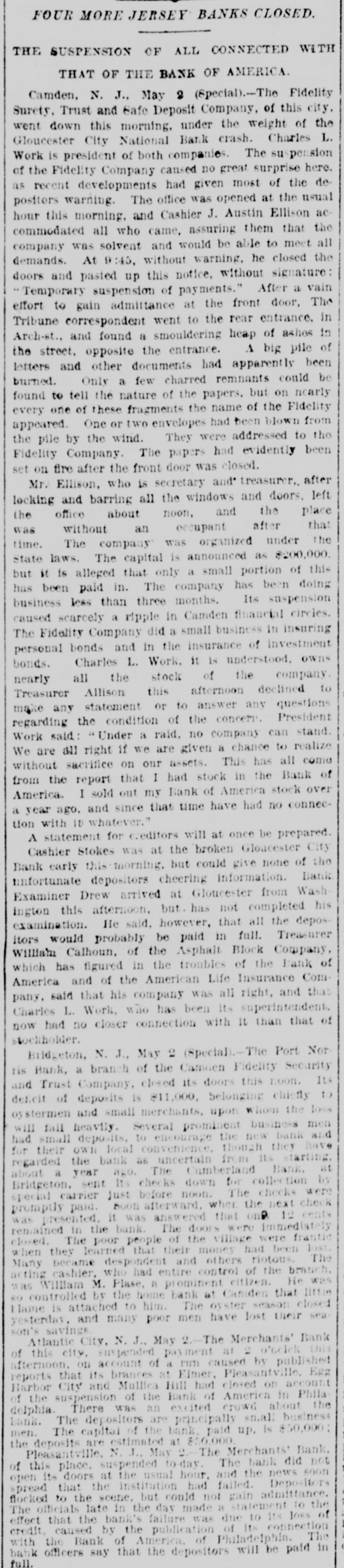 FOUR MORE JERSEY BANKS CLOSED. THE SUSPENSION OF ALL CONNECTED WITH THAT OF THE BANK OF AMERICA. Camden, N. J., May 2 (Special).-The Fidelity Surety, Trust and Safe Deposit Company, of this city, went down this morning, under the weight of the Gloucester City National Bank crash. Charles L. Work is president of both companies. The suspension of the Fidelity Company caused no great surprise here. as recent developments had given most of the depositors warning. The office was opened at the usual hour this morning, and Cashier J. Austin Ellison accommodated all who came, assuring them that the company was solvent and would be able to meet all demands. At 9:45, without warning, he closed the doors and pasted up this notice, without signature: "Temporary suspension of payments." After a vain effort to gain admittance at the front door, The Tribune correspondent went to the rear entrance, in Arch-st., and found a smouldering heap of ashes in the street, opposite the entrance. A big pile of letters and other documents had apparently been burned. Only a few charred remnants could be found to tell the nature of the papers, but on nearly every one of these fragments the name of the Fidelity appeared. One or two envelopes had been blown from the pile by the wind. They were addressed to the Fidelity Company. The papers had evidently been set on fire after the front door was closed. Mr. Ellison, who is secretary and treasurer, after locking and barring all the windows and doors, left the office about noon, and the place was without an occupant after that time. The company was organized under the State laws. The capital is announced as $200,000. but it is alleged that only a small portion of this has been paid in. The company has been doing business less than three months. Its suspension caused scarcely a ripple in Camden financial circles. The Fidelity Company did a small business in insuring personal bonds and in the insurance of investment bonds. Charles L. Work, it is understood. owns nearly all the stock of the company. Treasurer Allison this afternoon declined to make any statement or to answer any questions regarding the condition of the concern. President Work said: Under a raid, no company can stand. We are all right if we are given a chance to realize without sacrifice on our assets. This has all come from the report that I had stock in the Bank of America. I sold out my Bank of America stock over a year ago, and since that time have had no connection with it whatever." A statement for ereditors will at once be prepared. Cashier Stokes was at the broken Gloucester City Bank early this morning, but could give none of the unfortunate depositors cheering information. Bank Examiner Drew arrived at Gloucester from Wash ington this afternoon, but. has not completed his examination. He said, however, that all the depositors would probably be paid in full. Treasurer William Calhoun, of the Asphalt Block Company, which has figured in the troubles of the Bank of America and of the American Life Insurance Company, said that his company was all right, and that Charles L. Work, who has been its superintendent, now had no closer connection with it than that of stockholder. Bridgeton, N. J., May 2 (Special).-The Port Nor ris Bank, a branch of the Camden Fidelity Security and Trust Company, closed its doors this noon. Its deficit of deposits is $11,000, belonging chiefly to oystermen and small merchants, upon hom the loss will fall heavily. Several prominent business men had small deposits, to encourage the new bank and for their own local convenience, though they have regarded the bank as uncertain from its starting, about a year ago. The Cumberland Bank, at Bridgeton. sent Its checks down for collection by special carrier just before noon. The checks were promptly paid. soon afterward. when the next 12 check cents was presented, it was answered that remained in the bank. The doors were immediately closed. The poor people of the village were frantic when they learned that their money had been lost. Many became despondent and others riotous. The acting cashier, who had entire control of the branch, was William M. Plase, a prominent citizen. He was so controlled by the home bank at Caniden that little blame is attached to him. The oyster season closed yesterday, and many poor men have lost their sea son's savings Atlantic City, N. J., May 2.-The Merchants' Bank of this city, suspended payment at 2 o'oclek this afternoon. on account of a run caused by published reports that its brances at Elmer, Pleasantville, Egg Harbor City and Mullica Hill had closed on account of the suspension of the Bank of America in Phila delphia. There was an excited crowd about the bank. The depositors are principally small business men. The capital of the bank, paid up, is $50,000; the deposits are estimated at $50,000 Pleasantville, N J., May 2. The Merchants' Bank. of this place, suspended to-day. The bank did not open its doors at the usual hour, and the news soon