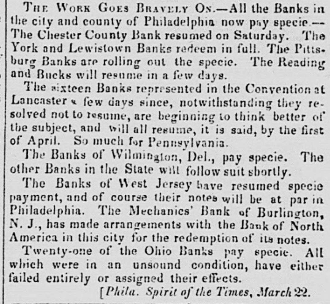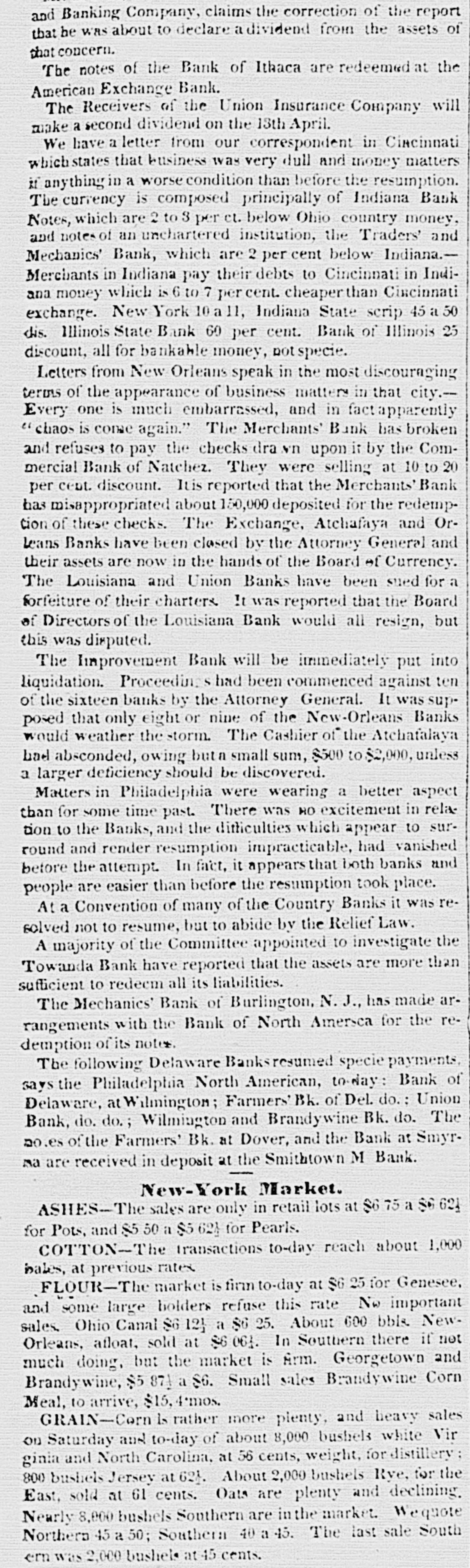 and Banking Company, claims the correction of the report that be was about to declare a dividend from the assets of that concern. The notes of the Bank of Ithaca are redeemed at the American Exchange Bank. The Receivers of the Union Insurance Company will make a second dividend on the 13th April. We have a letter from our correspondent in Cincinnati which states that business was very dull and money matters anything in a worse condition than before the resumption. The currency is composed principally of Indiana Bank Notes, which are 2 to 3 per ct. below Ohio country money, and notes of an unchartered institution, the Traders' and Mechanics' Bank, which are 2 per cent below Indiana.Merchants in Indiana pay their debts to Cincinnati in Indiana money which is 6 to 7 per cent. cheaper than Cincinnati exchange. New York 10 a 11, Indiana State scrip 45 a 50 dis. Illinois State Bank 60 per cent. Bank of Illinois 25 discount, all for bankable money, not specie. Letters from New Orleans speak in the most discouraging terms of the appearance of business matters in that city.Every one is much embarrassed, and in fact apparently "chaos is conse again." The Merchants' Bank has broken and refuses to pay the checks dra vn upon it by the Commercial Bank of Natchez. They were selling at 10 to 20 per cent. discount. Itis reported that the Merchants' Bank has misappropriated about 150,000 deposited for the redemption of these checks. The Exchange, Atchafaya and OrLeans Banks have been closed by the Attorney General and their assets are now in the hands of the Board of Currency. The Louisiana and Union Banks have been sued for a forfeiture of their charters. It was reported that the Board of Directors of the Louisiana Bank would all resign, but this was disputed. The Improvement Bank will be immediately put into liquidation. Proceedings had been commenced against ten of the sixteen banks by the Attorney General. It was supposed that only eight or nine of the New-Orleans Banks would weather the storm. The Cashier of the Atchafalaya had absconded, owing butn small sum, $500 to $2,000, unless a larger deficiency should be discovered. Matters in Philadelphia were wearing a better aspect than for some time past. There was HO excitement in relation to the Banks, and the difficulties which appear to surround and render resumption impracticable, had vanished before the attempt. In fact, it appears that both banks and people are easier than before the resumption took place. At a Convention of many of the Country Banks it was resolved not to resume, but to abide by the Relief Law. A majority of the Committee appointed to investigate the Towanda Bank have reported that the assets are more than sufficient to redeem all its liabilities. The Mechanics' Bank of Burlington, N. J., has made arrangements with the Bank of North Amersca for the redemption of its notes. The following Delaware Banksresumed specie payments, says the Philadelphia North American, to-day: Bank of Delaware, at Wilmington; Farmers' Bk. of Del. do.: Union Bank, do. do.; Wilmington and Brandywine Bk. do. The 20.08 of the Farmers' Bk. at Dover, and the Bank at Smyrna are received in deposit at the Smithtown M Bank. New-York Market. ASHES-The sales are only in retail lots at $6 75 a $6 621 for Pots, and $5.50 a $5.62 for Pearls. COTTON-The transactions to-day reach about 1,000 hales, at previous rates FLOUR-The market is firm to-day at SG 25 for Genesee. and some large holders refuse this rate No important sales. Ohio Canal $6 12} a $6 25. About 600 bbls. New. Orleans, afloat, sold at $6.061. In Southern there if not much doing. but the market is Arm. Georgetown and Brandywine, 5 871 a $6. Small sales Brandywine Corn Meal, to arrive, $15,4*mos. GRAIN-Corn is rather more plenty, and heavy sales on Saturday and to-day of about 8,000 bushels white Vir ginia and North Carolina, at 56 cents, weight, for distillery 800 bushels Jersey at 62k About 2,000 bushels Rye, for the East, sold at 61 cents. Oats are plenty and declining Nearly 8,000 bushels Southern are in the market. Wequate Northern 45 a 50; Southern 40 a 45. The last sale South ern 2,000 bushels at 45 cents.