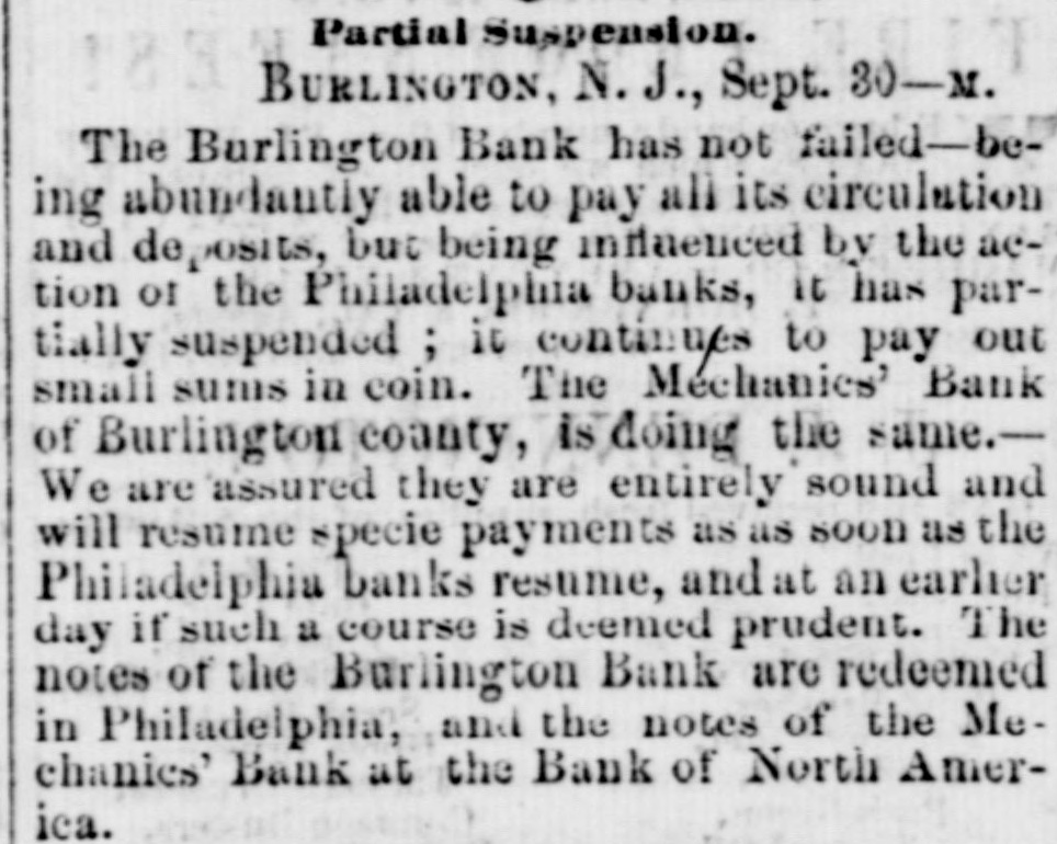 Partial Suspension. 183 BURLINGTON, N.J., Sept. 30-M. The Burlington Bank has not failed-being abundantly able to pay all its circulation and deposits, but being influenced by the action of the Philadelphia banks, it has partially suspended ; it continues to pay out small sums in coin. The Mechanics' Bank of Burlington county, is doing the same.We are assured they are entirely sound and will resume specie payments as as soon as the Philadelphia banks resume, and at an earlier day if such a course is deemed prudent. The notes of the Burlington Bank are redeemed in Philadelphia, and the notes of the Mechanics' Bank ut the Bank of North America.