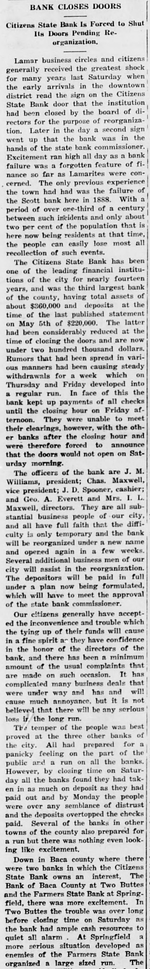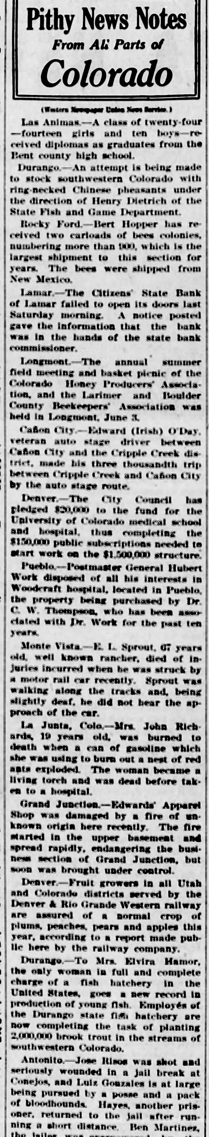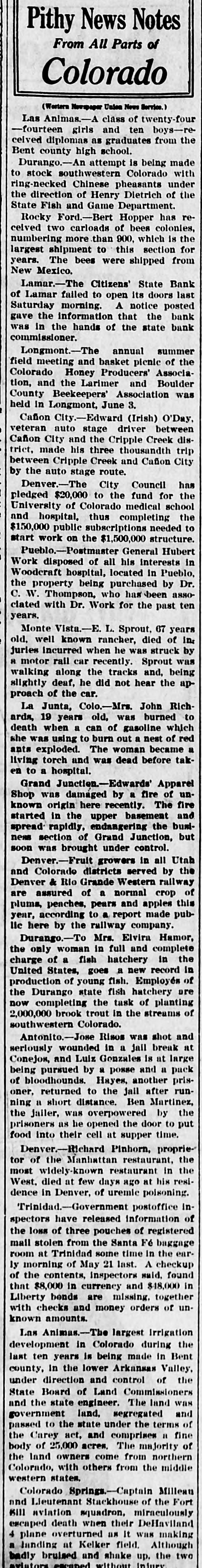 Pithy News Notes From All Parts of Colorado (Western Newspaper Union News Service.) Las Animas.-A class of twenty-four -fourteen girls and ten boys-recelved diplomas as graduates from the Bent county high school. Durango.-An attempt is being made to stock southwestern Colorado with ring-necked Chinese pheasants under the direction of Henry Dietrich of the State Fish and Game Department. Rocky Ford.-Bert Hopper has recelved two carloads of bees colonies, numbering more than 900, which is the largest shipment to this section for years. The bees were shipped from New Mexico. Lamar.-The Citizens' State Bank of Lamar failed to open its doors last Saturday morning. A notice posted gave the information that the bank was in the hands of the state bank commissioner. Longmont.-The annual summer field meeting and basket pienic of the Colorado Honey Producers' Association, and the Larimer and Boulder County Beekeepers' Association was held in Longmont, June 3. Cafion City.-Edward (Irish) O'Day, veteran auto stage driver between Cafion City and the Cripple Creek district, made his three thousandth trip between Cripple Creek and Cafion City by the auto stage route. Denver.-The City Council has pledged $20,000 to the fund for the University of Colorado medical school and hospital, thus completing the $150,000 public subscriptions needed to start work on the $1,500,000 structure. Pueblo.-Postmuster General Hubert Work disposed of all his interests in Woodcraft hospital, located in Pueblo, the property being purchased by Dr. C. W. Thompson, who has been assoclated with Dr. Work for the past ten years. Monte Vista.-E. L. Sprout, 67 years old, well known rancher, died of in. juries incurred when he was struck by H motor rail car recently. Sprout was walking along the tracks and, being slightly deaf, he did not hear the approach of the car. La Junta, Colo.-Mrs. John Richards, 19 years old, was burned to death when a can of gasoline which she was using to burn out a nest of red ants exploded. The woman became a living torch and was dead before taken to a hospital. Grand Junction.-Edwards' Apparel Shop was damaged by a fire of unknown origin here recently. The fire started in the upper basement and spread rapidly, endangering the business section of Grand Junction, but soon was brought under control. Denver.-Fruit growers in all Utah and Colorado districts served by the Denver & Rio Grande Western railway are assured of a normal crop of plums, peaches, pears and apples this year, according to a report made public here by the railway company. Durango.-To Mrs. Elvira Hamor, the only woman in full and complete charge of a fish hatchery in the United States, goes a new record in production of young fish. Employes of the Durango state fish hatchery are now completing the task of planting 2,000,000 brook trout in the streams of southwestern Colorado. Antonito.-Jose Risos was shot and seriously wounded in a jail break at Conejos, and Luiz Gonzales is at large being pursued by a posse and a pack of bloodhounds. Hayes, another prisoner, returned to the jall after running a short distance. Ben Martinez, the Jailer, was overpowered by the prisoners as he opened the door to put food into their cell at supper time. Denver.-Richard Pinhorn, proprietor of the Manhattan restaurant, the most widely-known restaurant in the West, died at few days ago at his residence in Denver, of uremic poisoning. Trinidad-Government postoffice Inspectors have released information of the loss of three pouches of registered mail stolen from the Santa Fé baggage room at Trinidad some time In the early morning of May 21 last. A checkup of the contents, Inspectors said, found that $8,000 in currency and $48,000 in Liberty bonds are missing. together with checks and money orders of unknown amounts. Las Animas.-The largest Irrigation development in Colorado during the last ten years is being made in Bent county, In the lower Arkansas Valley, under direction and control of the State Board of Land Commissioners and the state engineer. The land was government land, segregated and passed to the state under the terms of the Carey act, and comprises " fine body of 25.000 acres. The majority of