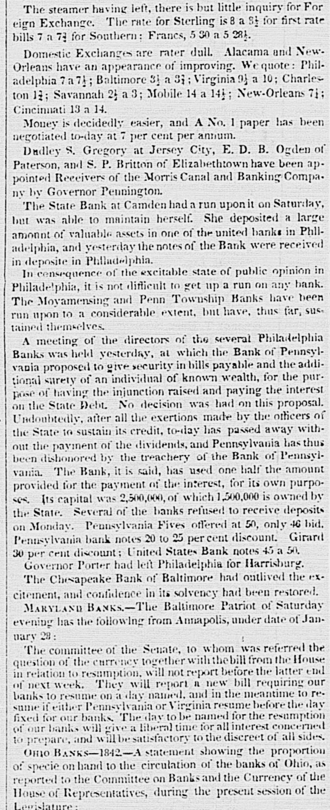 The steamer having left, there is but little inquiry for For eign Exchange. The rate for Sterling is 8 a St for first rate bills 7 a 73 for Southern: Francs, 5 30 a 5 281. Domestic Exchanges are rater dull. Alacama and New. Orleans have an appearance of improving. We quote: Philadelphia 7a7t; Baltimore 3) a 31; Virginia 9} a 10; Charles ton 12; Savannah 2) a 3; Mobile 14 a 14); New-Orleans 71; Cincinnati 13 a 14. Money is decidedly easier, and A No. 1 paper has been negotiated to-day at 7 per cent per annum. Dadley S. Gregory at Jersey City, E. D. B. Ogden of Paterson, and S. P. Britton of Elizabethtown have been appointed Receivers of the Morris Canal and Banking Compa. ny by Governor Pennington. The State Bank at Camden had a run upon it on Saturday, but was able to maintain herself. She deposited a large amonnt of valuable assets in one of the united banks in Phliadelphia, and yesterday the notes of the Bank were received in deposite in Philadelphia. In consequence of the excitable state of public opinion in Philadelphia, it is not difficult to get up a run on any bank. The Moyamensing and Penn Township Banks have been run upon to a considerable extent, but have, thus far, sustained themselves. A meeting of the directors of the several Philadelphia Banks was held yesterday, at which the Bank of Pennsylvania proposed to give security in bills payable and the additional sarety of an individual of known wealth, for the purpose of having the injunction raised and paying the interest on the State Debt. No decision was had on this proposal. Undoubtedly, after all the exertions made by the officers of the State in sustain its credit, to-day has passed away without the payment of the dividends, and Pennsylvania has thus been dishonored by the treachery of the Bank of Pennsylvania. The Bank, it is said, has used one half the amount provided for the payment of the interest, for its own purposes. Its capital was 2,500,000, of which 1,500,000 is owned by the State. Several of the banks refused to receive deposits on Monday. Pennsylvania Fives offered at 50, only 46 bid. Pennsylvania bank notes 20 to 25 per cent discount. Girard 30 per cent discount: United States Bank notes 45 a 50. Governor Porter had left Philadelphia for Harrisburg. The Chesapeake Bank of Baltimore had outlived the excitement, and confidence in its solvency had been restored. MARYLAND BANKS.-The Baltimore Patriot of Saturday evening has the following from Annapolis, under date of January 28: The committee of the Senate, to whom was referred the question of the currency together with the bill from the House in relation to resumption, will not report before the latter end of next week. They will report n new bill requiring our banks to resume on a day named. and in the meantime to resume if either Pennsylvania or Virginia resume before the day fixed for our banks. The day to be named for the resumption of our banks will give a liberal time for all interest concerned to prepare, and will be satisfactory to the discreet of all sides. OHIO BANKS-1842-A statement showing the proportion of specie on hand to the circulation of the banks of Ohio, as reported to the Committee on Banks and the Currency of the House of Representatives, during the present session of the