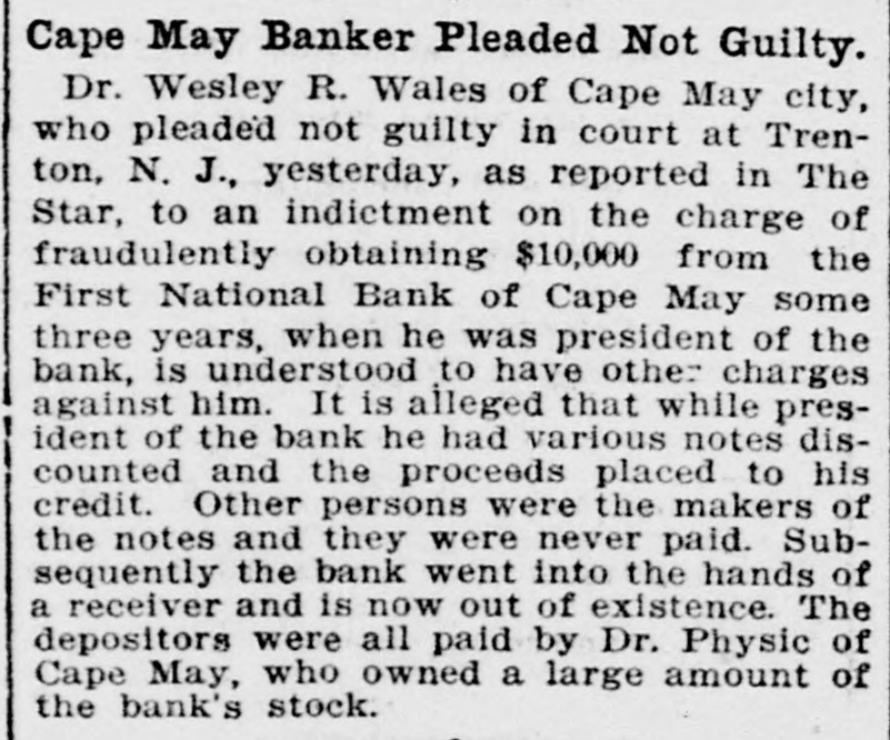 # Cape May Banker Pleaded Not Guilty. Dr. Wesley R. Wales of Cape May city, who pleaded not guilty in court at Trenton, N. J., yesterday, as reported in The Star, to an indictment on the charge of fraudulently obtaining $10,000 from the First National Bank of Cape May some three years, when he was president of the bank, is understood to have other charges against him. It is alleged that while president of the bank he had various notes discounted and the proceeds placed to his credit. Other persons were the makers of the notes and they were never paid. Subsequently the bank went into the hands of a receiver and is now out of existence. The depositors were all paid by Dr. Physic of Cape May, who owned a large amount of the bank's stock.