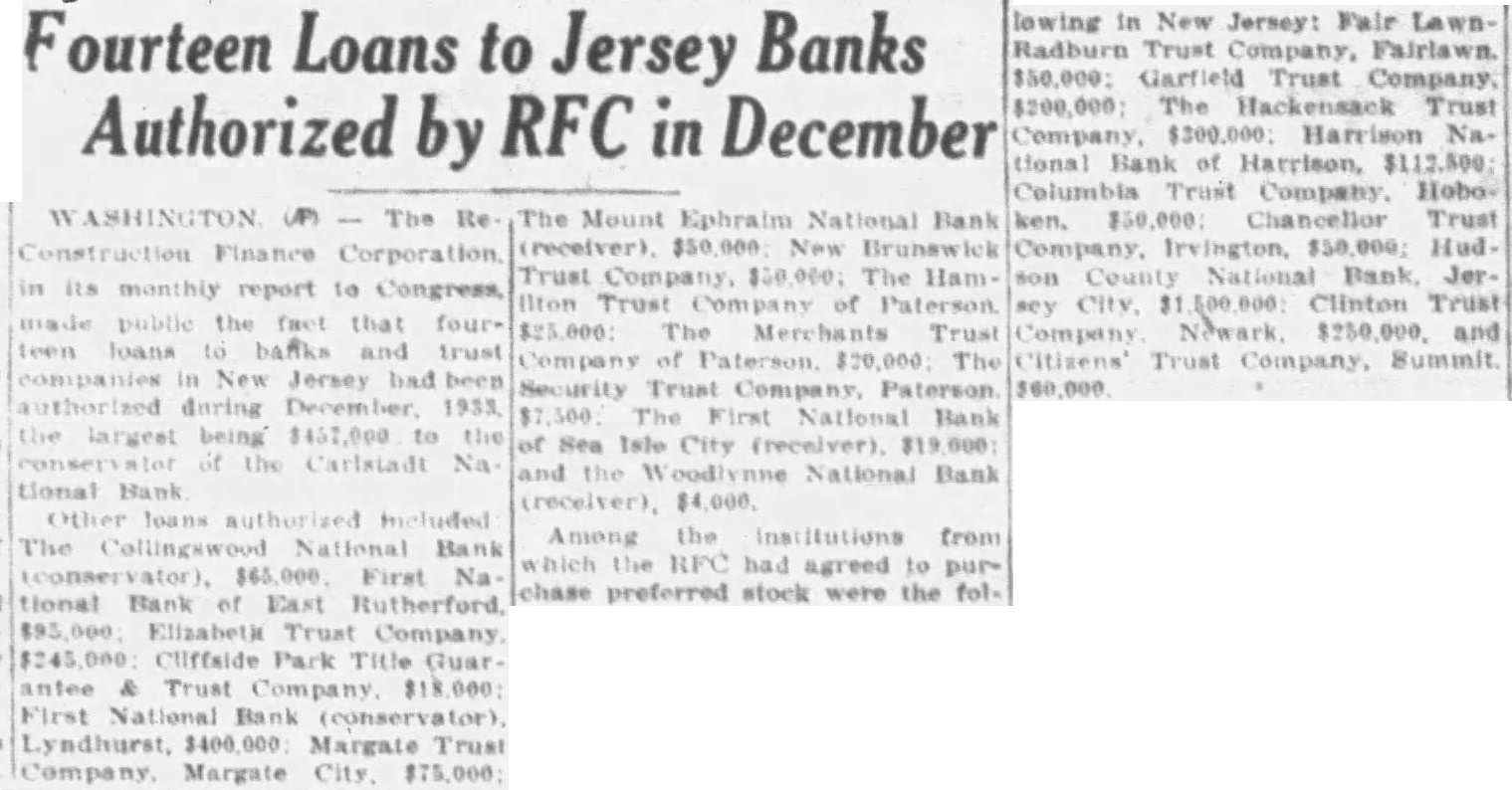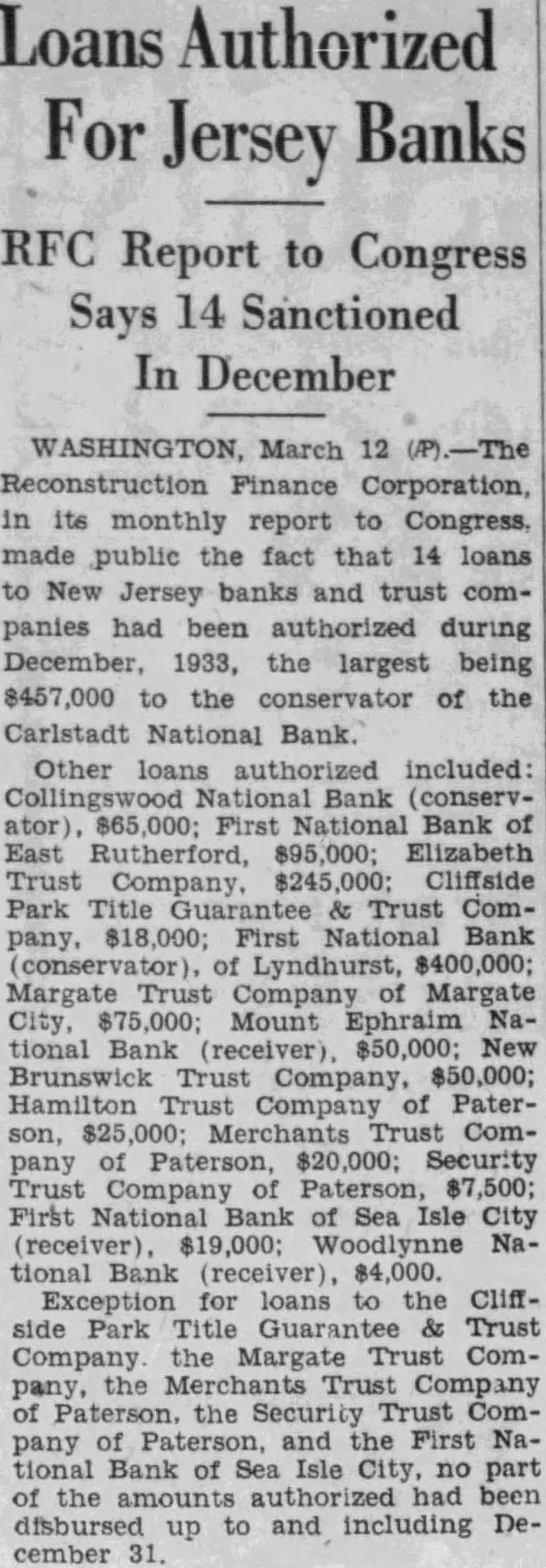 Loans Authorized For Jersey Banks RFC Report to Congress Says 14 Sanctioned In December WASHINGTON, March 12 (P).-The Reconstruction Finance Corporation, in its monthly report to Congress, made public the fact that 14 loans to New Jersey banks and trust companies had been authorized during December, 1933, the largest being $457,000 to the conservator of the Carlstadt National Bank. Other loans authorized included: Collingswood National Bank (conservator), $65,000; First National Bank of East Rutherford, $95,000; Elizabeth Trust Company, $245,000: Cliffside Park Title Guarantee Trust Company, $18,000; First National Bank (conservator), of Lyndhurst, $400,000; Margate Trust Company of Margate City, $75,000; Mount Ephraim National Bank (receiver), $50,000; New Brunswick Trust Company, $50,000; Hamilton Trust Company of Paterson, $25,000; Merchants Trust Company of Paterson, $20,000; Security Trust Company of Paterson, $7,500; First National Bank of Sea Isle City (receiver) $19,000; Woodlynne National Bank (receiver), $4,000. Exception for loans to the CliffPark Title Guarantee & Trust Company the Margate Trust Company, the Merchants Trust Company of Paterson. the Security Trust Company of Paterson, and the First National Bank of Sea Isle City, no part of the had been disbursed up to and including December 31.