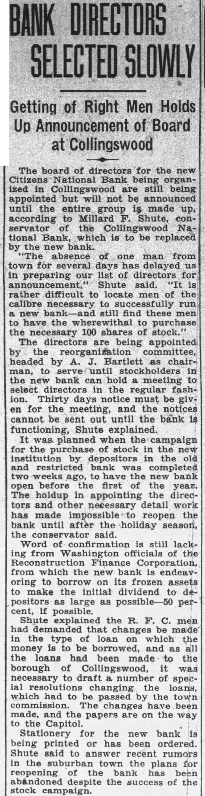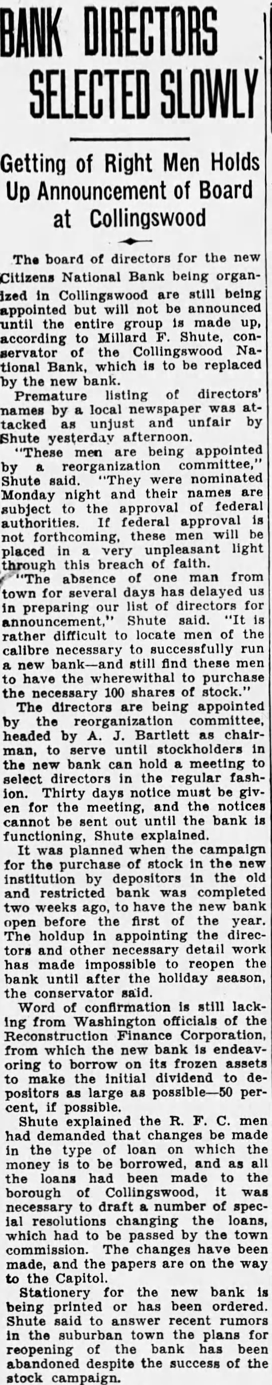BANK DIRECTORS SELECTED SLOWLY Getting of Right Men Holds Up Announcement of Board at Collingswood The board of directors for the National Bank being organized in Collingswood still being will not be announced until the entire group is made up, according to Millard Shute, conservator of the Collingswood National Bank, which is to be replaced by the absence of one man from town for several days delayed us in preparing our list of directors for announcement, Shute said. rather difficult to locate men of the calibre necessary to run new find these to have the the necessary 100 shares stock. The directors are being appointed the committee, headed by Bartlett as chairman, stockholders the bank can hold meeting select the regular ion. Thirty must be given for the meeting, and the notices cannot out until the bank is functioning, Shute explained. It planned when the campaign for the purchase of stock in the new institution by depositors the old and restricted completed the new bank open before first the year. The holdup in appointing the directors and other necessary detail work has made impossible reopen the bank until after the holiday season, the said. Word confirmation is still lacking from Washington from the new endeavoring to on its frozen assets to make the initial dividend to depositors as possible- percent, if possible. Shute explained the R. F. men had demanded changes be in the type loan on which the be the loans had been made to the borough of Collingswood, it was necessary draft number special resolutions changing the loans, which had to be passed by the town commission. The changes been made, and the papers on the way the Capitol. Stationery for the new bank is being printed has been ordered. Shute said answer recent rumors in the town the plans for reopening the bank has been abandoned despite the success of the stock campaign.
