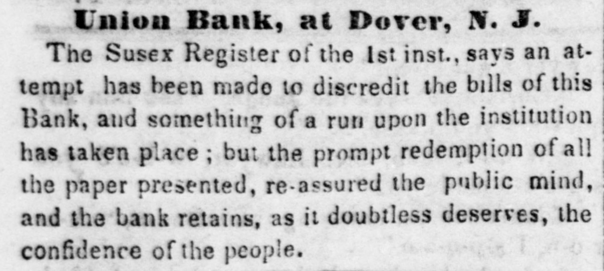 Union Bank, at Dover, N. J. The Susex Register of the 1st inst., says an attempt has been made to discredit the bills of this Bank, and something of a run upon the institution has taken place ; but the prompt redemption of all the paper presented, re-assured the public mind, and the bank retains, as it doubtless deserves, the confidence of the people.