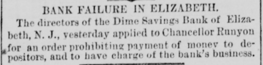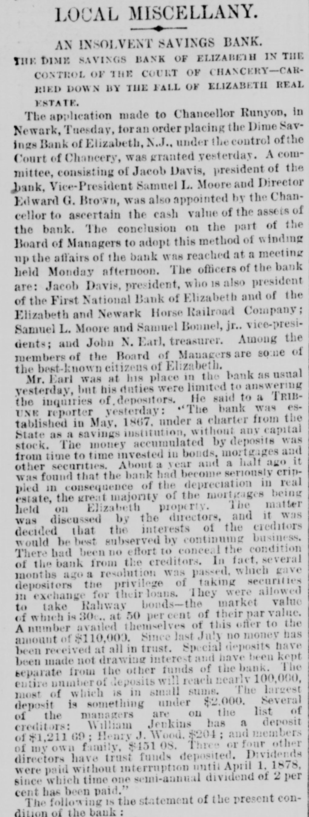 LOCAL MISCELLANY. AN INSOLVENT SAVINGS BANK. THE DIME SAVINGS BANK OF ELIZABETH IN THE CONTROL OF THE COURT OF CHANCERY-CARRIED DOWN BY THE FALL OF ELIZABETH REAL ESTATE. The application made to Chancellor Runyon, in Newark, Tuesday, foran order placing the Dime Savings Bank of Elizabeth, N.J., under the control of the Court of Chancery, was granted yesterday. A committee, consisting of Jacob Davis, president of the bank, Vice-President Samuel L. Moore and Director Edward G. Brown, was also appointed by the Chancellor to ascertain the cash value of the assets of the bank. The conclusion on the part of the Board of Managers to adopt this method of winding up the affairs of the bank was reached at a meeting held Monday afternoon. The officers of the bank are: Jacob Davis, president, who 18 also president of the First National Bank of Elizabeth and of the Elizabeth and Newark Horse Railroad Company; Samuel L. Moore and Samuel Bonnel, jr.. vice-presidents; and John N. Earl, treasurer. Among the members of the Board of Managers are some of the best-known citizens of Elizabeth. Mr. Earl was at his place in the bank as usual yesterday, but his duties were limited to answering the inquiries of depositors. He said to a TRIBUNE reporter yesterday: "The bank was established in May, 1867, under a charter from the State as a savings institution, without any capital stock. The money accumulated by deposits was from time to time invested in bonds, mortgages and other securities. About a year and a half ago it was found that the bank had become seriously crippied in consequence of the depreciation in real estate, the great majority of the mortgages being held on Elizabeth property. The matter was discussed by the directors, and it was decided that the interests of the creditors would be best subserved by continuing business. There had been no effort to conceal the condition of the bank from the creditors. In fact, several months ago a resolution was passed, which gave depositors the privilege of taking securities in exchange for their loans. They were allowed to take Rahway bonds-the market value of which is 30c., at 50 per cent of their par value. A number availed themselves of this offer to the amount of $110,000. Since last July no money has been received at all in trust. Special deposits have been made not drawing interest and have been kept separate from the other funds of the bank. The entire number of deposits will reach nearly 100,000, most of which is in small sums. The largest deposit is something under $2,000. Several of the managers are on the list of creditors: William Jeukins has a deposit of $1,211.69; Henry J. Wood. $204; and members of my own family, $451 08. Three or four other directors have trust funds deposited. Dividends were paid without interruption intil April 1, 1878, since which time one semi-annual dividend of 2 per cent has been paid." The following IS the statement of the present condition of the bank: