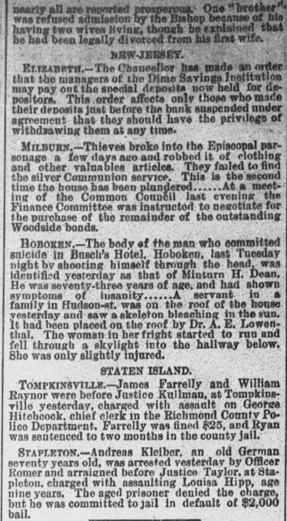 nearly all are reported prosperous. One "brother" was refused admission by the Bishop because of his having two wives living, though be explained that be had been legally divorced from his first wife. NEW-JERSEY. ELIZABETH.-The Chancellor has made an order that the managers of the Dime Savings Institution may pay out the special deposita now held for depositors. This order affects only those who made their deposits just before the bank suspended under agreement that they should have the privilegs of withdsawing them at any time. MILBURN.-Thieves broke into the Episcopal parsonage a few days age and robbed it of clothing and other valuables articles. They failed to find the silver Communion service. This is the second At a meettime the house has been plundered ing of the Common Council last evening the Finance Committee was instructed to negotiate for the purchase of the remainder of the outstanding Woodside bonds. HOBOKEN.-The body of the man who committed suicide in Busch's Hotel, Hoboken, last Tuesday night by shooting himself through the head, was identified yesterday as that of Minturn H. Dean. He was seventy-three years of age, and had shown symptoms of insanity servant in a family in Hudson-st. was on the roof of the house vesterday and saw a skeleton bleaching in the sun. It had been placed on the roof by Dr. A. E. Lowenthal. The woman in her fright started to run and fell through a skvlight into the hallway below. She was only slightly injured. STATEN ISLAND. TOMPKINSVILLE.-James Farrelly and William Raynor were before Justice Kullman, at Tompkinsville yesterday, charged with assault on George Hitchcock. chief clerk in the Richmond County Police Department. Farrelly was fined $25, and Ryan was sentenced to two months in the county jail. STAPLETON.-Andreas Kleiber, an old German seventy years old, was arrested vesterday by Officer Romer and arraigned before Justice Taylor, at Stapleton. charged with assaulting Louisa Hipp, age nine years. The aged prisoner denied the charge, but he was committed to jail in default of $2,000 bail.