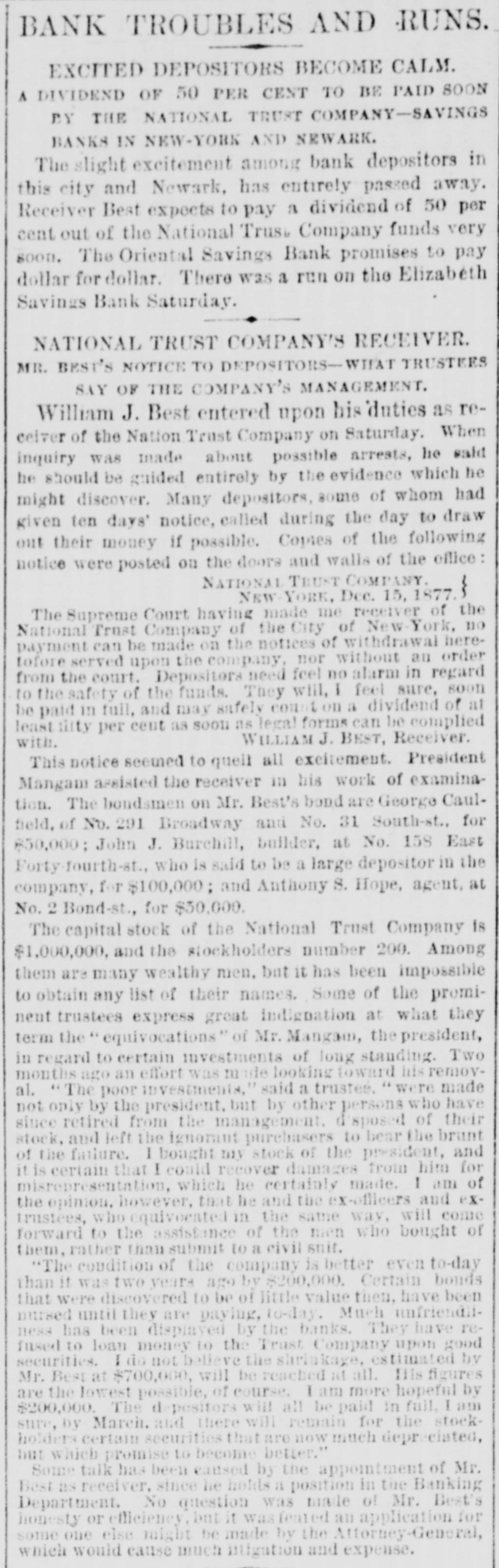 BANK TROUBLES AND RUNS. EXCITED DEPOSITORS BECOME CALM. A DIVIDEND OF 50 PER CENT TO BE PAID SOON BY THE NATIONAL TRUST COMPANY-SAVINGS BANKS IN NEW-YORK AND newark. The slight excitement among bank depositors in this city and Newark, has entirely passed away. Receiver Best expects to pay a dividend of 50 per cent out of the National Trust Company funds very soon. The Oriental Savings Bank promises to pay dollar for dollar. There was a run on the Elizabeth Savings Bank Saturday. NATIONAL TRUST COMPANY'S RECEIVER. MR. BEST'S NOTICE TO DEPOSITORS-WHAT TRUSTEES SAY OF THE COMPANY'S management. William J. Best entered upon his duties as receiver of the Nation Trust Company on Saturday. When inquiry was made about possible arrests, he said he should be guided entirely by the evidence which he might discover. Many depositors, some of whom had given ten days' notice, called during the day to draw out their money if possible. Copies of the following notice were posted on the doors and walls of the office: NATIONAL TRUST COMPANY. NEW YORK, Dec. 15, 1877. } The Supreme Court having made me receiver of the National Trust Company of the City of New York, no payment can be made on the notices of withdrawal heretofore served upon the company, nor without an order from the court. Depositors need feel no alarm in regard to the safety of the funds. They will, I feel sure, soon be paid in full, and may safely com on a dividend of at least fifty per cent as soon as legal forms can be complied WILLIAM J. BEST, Receiver. with. This notice seemed to quell all excitement. President Mangam assisted the receiver in his work of examination. The bondsmen on Mr. Best's bond are George Caulfield, of No. 291 Broadway and No. 31 South-st., for $50,000; John J. Burchill, builder, at No. 158 East Forty fourth-st., who is said to be a large depositor in the company, for $100,000; and Anthony S. Hope, agent, at No. 2 Bond-st., for $50,000. The capital stock of the National Trust Company is $1,000,000, and the stockholders number 200. Among them are many wealthy men, but it has been impossible to obtain any list of their names. Some of the prominent trustees express great indignation at what they term the" equivocations" of Mr. Mangam, the president, in regard to certain investments of long standing. Two months ago an effort was made looking toward his removal. The poor investments," said a trusteé. were made not only by the president, but by other persons who have since retired from the management, a sposed of their stock, and left the ignorant purchasers to bear the brunt of the failure. I bought my stock of the president, and it is certain that I could recover damages from him for misrepresentation, which he certainly made. I am of the opinion, however, that he and the ex-officers and extrustees, who equivocated in the same way, will come forward to the assistance of the men who bought of them, rather than submit to a civil snit. "The condition of the company is better even to-day than it was two years ago by $200,000. Certain bonds that were discovered to be of little value then, have been nursed until they are paying, to-day. Much unfriendliness has been displayed by the banks. They have refused to loan money to the Trust Company upon good securities. Ido not believe the shrinkage, estimated by Mr. Best at $700,000, will be reached at all. Ills figures are the lowest possible, of course. I am more hopeful by $200,000. The d positors will all be paid in full, I am sure, by March. and there will remain for the stockholders certain securities that are now much depr clated, but which promise to become better." Some talk has been eaused by the appointment of Mr. Best as receiver, since ne holds a position in the Banking Department. No question was made of Mr. Best's honesty or efficiency but it was feared an application for some one else might be made by the Attorney-General, which would cause much litigation and expense.