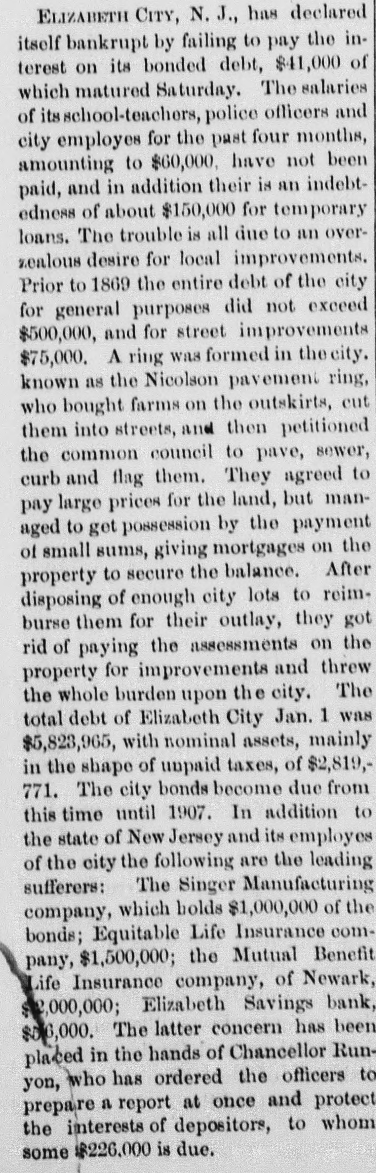 ELIZABETH CITY, N. J., has declared itself bankrupt by failing to pay the interest on its bonded debt, $41,000 of which matured Saturday. The salaries of its school-teachers, police officers and city employes for the past four months, amounting to $60,000, have not been paid, and in addition their is an indebtedness of about $150,000 for temporary loans. The trouble is all due to an overzealous desire for local improvements. Prior to 1869 the entire debt of the city for general purposes did not exceed $500,000, and for street improvements $75,000. A ring was formed in the city. known as the Nicolson pavement ring, who bought farms on the outskirts, cut them into streets, and then petitioned the common council to pave, sewer, curb and flag them. They agreed to pay large prices for the land, but managed to get possession by the payment of small sums, giving mortgages on the property to secure the balance. After disposing of enough city lots to reimburse them for their outlay, they got rid of paying the assessments on the property for improvements and threw the whole burden upon the city. The total debt of Elizabeth City Jan. 1 was $5,823,965, with nominal assets, mainly in the shape of unpaid taxes, of $2,819,771. The city bonds become due from this time until 1907. In addition to the state of New Jersey and its employes of the city the following are the leading sufferers: The Singer Manufacturing company, which holds $1,000,000 of the bonds; Equitable Life Insurance company, $1,500,000; the Mutual Benefit Life Insurance company, of Newark, $ 2,000,000; Elizabeth Savings bank, $56,000. The latter concern has been placed in the hands of Chancellor Runyon, who has ordered the officers to prepare a report at once and protect the interests of depositors, to whom some $226,000 is due.