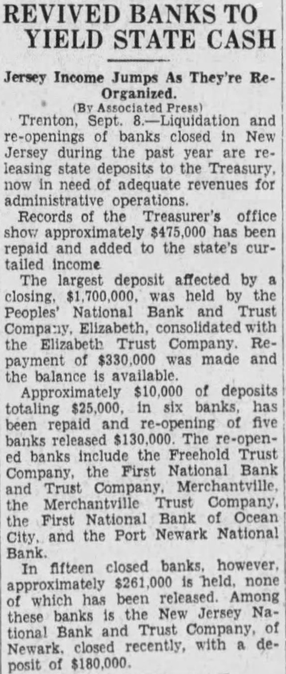 REVIVED BANKS TO YIELD STATE CASH Jersey Income Jumps As They're ReOrganized. re-openings banks closed in New Jersey during the past year are leasing state the Treasury need adequate revenues for Records of the Treasurer's office has repaid and added to the state's curtailed income The largest deposit affected by closing. held by the Peoples' National Bank and Trust the Elizabeth Trust Company. Reof $330,000 made and payment the balance Approximately $10,000 of deposits totaling in repaid of five banks released The re-openbanks the Freehold Trust First National Bank Merchantville Trust First National Bank Ocean City, the Port Newark National In fifteen closed banks however none which been Among Jersey Nabanks Bank and Trust Company, tional Newark. closed recently, with deposit of $180,000.