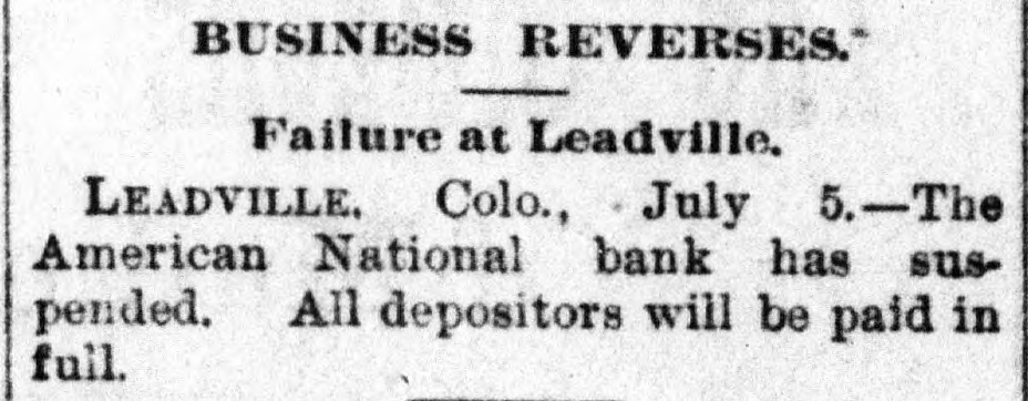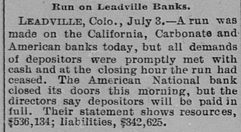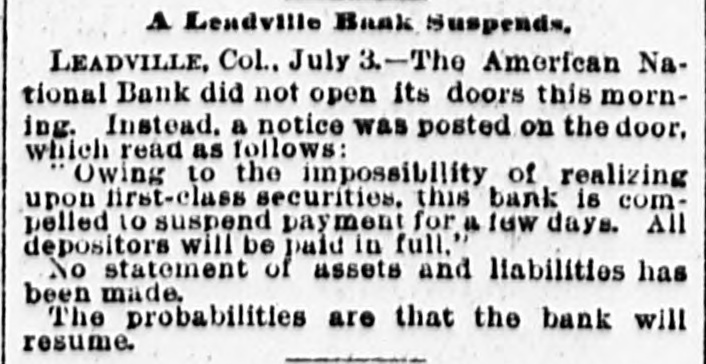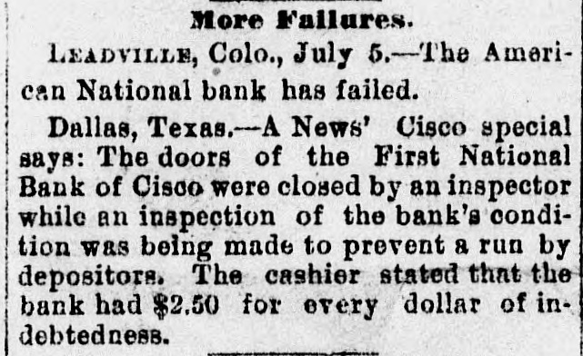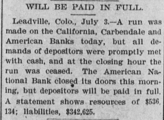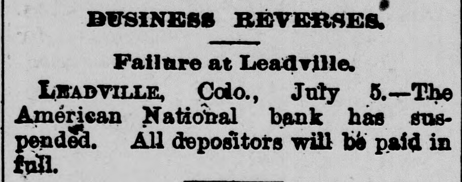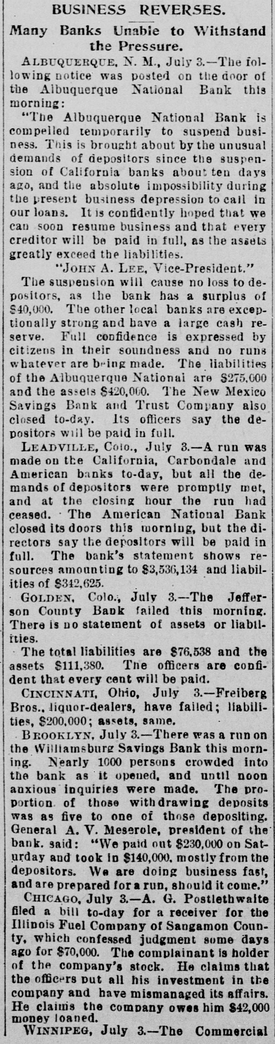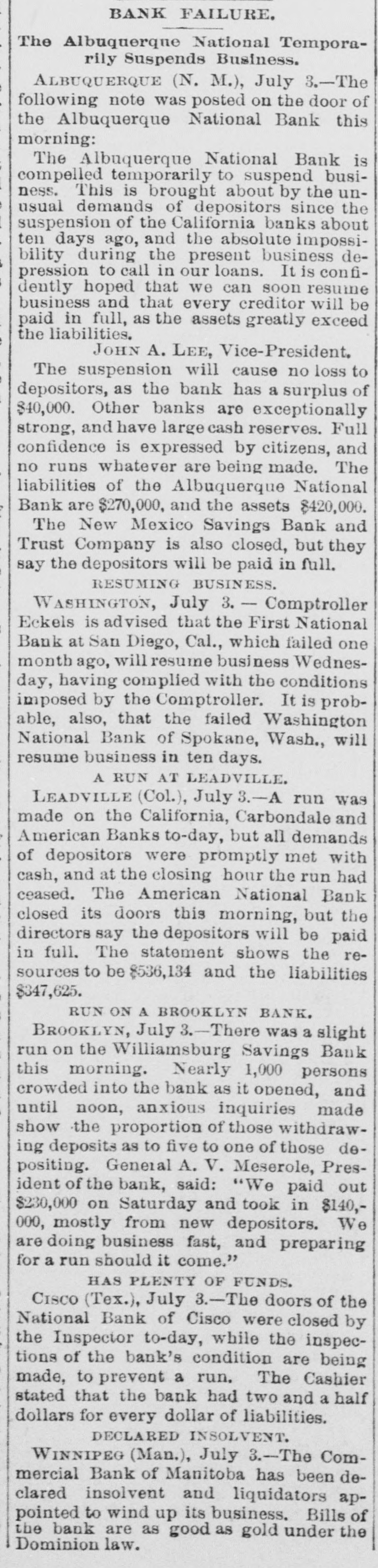 BANK FAILURE. The Albuquerqne National Temporarily Suspends Business. ALBUQUERQUE (N. M.), July 3.-The following note was posted on the door of the Albuquerque National Bank this morning: The Albuquerque National Bank is compelled temporarily to suspend business. This is brought about by the unusual demands of depositors since the suspension of the California banks about ten days ago, and the absolute impossibility during the present business depression to call in our loans. It is confidently hoped that we can soon resuine business and that every creditor will be paid in full, as the assets greatly exceed the liabilities. JOHN A. LEE, Vice-President. The suspension will cause no loss to depositors, as the bank has a surplus of $40,000. Other banks are exceptionally strong, and have large cash reserves. Full confidence is expressed by citizens, and no runs whatever are being made. The liabilities of the Albuquerque National Bank are $270,000, and the assets $420,000. The New Mexico Savings Bank and Trust Company is also closed, but they say the depositors will be paid in full. RESUMING BUSINESS. WASHINGTON, July 3. - Comptroller Eckels is advised that the First National Bank at San Diego, Cal., which failed one month ago, will resume business Wednesday, having complied with the conditions imposed by the Comptroller. It is probable, also, that the failed Washington National Bank of Spokane, Wash., will resume business in ten days. A RUN AT LEADVILLE. LEADVILLE (Col.), July 3.-A run was made on the California, Carbondale and American Banks to-day, but all demands of depositors were promptly met with cash, and at the closing hour the run had ceased. The American National Bank closed its doors this morning, but the directors say the depositors will be paid in full. The statement shows the resources to be $536,134 and the liabilities $347,625. RUN ON A BROOKLYN BANK. BROOKLYN, July 3.-There was a slight run on the Williamsburg Savings Bank this morning. Nearly 1,000 persons crowded into the bank as it opened, and until noon, anxious inquiries made show the proportion of those withdrawing deposits as to five to one of those depositing. General A. V. Meserole, President of the bank, said: "We paid out $230,000 on Saturday and took in $140,000, mostly from new depositors. We are doing business fast, and preparing for a run should it come." HAS PLENTY OF FUNDS. Cisco (Tex.), July 3.-The doors of the National Bank of Cisco were closed by the Inspector to-day, while the inspections of the bank's condition are being made, to prevent a run. The Cashier stated that the bank had two and a half dollars for every dollar of liabilities. DECLARED INSOLVENT. WINNIPEG (Man.), July 3.-The Commercial Bank of Manitoba has been declared insolvent and liquidators appointed to wind up its business. Bills of the bank are as good as gold under the Dominion law.