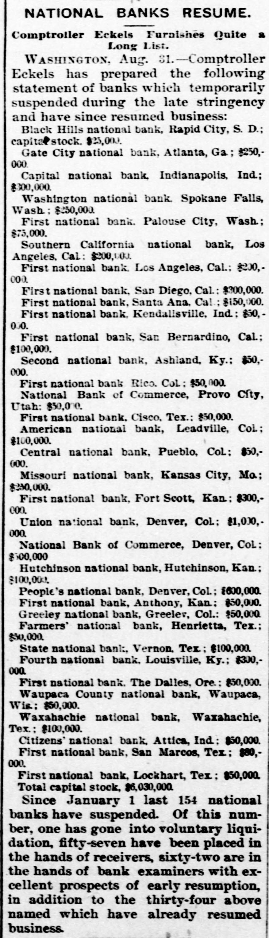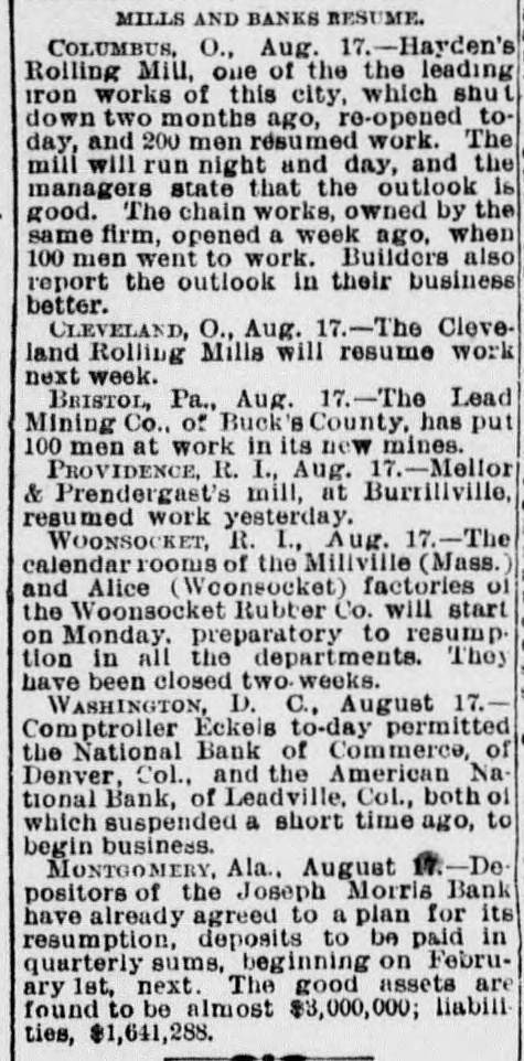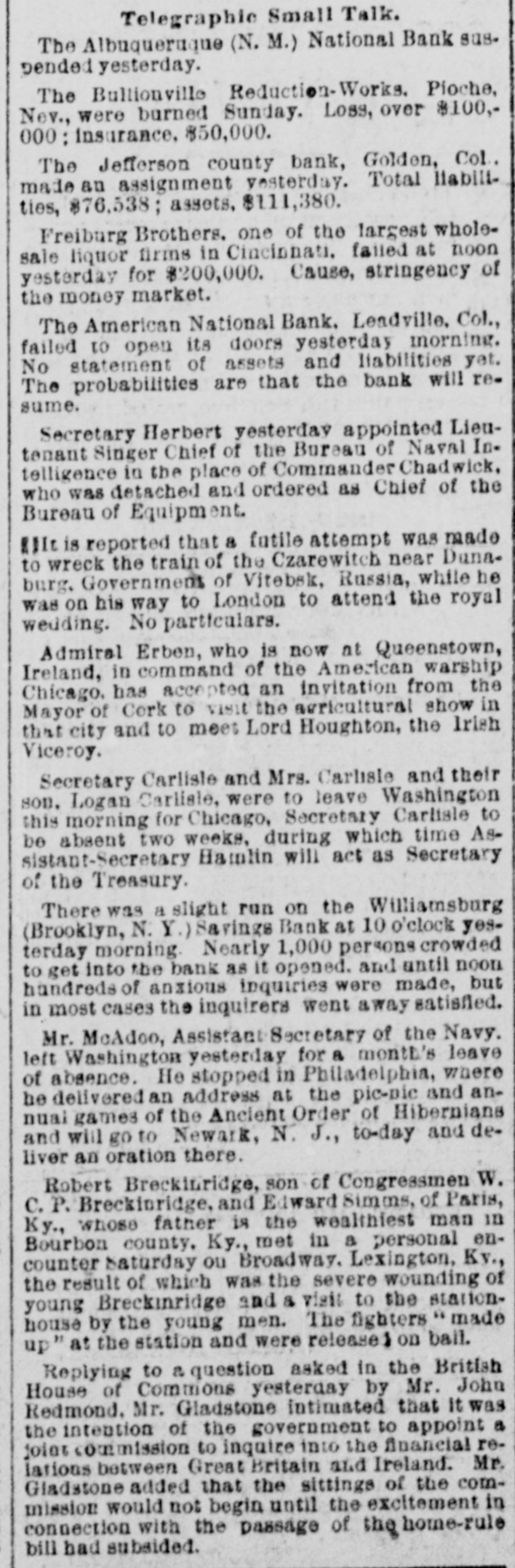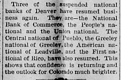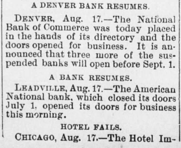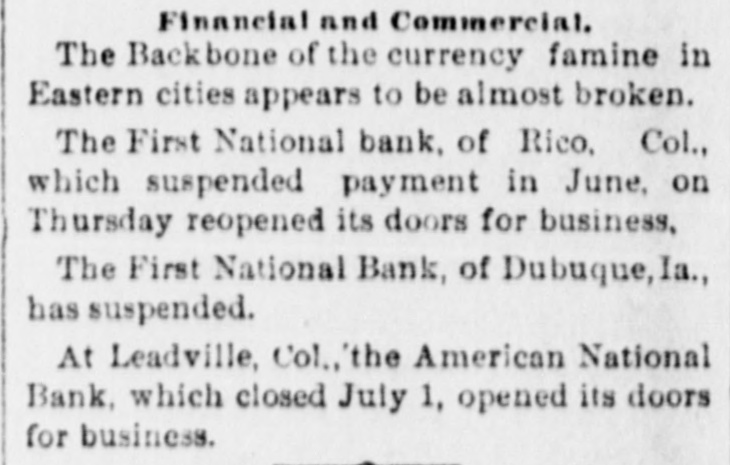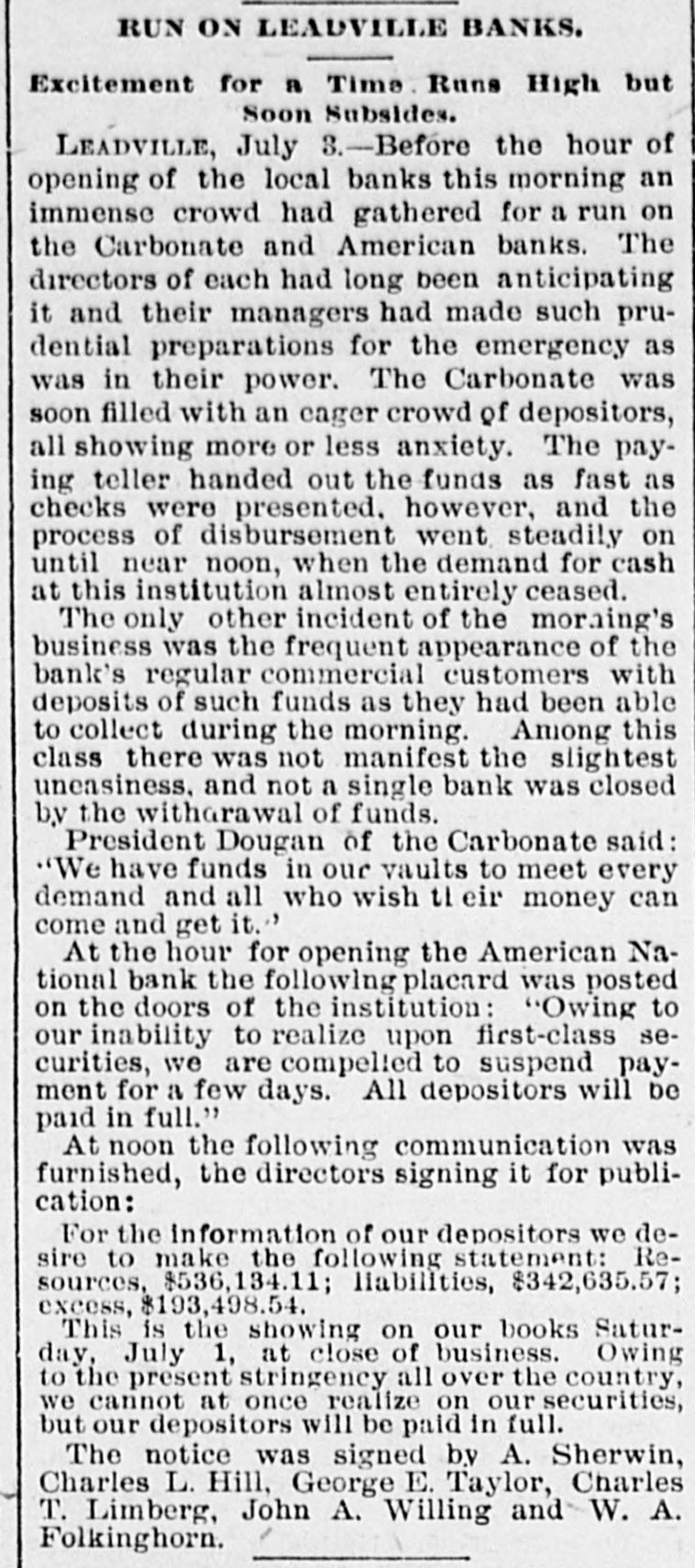 BANK FAILURE. The Albuquerqne National Temporarily Suspends Business. ALBUQUERQUE (N. M.), July 3.-The following note was posted on the door of the Albuquerque National Bank this morning: The Albuquerque National Bank is compelled temporarily to suspend business. This is brought about by the unusual demands of depositors since the suspension of the California banks about ten days ago, and the absolute impossibility during the present business depression to call in our loans. It is confidently hoped that we can soon resuine business and that every creditor will be paid in full, as the assets greatly exceed the liabilities. JOHN A. LEE, Vice-President. The suspension will cause no loss to depositors, as the bank has a surplus of $40,000. Other banks are exceptionally strong, and have large cash reserves. Full confidence is expressed by citizens, and no runs whatever are being made. The liabilities of the Albuquerque National Bank are $270,000, and the assets $420,000. The New Mexico Savings Bank and Trust Company is also closed, but they say the depositors will be paid in full. RESUMING BUSINESS. WASHINGTON, July 3. - Comptroller Eckels is advised that the First National Bank at San Diego, Cal., which failed one month ago, will resume business Wednesday, having complied with the conditions imposed by the Comptroller. It is probable, also, that the failed Washington National Bank of Spokane, Wash., will resume business in ten days. A RUN AT LEADVILLE. LEADVILLE (Col.), July 3.-A run was made on the California, Carbondale and American Banks to-day, but all demands of depositors were promptly met with cash, and at the closing hour the run had ceased. The American National Bank closed its doors this morning, but the directors say the depositors will be paid in full. The statement shows the resources to be $536,134 and the liabilities $347,625. RUN ON A BROOKLYN BANK. BROOKLYN, July 3.-There was a slight run on the Williamsburg Savings Bank this morning. Nearly 1,000 persons crowded into the bank as it opened, and until noon, anxious inquiries made show the proportion of those withdrawing deposits as to five to one of those depositing. General A. V. Meserole, President of the bank, said: "We paid out $230,000 on Saturday and took in $140,000, mostly from new depositors. We are doing business fast, and preparing for a run should it come." HAS PLENTY OF FUNDS. Cisco (Tex.), July 3.-The doors of the National Bank of Cisco were closed by the Inspector to-day, while the inspections of the bank's condition are being made, to prevent a run. The Cashier stated that the bank had two and a half dollars for every dollar of liabilities. DECLARED INSOLVENT. WINNIPEG (Man.), July 3.-The Commercial Bank of Manitoba has been declared insolvent and liquidators appointed to wind up its business. Bills of the bank are as good as gold under the Dominion law.