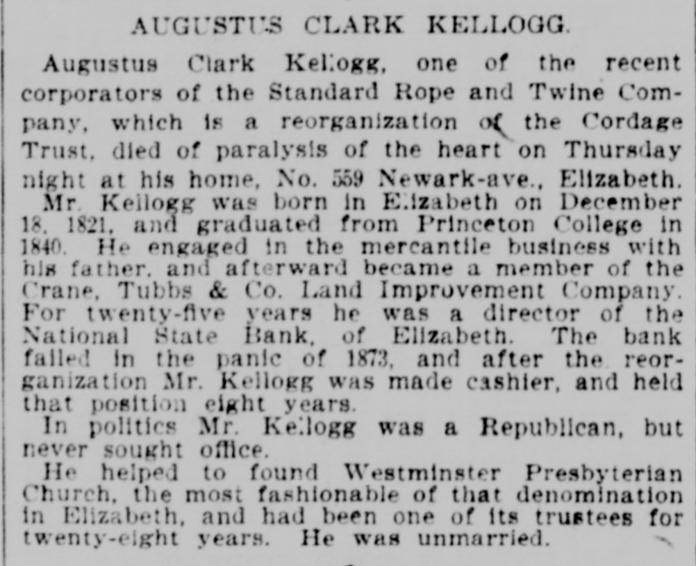 AUGUSTUS CLARK KELLOGG. Augustus Clark Kellogg, one of the recent corporators of the Standard Rope and Twine Company, which is a reorganization of the Cordage Trust, died of paralysis of the heart on Thursday night at his home, No. 559 Newark-ave., Elizabeth. Mr. Kellogg was born in Elizabeth on December 18, 1821, and graduated from Princeton College in 1840. He engaged in the mercantile business with his father. and afterward became a member of the Crane, Tubbs & Co. Land Improvement Company. For twenty-five years he was a director of the National State Bank, of Elizabeth. The bank failed in the panic of 1873, and after the reorganization Mr. Kellogg was made cashier, and held that position eight years. In politics Mr. Kellogg was a Republican, but never sought office. He helped to found Westminster Presbyterian Church, the most fashionable of that denomination in Elizabeth, and had been one of its trustees for twenty-eight years. He was unmarried.