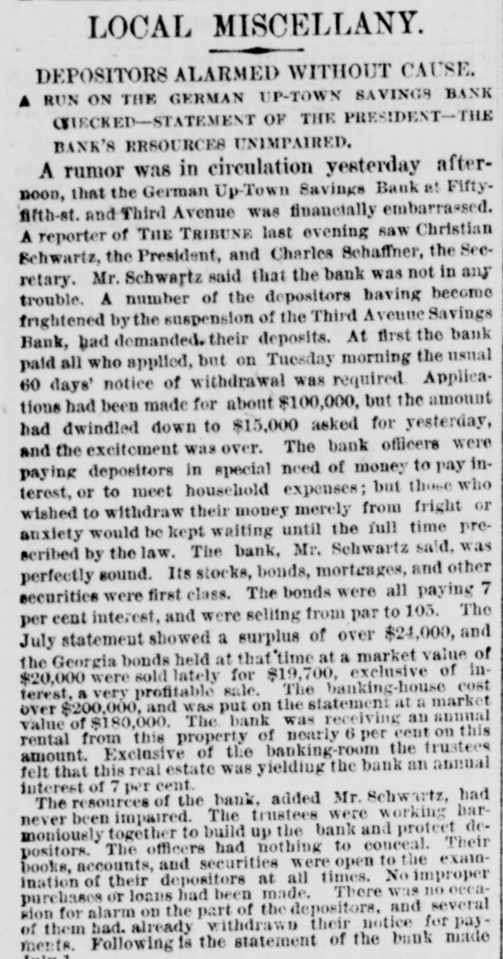 LOCAL MISCELLANY. DEPOSITORS ALARMED WITHOUT CAUSE. RUN ON THE GERMAN UP-TOWN SAVINGS BANK CIECKED-STATEMENT OF THE PRESIDENT-THE BANK'S RESOURCES UNIMPAIRED. A rumor was in circulation yesterday afternoon, that the German Up-Town Savings Bank at Fiftyfifth-st. and Third Avenue was financially embarrassed. A reporter of THE TRIBUNE last evening saw Christian Schwartz, the President, and Charles Schaffner, the Secretary. Mr. Schwartz said that the bank was not in any trouble. A number of the depositors having become frightened by the suspension of the Third Avenue Savings Bank, bad demanded. their deposits. At first the bank paid all who applied, but on Tuesday morning the usual 60 days' notice of withdrawal was required. Applications had been made for about $100,000, but the amount had dwindled down to $15,000 asked for yesterday, and the excitement was over. The bank officers were paying depositors in special need of money to pay interest, or to meet household expenses; but those who wished to withdraw their money merely from fright or anxiety would be kept waiting until the full time prescribed by the law. The bank, Mr. Schwartz said, was perfectly sound. Its stocks, bonds, mortgages, and other securities were first class. The bonds were all paying 7 per cent interest, and were selling from par to 105. The July statement showed a surplus of over $24,000, and the Georgia bonds held at that time at a market value of $20,000 were sold lately for $19,700, exclusive of interest, a very profitable sale. The banking-house cost over $200,000, and was put on the statement at a market value of $180,000. The bank was receiving an annual rental from this property of nearly 6 per cent on this amount. Exclusive of the banking-room the trustees felt that this real estate was yielding the bank an annual interest of 7 per cent. The resources of the bank. added Mr. Schwartz, had never been impaired. The trustees were working barmoniously together to build up the bank and protect depositors. The officers had nothing to conceal. Their books, accounts, and securities were open to the exainination of their depositors at all times. No improper purchases or loans had been made. There was no occasion for alarm on the part of the depositors, and several of them had. already withdrawn their notice for payments. Following is the statement of the bank made