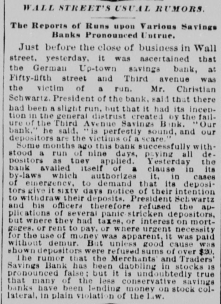 WALL STREET'S USUAL RUMORS. The Reports of Runs upon Various Savings Banks Pronounced Untrue. Just before the close of business in Wall street. yesterday, it was ascertained that the German Up-town savings bank, at Fifty-fifth street and Third avenue was the victim of a run. Mr. Christian Schwartz. President of the bank, said that there bad been a slight run. but that it had its inception in the general distrust created by the failure of the Third Avenue Savings Bank. "Our bank, he said. is perfectly sound, and our depositors are the victims of a scare." Some months ago this bank successfully withstood a run of nine days, paying all depositors as they applied. Yesterday the bank availed itself of a clause in its by-laws which authorizes it, in cases of emergency, to demand that its depositors give it SIXTV days notice of their intention to withdraw their deposits. President Sebwartz and his officera therefore refused the applications of several panic stricken depositors, but where they had taxes, or interest on mortgages. or rent to pay, or where urgent necessity for the use of money was apparent, it was paid without demur. But unless good cause was shown depositors were refused sums of over $20. The rumor that the Merchants' and Traders' Savings Bank has been dabbling in stocks IS pronounced false: but it is undoubtedly true that many of the less conservative savings banks have been lending money on stock collateral, in plain violation of the law.
