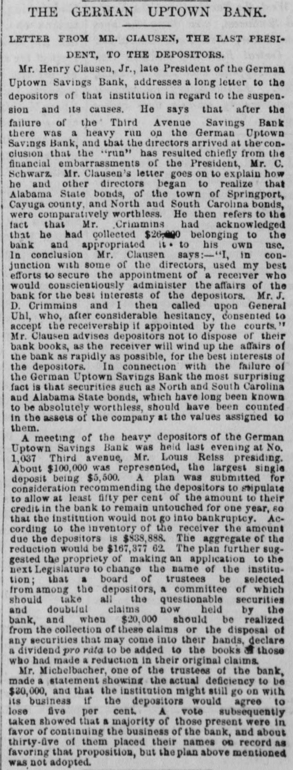 THE GERMAN UPTOWN BANK. LETTER FROM MR. CLAUSEN, THE LAST PRESIDENT, TO THE DEPOSITORS. Mr. Henry Clausen, Jr., late President of the German Uptown Savings Bank, addresses a long letter to the depositors of that institution in regard to the suspension and its causes. He says that after the failure of the Third Avenue Savings Bank there was a heavy run on the German Uptown Savings Bank, and that the directors arrived at the conclusion that the "run" has resulted chiefly from the financial embarrassments of the President, Mr. C. Schwarz. Mr. Clausen's letter goes on to explain how he and other directors began to realize that Alabama State bonds, of the town of Springport, Cayuga county, and North and South Carolina bonds, were comparatively worthless. He then refers to the fact that Mr. Crimmins had acknowledged that he had collected $26,000 belonging to the bank and appropriated 16 to his own use. In conclusion Mr. Clausen says:-"I, in conjunction with some of the directors, used my best efforts to secure the appointment of a receiver who would conscientiously administer the affairs of the bank for the best interests of the depositors. Mr. J. D. Crimmins and I then called upon General Uhl, who, after considerable hesitancy, consented to accept the receivership if appointed by the courts.' Mr. Clausen advises depositors not to dispose of their bank books, as the receiver will wind up the affairs of the bank as rapidly as possible, for the best interests of the depositors. In connection with the failure of the German Uptown Savings Bank the most surprising fact is that securities such as North and South Carolina and Alabama State bonds, which have long been known to be absolutely worthless, should have been counted in the assets of the company at the values assigned to them. A meeting of the heavy depositors of the German Uptown Savings Bank was held last evening at No. 1,037 Third avenue, Mr. Louis Reiss presiding. About $100,000 was represented, the largest single deposit being $5,500. A plan was submitted for consideration recommending the depositors to stipulate to allow at least fifty per cent of the amount to their credit in the bank to remain untouched for one year, 60 that the institution would not go into bankruptcy. According to the inventory of the receiver the amount due the depositors is $838,888. The aggregate of the reduction would be $167,377 62. The plan further suggested the propriety of making an application to the next Legislature to change the name of the institution; that a board of trustees be selected from among the depositors, a committee of which should take all the questionable securities and doubtful claims now held by the bank, and when $20,000 should be realized from the collection of these claims or the disposal of any securities that may come into their bands, declare a dividend pro rata to be added to the books a those who had made a reduction in their original claims. Mr. Michelbacher, one of the trustees of the bank, made a statement showing the actual deficiency to be $30,000, and that the institution might still go on with its business if the depositors would agree to lose five per cent. A vote subsequently taken showed that a majority of those present were in favor of continuing the business of the bank, and about thirty-five of them placed their names on record as favoring that proposition, but the plan above mentioned was not adopted.