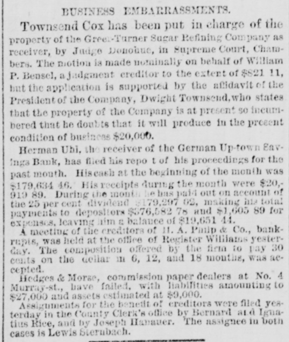 BUSINESS EMBARRASSMEN TS. Townsend Cox has been put in charge of the property of the Green-Turner Sugar Refining Company as receiver, by Judge Donobuc, in Supreme Court, Chambers. The motion is made nominally on behalf of William P. Bensel, a jadgment creditor to the extent of $821 11, but the application is supported by the afidavit of the President of the Company, Dwight Townsend, who states that the property of the Company is at present so incumhered that he doubts that it will produce in the present condition of business $20,000. Herman Ubi, the receiver of the German Up-town Savinga Bank, has filed his repo t of his proceedings for the past mouth. Hiscash at the beginning of the month was $179,634 46. His receipts during the month were $20, 919 89. During the month he has paid out on account of the 25 per cent dividend $179,297 02, making his total payments to depositors $376,582 78 and $1,605 89 for expenses. leaving aim a balance of $19,651 44. A meeting of the creditors of 11. A. Philp & Co., bankrupts, was held at the office of Register Williams yesterGay. The composition offered by the firm to pay 30 cents on the Gollar III 6, 12, and 18 months, was accepted. Hedges & Morse, commission paper dealers at No. 4 Murray-st., have failed, with liabilities amounting to $27,000 and assets estimated at $9,000. Assignments for the benefit of creditors were filed yesterday in the County Clerk's office by Bernard and Ignatius Rice, and by Joseph Hanaver. The assignee in both cases is Lewis Sternbach.