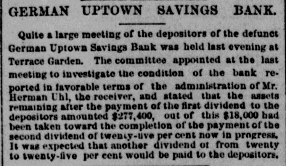 BANK. GERMAN UPTOWN SAVINGS Quite a large meeting of the depositors of the defunct German Uptown Savings Bank was held last evening at Terrace Garden. The committee appointed at the last meeting to investigate the condition of the bank reported in favorable terms of the administration of Mr. Herman Uhl, the receiver, and stated that the assets remaining after the payment of the first dividend to the depositors amounted $277,400, out of this $18,000 bad been taken toward the completion of the payment of the second dividend of twenty-tive per cent now in progress. It was expected that another dividend of from twenty to twenty-five per cent would be paid to the depositors.