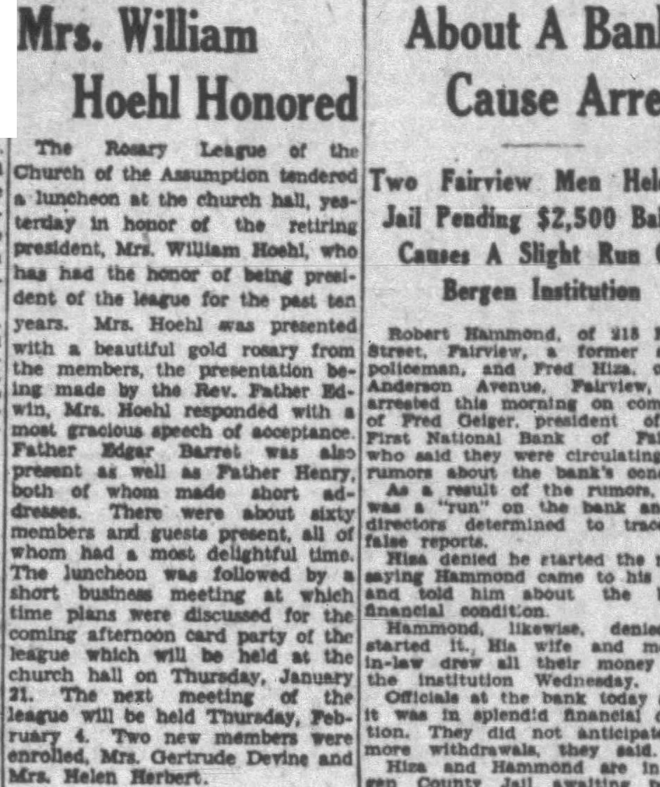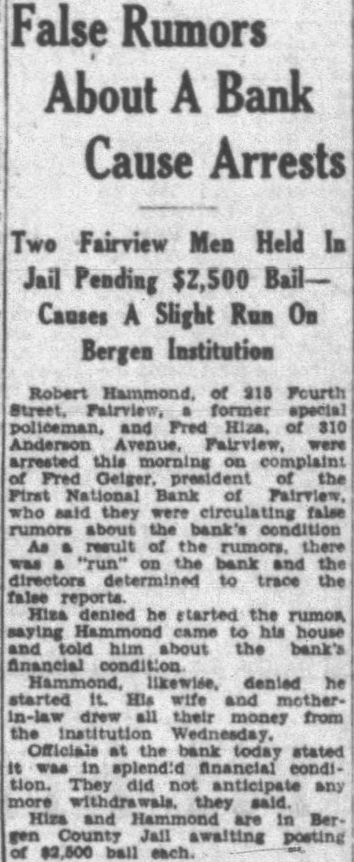 About A Bank Cause Arrests Two Fairview Men Held In Jail Pending $2,500 BailCauses A Slight Run On Bergen Institution Robert Hammond, of 215 Fourth Street, Fairview, former special policeman, and Fred Hiza, of 310 Anderson Avenue, Fairview, were arrested this morning on complaint of Fred Geiger. president the First National Bank of Fairview. who said they were circulating false rumors about the bank's condition As result of the rumors, there was "run" on the bank and the directors to trace the false reports. Hisa dented he started the rumos, saying Hammond came to his house told him about the bank's financial condition likewise, denied he started it. His wife and motherin-law drew all their money from the institution Wednesday. Officials at the bank today stated tion. They did not anticipate any they said. Hiza and are in Bergen County Jail awaiting posting $2,500 ball each.