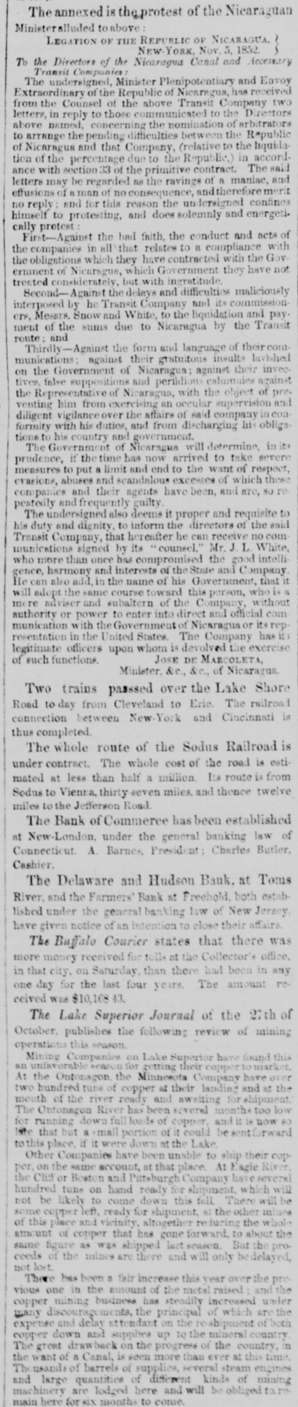 The annexed the protest of the Nicaraguan Minister alluded to above LEGATION OF THE REPUBLIC OF NICARAGUA } NEW-YORK Nov. 5. 1852. To the Directors of the Nicaragua Canal and Accessary Transit Companies: The undersigned, Minister Plenipotentiary and Envoy Extraordinary of the Republic of Nicaragua, has received from the Counsel of the above Transit Company two letters, in reply to those communicated to the Directors above named, concerning the nomination of arbitrators to arrange the pending difficulties between the Republic of Nicaragua and that Company, (relative to the liquidation of the percentage due to the Republic,) in accordance with section 33 of the primitive contract. The said letters may be regarded as the ravings of a maniac, and effusions of aman of no consequence, andtherefore merit no reply and for this reason the undersigned confines himself to protesting, and does solemnly and energeti. cally protest rit-Against the bad faith, the conduct and acts of the companies in all that relates to a compliance with the obligations which they have contracted with the Government of Nicaragua, which Government they have not treated considerately, but with ingratitude. Second-Agains the delays and difficulties maliciously interposed by he Transit Company and its commissioners, Messrs. Snow and White, to the liquidation and payment of the sums due to Nicaragua by the Transit route: and Thirdly-Against the form and language of their communications; against their gratuitous insults lavished on the Government of Nicaragua: against their invectives, false suppositions and pertidious calumnies against the Representative of Nicaragua, with the object of preventing him from exercising an occular supervision and diligent vigilance over the affairs of said company in conformity with his duties, and from discharging his obligations to his country and government. The Government of Nicaragua will determine, in its prudence, if the time has now arrived to take severe measures to put a limit and end to the want of respect, evasions, abuses and scandalous excesses of which these companies and their agents have been, and are, so repeatedly and frequently guilty. The undersigned also deems it proper and requisite to his duty and dignity, to inform the directors of the said Transit Company, that hereafter he can receive no communications signed by its counsel," Mr. J.L. White, who more than once has compromised the good intelligence, harmony and interests of the State and Company He can also add, in the name of his Government, that it will adopt the same course toward this person, who is mere adviser and subaltern of the Company, without authority or power to enter into direct and official communication with the Government of Nicaragua or its rep. resentation in the United States. The Company has it legitimate officers upon whom is devolved the exercise JOSE DE MARCOLETA, of such functions. Minister, &c., &c., of Nicaragua. Two trains passed over the Lake Shore Road to day from Cleveland to Eric. The railroad connection between New-York and Cincinnati is thus completed. The whole route of the Sodus Railroad is under contract. The whole cost of the road is estimated at less than half a million. Its route is from Sodus to Vienna, thirty seven miles. and thence twelve miles to the Jefferson Road The Bank of Commerce has been established at New-London, under the general banking law of Connecticut A. Barnes, President: Charles Butler. Cashier. The Delaware and Hudson Bank, at Toms River, and the Farmers' Bank st Freehold both established under the general banking law of New Jersey, have given notice of an intention to close their affairs. The Buffalo Courier states that there was more money received for tolls at the Collector's office, in that city, on Saturday, than there had been in any one day for the last four years. The amount received was $10,168.43 The Lake Superior Journal of the 27th of October publishes the following review of mining operations this season. Mining Companies on Lake Superior have found this an unfavorable season for getting their copper market At the Ontonsgon the Minnesota Company have over two hundred tuns of copper at their landing and at the mouth of the river ready and awsiting for shipment. The Ontonagon River has been several months too low for running down full loads of copper, and it is now so late that but a mall portion of it could be entforward this place. if it were down at the Lake Other Companies have been unable to ship their copper, on the same account, at that place. At Eagle River, the Chil or Boston and Pittsburgh Company have several hundred tuns on hand ready for shipment, which will not be likely to come down this fall There will be some copper left, ready for shipment, at the other mines of this place and vicinity, altogether reducing the whole amount of copper that has gone forward, to about the same figure as was shipped last season. But the proceeds of the mines are there and will only be delayed, not lost There has been a fair increase this year over the previous one in the amount of the metal raised and the copper mining business has steadily increased under many discouragements the principal of which are the expense and delay attendant on the re-shipment of both copper down and supplies up to the mineral country The great drawback on the progress of the country, in the want of a Canal, is seen more than ever at this time The usands of barrels of supplies, several steam engines and large quantities of different kinds of mining machinery are lodged here and will be obliged tare main here for six months to come.