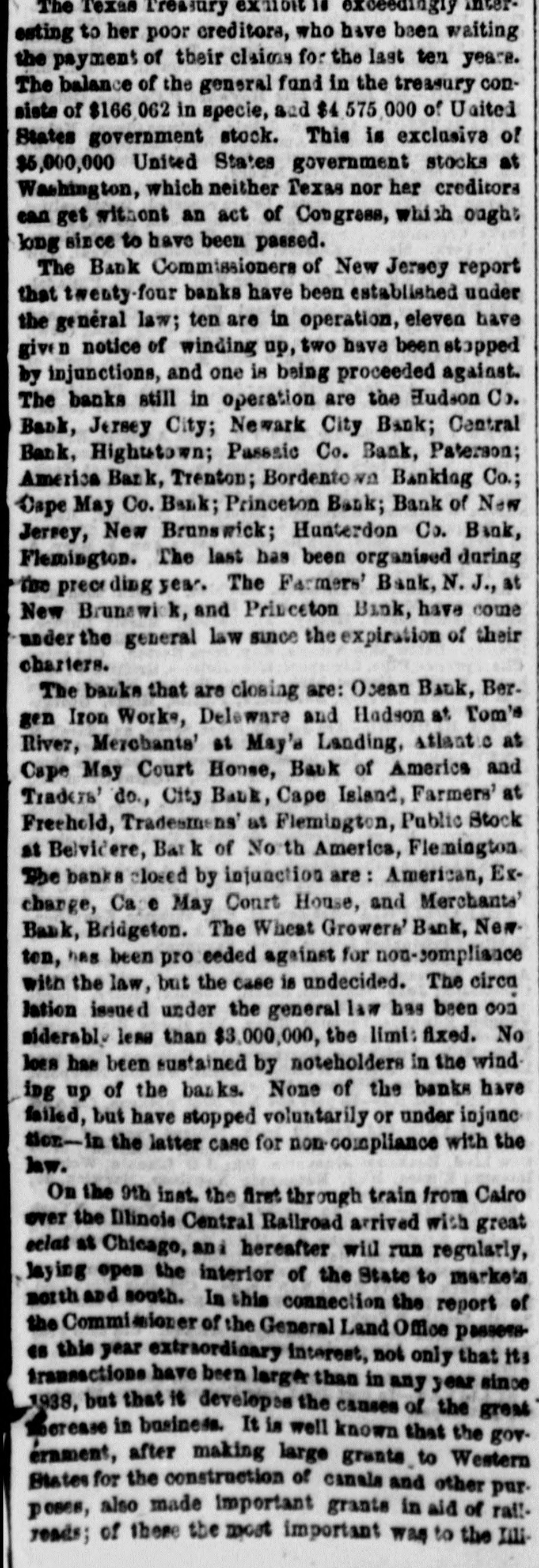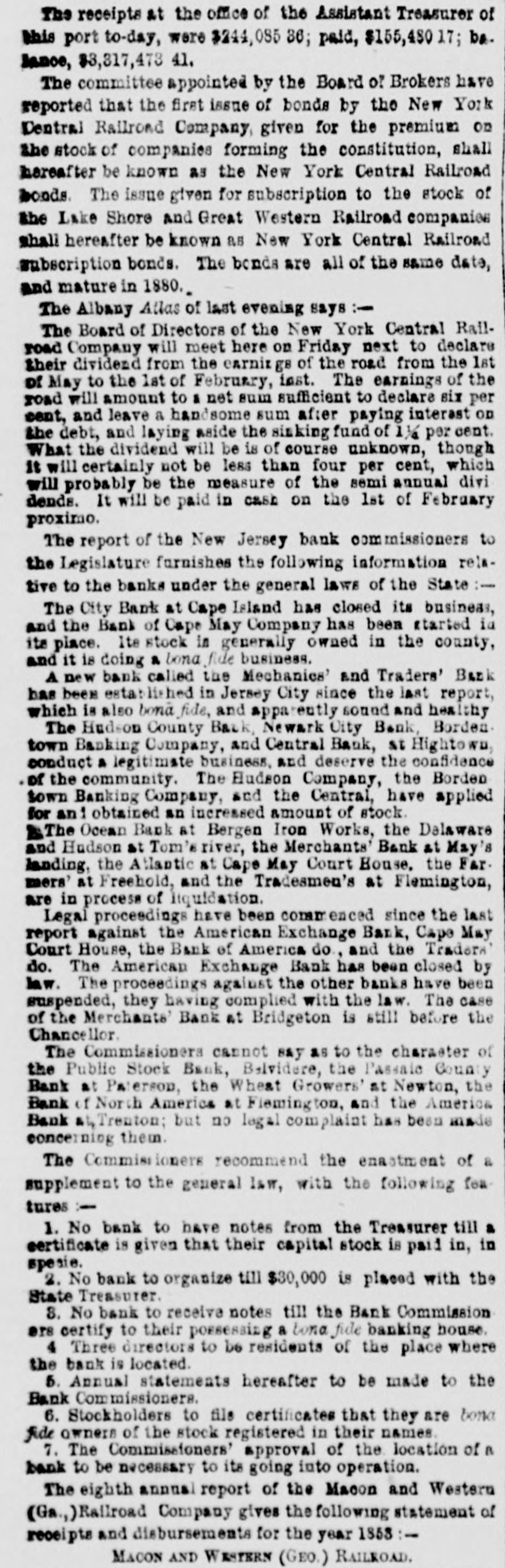 The receipts the office or the Assistant Treasurer of this port to-day, were $244,085 86; paid, $155,480 17; be. Jance, $3,317,473 41. The committee appointed by the Board of Brokers have reported that the first issue of bonds by the New York Dentral Railroad Company given for the premium on the stock of companies forming the constitution, shall hereafter be known as the New York Central Railroad bonds The issue given for subscription to the stock of the Lake Shore and Great Western Railroad companies shall hereafter be known as New York Central Railroad subscription bonds. The bonds are all of the same date, and mature in 1880. The Albany Atlas of last evening says :The Board of Directors of the New York Central Railroad Company will meet here on Friday next to declare their dividend from the carnit gs of the road from the 1st of May to the 1st of February, last. The earnings of the road will amount to & net sum sufficient to declare six per cent, and leave a handsome sum after paying interast OD the debt, and laying aside the sinking fund of 1) per cent. What the dividend will be is of course unknown, though it will certainly not be less than four per cent, which will probably be the measure of the semi annual divi dends. It will be paid in cash on the 1st of February proximo. The report of the New Jersey bank commissioners to the Legislature furnishes the following information reistive to the banks under the general laws of the State:The City Bank at Cape Island has closed its busineas, and the Bank of Cape May Company has been started ia its place. Its stock in generally owned in the county, and it is doing a bona fide business. A new bank called the Mechanics' and Traders' Bank has been established in Jersey City since the last report, which is also bona fide, and apparently sound and healthy The Hudson County Back, Newark City Bank, Borden town Banking Company, and Central Bank, at Hightown conduct & legitimate business. and deserve the confidence of the community. The Hudson Company, the Borden town Banking Company, and the Central, have applied for an obtained an increased amount of stock. &The Ocean Bank at Bergen Iron Works, the Delaware and Hudson at Tom's river, the Merchants' Bank at May's landing, the Atlantic at Cape May Court House. the Far. mers' at Freehold, and the Tradesmen's at Flemington, are in process of liquidation. Legal proceedings have been commenced since the last report against the American Exchange Bank, Cape May Court House, the Bank of America do, and the Traders do. The American Exchange Bank has been closed by law. The proceedings against the other banks have been suspended, they having complied with the law. The case of the Merchants' Bank at Bridgeton is still before the Chancellor The Commissioners cannot say as to the character of the Public Stock Bank, Belvidere, the Passaic County Bank at Paterson, the Wheat Growers' at Newton, the Bank of North America at Flemington, and the America Bank Treaton; but no legal complaint has been made concerning them. The Commissioners recommend the enastment of a supplement to the general law, with the following fea tures 1. No bank to have notes from the Treasurer till a certificate is given that their capital stock is paid in, in spesie. 2. No bank to organize till $30,000 is placed with the State Treasurer. 8. No bank to receive notes till the Bank Commission are certify to their possessing a Lona fide banking house. 4 Three directors to be residents of the place where the bank is located. 5. Annual statements hereafter to be made to the Bank Commissioners. 6. Stockholders to file certificates that they are bona fide owners of the stock registered in their names 7. The Commissioners' approval of the location of B bank to be necessary to its going into operation. The eighth annual report of the Macon and Western ,Railroad Company gives the following statement of receipts and disbursements for the year 1853 :MACON AND WESTERN (GEO.) RAILROAD.