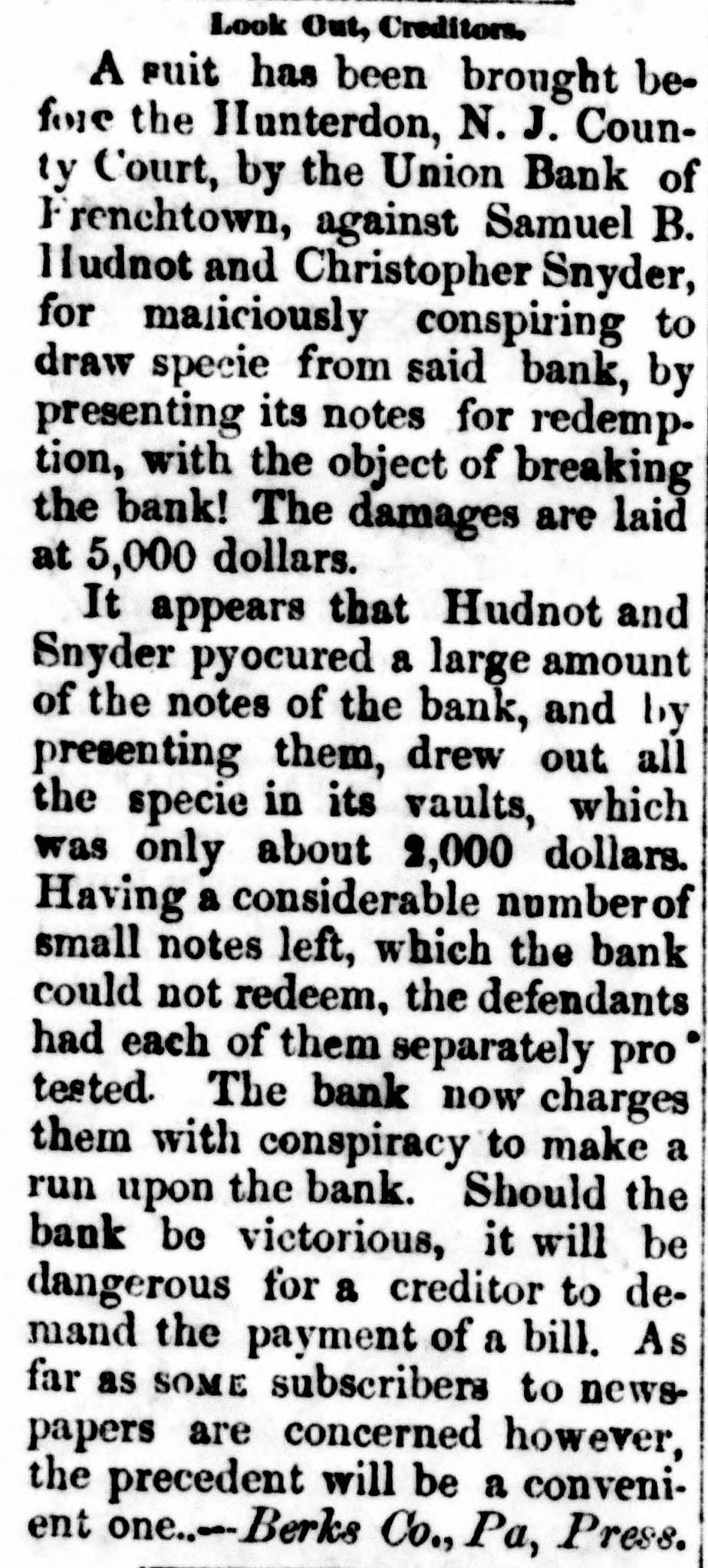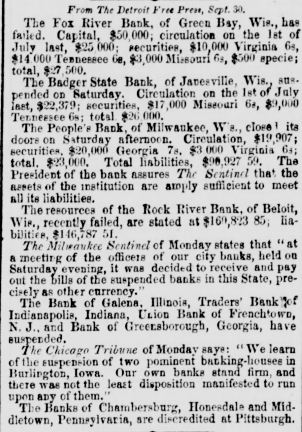 DISCREDITED BANKS. The following IS a corrected list. todate, of recen SUSPENDED and DISCREDITED Banks: Arcade Bank, Providence, H I. America Bank, Trenton. N:J., Agricultural Bank, Tenn: Agricultural bar. K; herkiner, N. Y. Bergen County Bank N.J. Bank 01 Canandaigtta, N.Y. do Napervilie, Iii. do Beleville, de Nashville, Tennessee. do do Springfield, Ohio. do Toumseh, Michigan. do Orieans, N.Y. do New Jersey, New Brunswick, N.J. do Kent, R.I. do Halloweit, Me. do America, Tenn. do West Ternessee, Tenn. do Paris, Tenn. do Corning. N.Y. do the South County, R.I. North America, Connecticut. do do Kanawha. Virginia. do Elgin, III., S. S., small circulation. do the Capitol, Indianapolis, Indes. S. do Middleton, Penn. do Watertown, N.Y. des Chester, Li. do Eigin, do do Pike County, Ill. Central Bank, Indianapolis, Ind.,,s. Chemung County Bank, Horse Heads, N.Y.,s.s. Clinton Bank, Columbus, Ohio. Cty Bank, N.J. Cum erland Savings Institute, Md. Commercial Bank, Columbia, S. C. Citizens' Bank, Tenn. Corn Exclusive Bank, III. Charter Oak Bank, Hartford, Conn. Colchester Bank, Com. Danly Bank, Vt. Davton Bank. Ohio. Dairyman's Bank, Newport, N.Y. Ellsworth Bank. Maine. Exeter Bank. N. H. Exchange Bank. Pittsburgh, Pa Exchange Bank. Hartford, Corn. Farmers' Bank of Saratoga Co., N. Y.,s.s Farmers' and Mmmufacturer's Bank, Poughkeepsie. Farmers' Bank, Wickfort, R.1. Farmers & Mechanics' Dabs ent county, Md. Farmers and Merchants' Bar Md. Eairfie County Bank, Nor alk, Ct. Farmers N Arechanics' Buk, Detroit, Mich. Honesdale Bank, Pennsylvania. Hollister Bai k, Buffalo, N. Y.,s.s. Harcock Bank, Maite. Hugenot Bank, N.Y. H pkinton Bank, Westerly. R T. Hamilton Exchange Hank, Hamilton, N.Y. Island is Bank. Yreity, Jefferson 1 anty Bar K. N.Y. Lee Bilik, Massa have ts: Mechanics' Banking Association, N. Y., Mount Verhon Bank, Providence, R. I. Maratine Bar K, Maine. Monson River Bank. Mark Madomb County Bank, Mehigane Mechanics' Banking Association; N. Treity, Morizan Bank, Ga. Miami Valley Bar K, Ohio. Medina Bank, Medina, N.Y. Munson Bank. Mass. M rehants & Manufacturers' Bank, Pittsburgh, Pa. Mercantile Bank. Hardford, Coub. N.Y. Security Bank, N. Y. Nebraska money has been thrown out by St. Louis brokers, excepting the Banks Florence: Niagara River Bank, Tonawanday N.Y., reported failed, S.S. Ontario Bank, Utica, N.Y. Ohio Life Trust Company, lon'tissue rotés: Oliver Lee & co. Bank, N. reported failed, S. S. Ocnee Bank: Tenn. Outario County Bank, Phelps, People's Bank, N.Y city. reported failed, S: S. Paweatuck Bank, Paweatuck. Ct. Port Plain Bank, N. Y..s.s Reciprecity Bank, Buffak, N. YL. frew bank, S. Rhode Island Central Bank, R:1: Sanford Bar K/Me. Sackett's Harber Banks N. South Royalton Bank, It. Seneer County Bank, Ohio. Southern Bank, Georgia. Stock Security Bank, Illinois. Tippecanoe Bank, Logansport, Ind. Tiverton Bank, Fall River, R.I. Union Bank, Frenchtown, N.J. Unadilla Bank, N.Y. Warwick Bank, R. I. Wonster Bank, Danbury, Conn. Warren County Bank, Penn. Yates County Bank, Penn Yan, N.Y. NOTE.-"S. S." means securet by state stock. Most of these Banks will pay their circulation in full, and holders of their bills should not submit to a large discount on them.