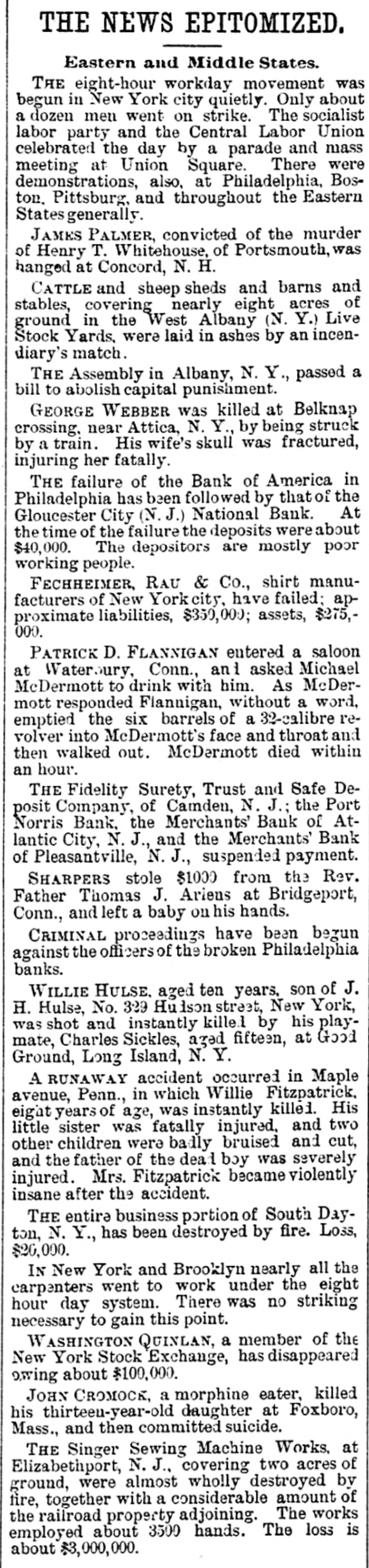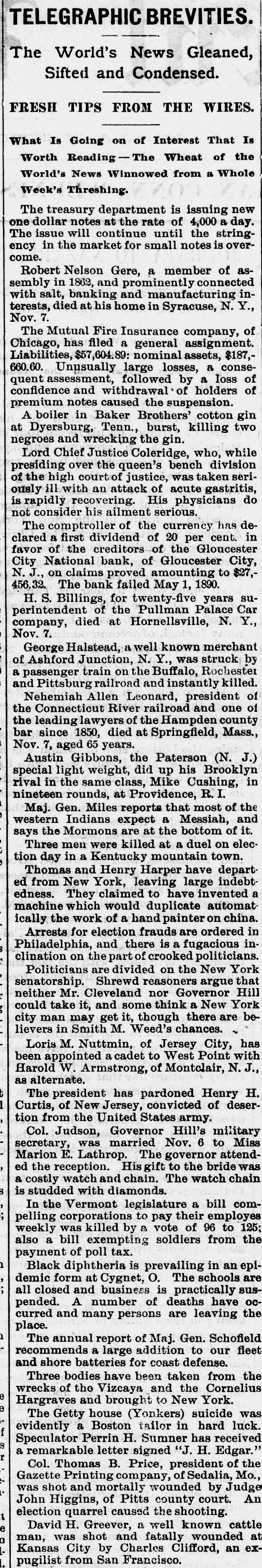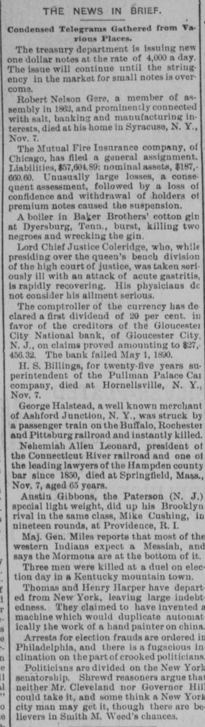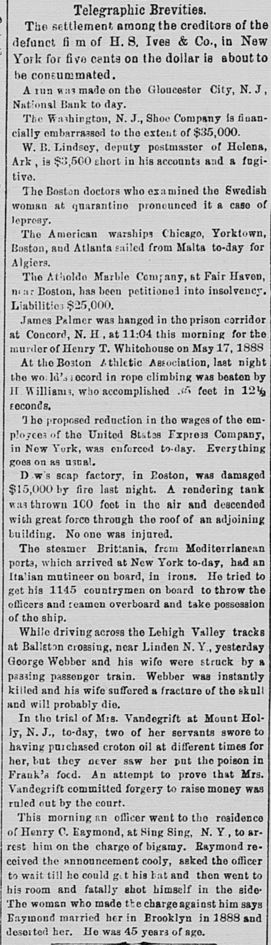 Telegraphic Brevities. The settlement among the creditors of the defunct fi m of H. S. Ives & Co., in New York for five cents on the dollar is about to be consummated. A run was made on the Gloucester City, N. J, National Bank to day. The Washington, N. J., Shoe Company is financially embarrassed to the extent of $35,000. W. B. Lindsey, deputy postmaster of Helena, Ark, is $3,500 short in his accounts and a fugitive. The Boston doctors who examined the Swedish woman at quarantine pronounced it a case of Jepresy. The American warships Chicago, Yorktown, Boston, and Atlanta sailed from Malta to-day for Algiers. The Atholde Marble Company, at Fair Haven, near Boston, has been petitioned into insolvency. Liabilities $25,000. James Palmer was hanged in the prison corridor at Concord, N. H, at 11:04 this morning for the murder of Henry T. Whitehouse on May 17, 1888 At the Boston Athletic Association, last night the WO. ld's ocord in rope climbing was beaten by H. Williams, who accomplished 35 feet in 12½ seconds. The proposed reduction in the wages of the employees of the United States Express Company, in New York, was enforced to-day. Everything goes on as usual. D w's scap factory, in Poston, was damaged $15,000 by fire last night. A rendering tank was thrown 100 foot in the air and descended with great force through the roof of an adjoining building. No one was injured. The steamer Brittania, from Moditerrianean ports, which arrived at New York to-day, had an Italian mutineer on board, in irons. He tried to get his 1145 countrymen on board to throw the officers and reamen overboard and take possession of the ship. While driving across the Lehigh Valley tracks at Ballston crossing, near Linden N. Y., yesterday George Webber and his wife were struck by a passing passenger train. Webber was instantly killed and his wife suffered a fracture of the skull and will probably die. In the trial of Mrs. Vandegrift at Mount Holly, N. J., to-day, two of her servants swore to having purchased croton oil at different times for her, but they never saw her put the poison in Frank's food. An attempt to prove that Mrs. Vandegrift committed forgery to raise money was ruled out by the court. This morning an officer went to the residence of Henry C. Eaymond, at Sing Sing, N. Y, to arrest him on the charge of bigamy. Raymond received the announcement cooly, asked the officer to wait till he could get go his bat and then went to his room and fatally shot himself in the side The woman who made the chargeagainst him says Enymond married her in Brooklyn in 1888 and deserted her. He was 45 years of age.