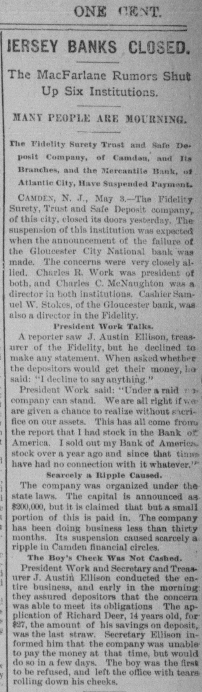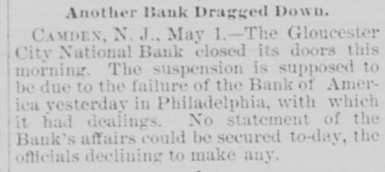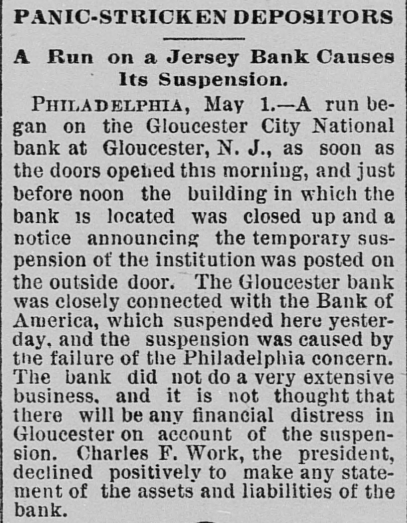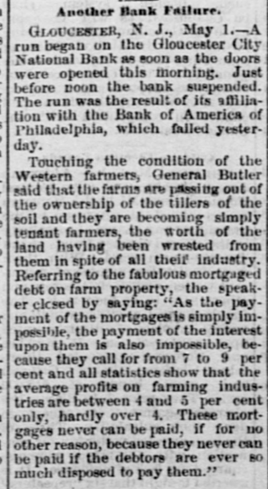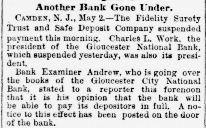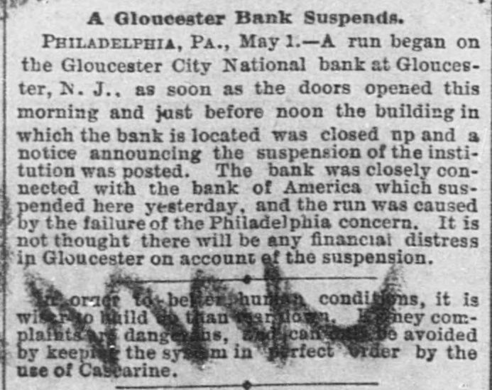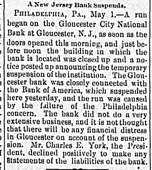 Telegraphic Brevities. The settlement among the creditors of the defunct fi m of H. S. Ives & Co., in New York for five cents on the dollar is about to be consummated. A run was made on the Gloucester City, N. J, National Bank to day. The Washington, N. J., Shoe Company is financially embarrassed to the extent of $35,000. W. B. Lindsey, deputy postmaster of Helena, Ark, is $3,500 short in his accounts and a fugitive. The Boston doctors who examined the Swedish woman at quarantine pronounced it a case of Jepresy. The American warships Chicago, Yorktown, Boston, and Atlanta sailed from Malta to-day for Algiers. The Atholde Marble Company, at Fair Haven, near Boston, has been petitioned into insolvency. Liabilities $25,000. James Palmer was hanged in the prison corridor at Concord, N. H, at 11:04 this morning for the murder of Henry T. Whitehouse on May 17, 1888 At the Boston Athletic Association, last night the WO. ld's ocord in rope climbing was beaten by H. Williams, who accomplished 35 feet in 12½ seconds. The proposed reduction in the wages of the employees of the United States Express Company, in New York, was enforced to-day. Everything goes on as usual. D w's scap factory, in Poston, was damaged $15,000 by fire last night. A rendering tank was thrown 100 foot in the air and descended with great force through the roof of an adjoining building. No one was injured. The steamer Brittania, from Moditerrianean ports, which arrived at New York to-day, had an Italian mutineer on board, in irons. He tried to get his 1145 countrymen on board to throw the officers and reamen overboard and take possession of the ship. While driving across the Lehigh Valley tracks at Ballston crossing, near Linden N. Y., yesterday George Webber and his wife were struck by a passing passenger train. Webber was instantly killed and his wife suffered a fracture of the skull and will probably die. In the trial of Mrs. Vandegrift at Mount Holly, N. J., to-day, two of her servants swore to having purchased croton oil at different times for her, but they never saw her put the poison in Frank's food. An attempt to prove that Mrs. Vandegrift committed forgery to raise money was ruled out by the court. This morning an officer went to the residence of Henry C. Eaymond, at Sing Sing, N. Y, to arrest him on the charge of bigamy. Raymond received the announcement cooly, asked the officer to wait till he could get go his bat and then went to his room and fatally shot himself in the side The woman who made the chargeagainst him says Enymond married her in Brooklyn in 1888 and deserted her. He was 45 years of age.