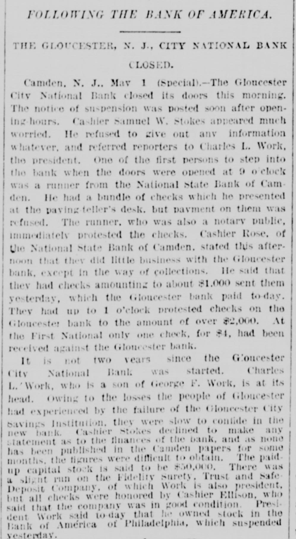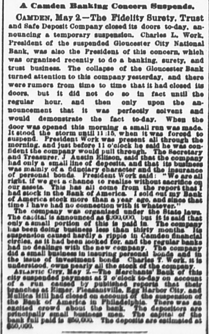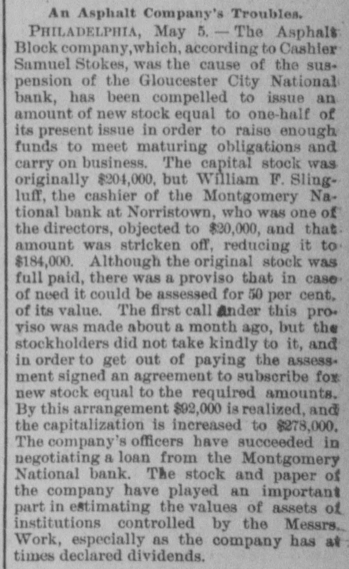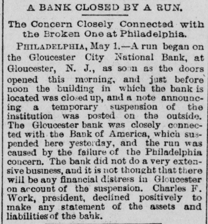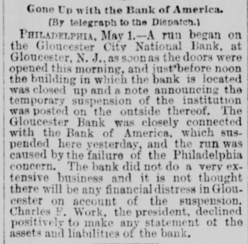 Telegraphic Brevities. The settlement among the creditors of the defunct fi m of H. S. Ives & Co., in New York for five cents on the dollar is about to be consummated. A run was made on the Gloucester City, N. J, National Bank to day. The Washington, N. J., Shoe Company is financially embarrassed to the extent of $35,000. W. B. Lindsey, deputy postmaster of Helena, Ark, is $3,500 short in his accounts and a fugitive. The Boston doctors who examined the Swedish woman at quarantine pronounced it a case of Jepresy. The American warships Chicago, Yorktown, Boston, and Atlanta sailed from Malta to-day for Algiers. The Atholde Marble Company, at Fair Haven, near Boston, has been petitioned into insolvency. Liabilities $25,000. James Palmer was hanged in the prison corridor at Concord, N. H, at 11:04 this morning for the murder of Henry T. Whitehouse on May 17, 1888 At the Boston Athletic Association, last night the WO. ld's ocord in rope climbing was beaten by H. Williams, who accomplished 35 feet in 12½ seconds. The proposed reduction in the wages of the employees of the United States Express Company, in New York, was enforced to-day. Everything goes on as usual. D w's scap factory, in Poston, was damaged $15,000 by fire last night. A rendering tank was thrown 100 foot in the air and descended with great force through the roof of an adjoining building. No one was injured. The steamer Brittania, from Moditerrianean ports, which arrived at New York to-day, had an Italian mutineer on board, in irons. He tried to get his 1145 countrymen on board to throw the officers and reamen overboard and take possession of the ship. While driving across the Lehigh Valley tracks at Ballston crossing, near Linden N. Y., yesterday George Webber and his wife were struck by a passing passenger train. Webber was instantly killed and his wife suffered a fracture of the skull and will probably die. In the trial of Mrs. Vandegrift at Mount Holly, N. J., to-day, two of her servants swore to having purchased croton oil at different times for her, but they never saw her put the poison in Frank's food. An attempt to prove that Mrs. Vandegrift committed forgery to raise money was ruled out by the court. This morning an officer went to the residence of Henry C. Eaymond, at Sing Sing, N. Y, to arrest him on the charge of bigamy. Raymond received the announcement cooly, asked the officer to wait till he could get go his bat and then went to his room and fatally shot himself in the side The woman who made the chargeagainst him says Enymond married her in Brooklyn in 1888 and deserted her. He was 45 years of age.