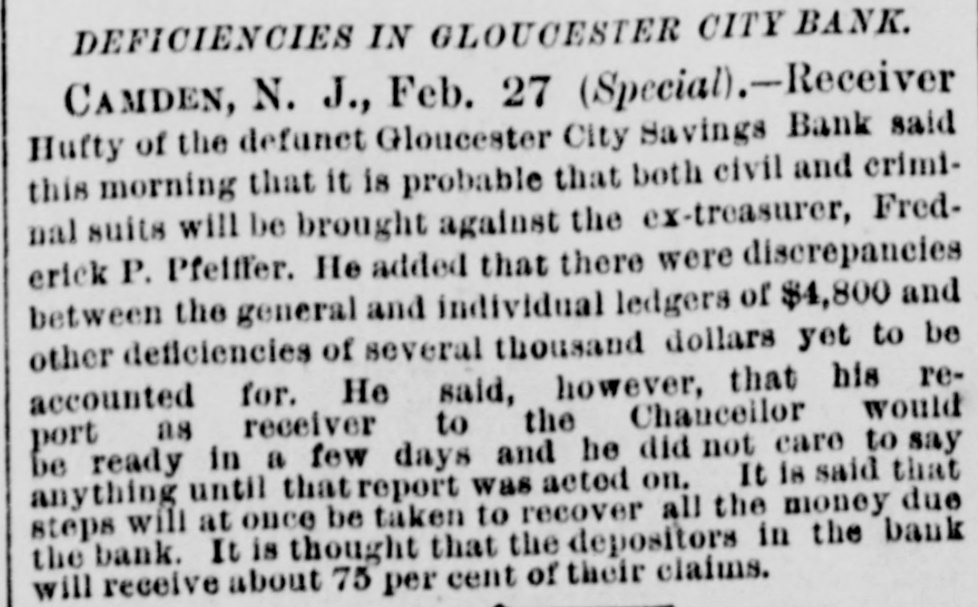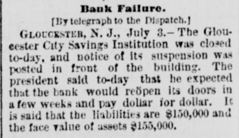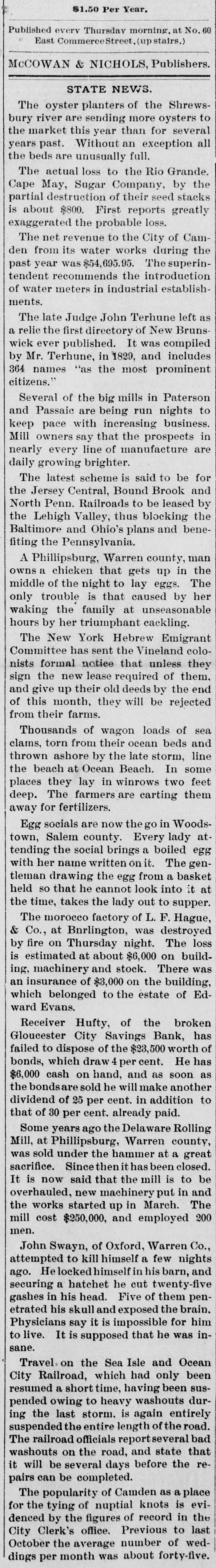TELEGRAPHIC BREVITIES. The lockout of New York plumbers has ended. Each side is satisfied. Williams College has conferred the degree of LL. D. upon United States Senator Ingalls. The Neptune House, at Rockaway, burned yesterday. The guests all escaped. Loss, $15,000. A fire at Westfield, N. Y., yesterday afternoon, burned the Westfield House and three small stores. Loss, $30,000; insurance, $13,000. George H. Hyde, of Little Rock, Ark., a furnishing-goods dealer, assigned yesterday. Liabilities, $13,000; assets, nominally, $10,000. The creditors are chiefly Northern merchants. At Marquette, Mich., last night, fire destroyed a house occupied by Philip Morgan. A ten-year old son of Morgan was burned to death in the building His body was taken from the ruins, charred. The Gloucester City, N. J., Savings Institu tion suspended payment yesterday afternoon, the cash on hand having all been paid out. The directors, it is understood, have decided to apply to the Chancellor for a receiver. At the residence of Mitchell Clark, near Belleville, Tex., on Tuesday night, Seeke Hutchinson killed Bill Simms, shooting him six times with a Winchester rifle. The killing was a coldblooded affair. Hutchinson escaped. A sneak-thief entered the Albany City National Bank, yesterday, and stole Spencer D. Patten's bank-book from the teller's shelfwindow while Patten turned to make a memorandum. The book contained $3,000. A special express on the New York Central railroad yesterday afternoon ran through an open switch into a freight train. Two engines and six cars were wrecked, and a brakeman injured. The passengers were badly shaken up. On Tuesday evening the eldest daughter of Hope Whetstone, a well-to-do colored planter and respected citizen, living near Bastrop. La., was waylaid, riddled with buckshot, and instantly killed. James M. Rutledge was arrested. C.R. Weden & Co., of Providence, R.I. bankers and brokers, made an assignment yesterday. The liabilities will reach $70,000. about one-half of which is checks. on local banks, which went to protest; the remainder is in paper negotiated for business men. Mrs. Ida E. Whitniet, a member of Dan Mason's theatrical company, died suddenly, yesterday, at Providence, R. L, of heart disease, aged thirty-two. Mrs. Whitniet was the widow of a well-known theatrical manager of that name, who dropped dead of heart disease about three years ago in Auburn, N. Y.