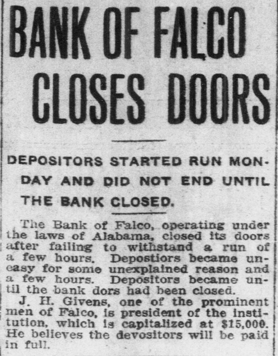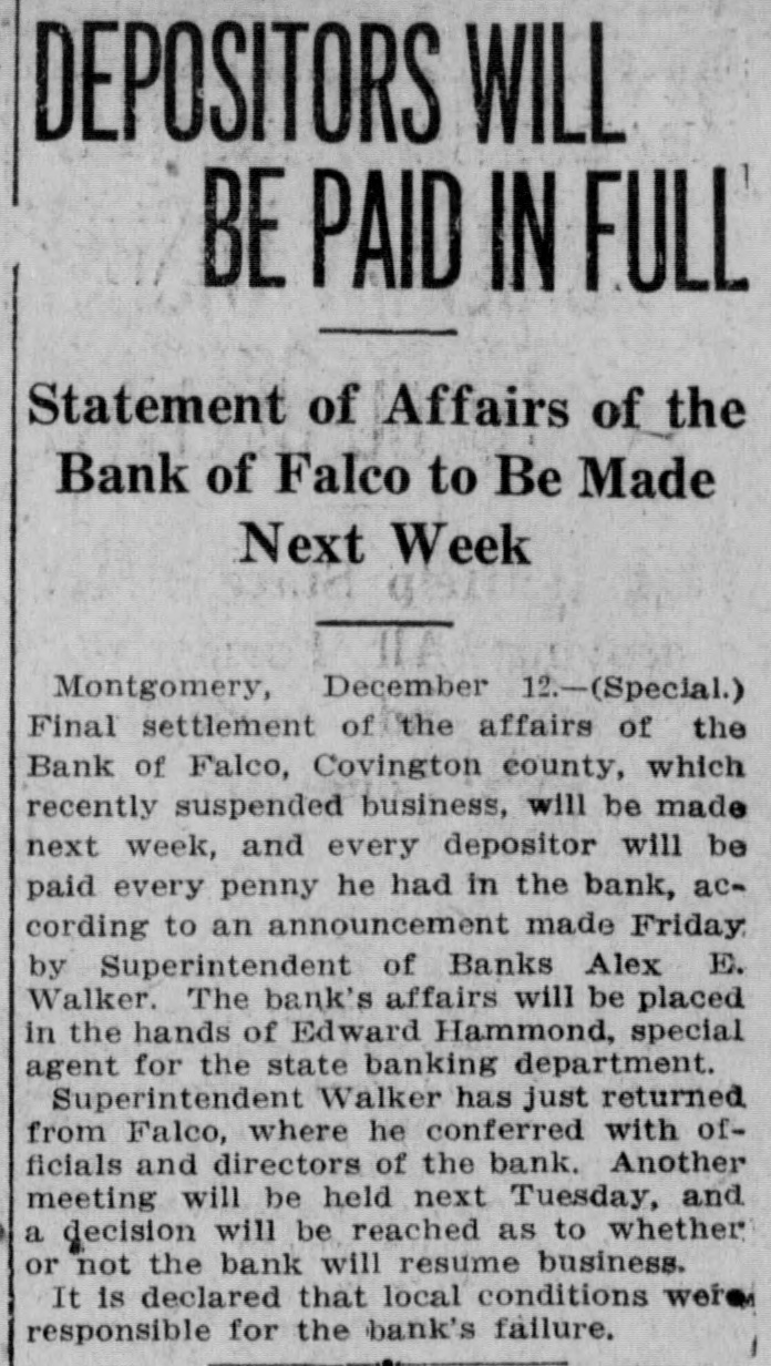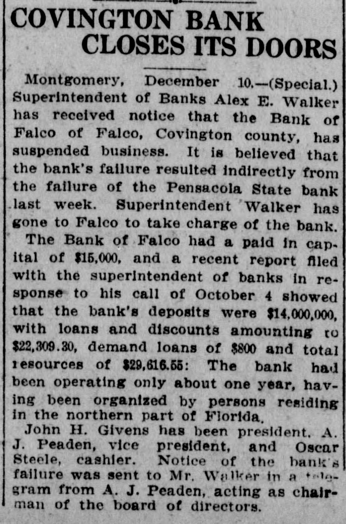 COVINGTON BANK CLOSES ITS DOORS Montgomery, December 10.-(Special.) Superintendent of Banks Alex E. Walker has received notice that the Bank of Falco of Falco, Covington county, has suspended business. It is believed that the bank's failure resulted indirectly from the failure of the Pensacola State bank last week. Superintendent Walker has gone to Falco to take charge of the bank. The Bank of Falco had a paid in cap. ital of $15,000, and a recent report filed with the superIntendent of banks in response to his call of October 4 showed that the bank's deposits were $14,000,000, with loans and discounts amounting to $22,309.30, demand loans of $800 and total resources of $29,616.55: The bank had been operating only about one year, having been organized by persons residing in the northern part of Florida. John H. Givens has been president. A. J. Peaden, vice president, and Oscar Steele, cashier. Notice of the bank's failure was sent to Mr. Walker in a talegram from A. J. Peaden, acting as chairman of the board of directors.