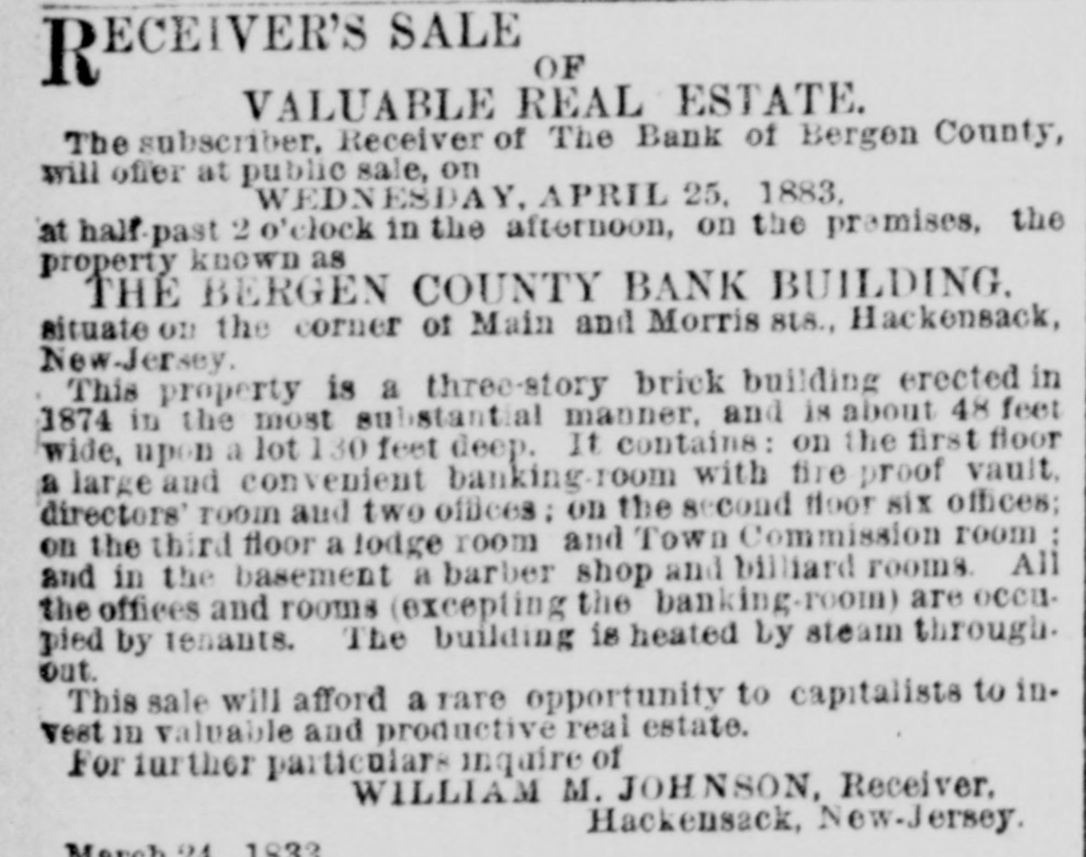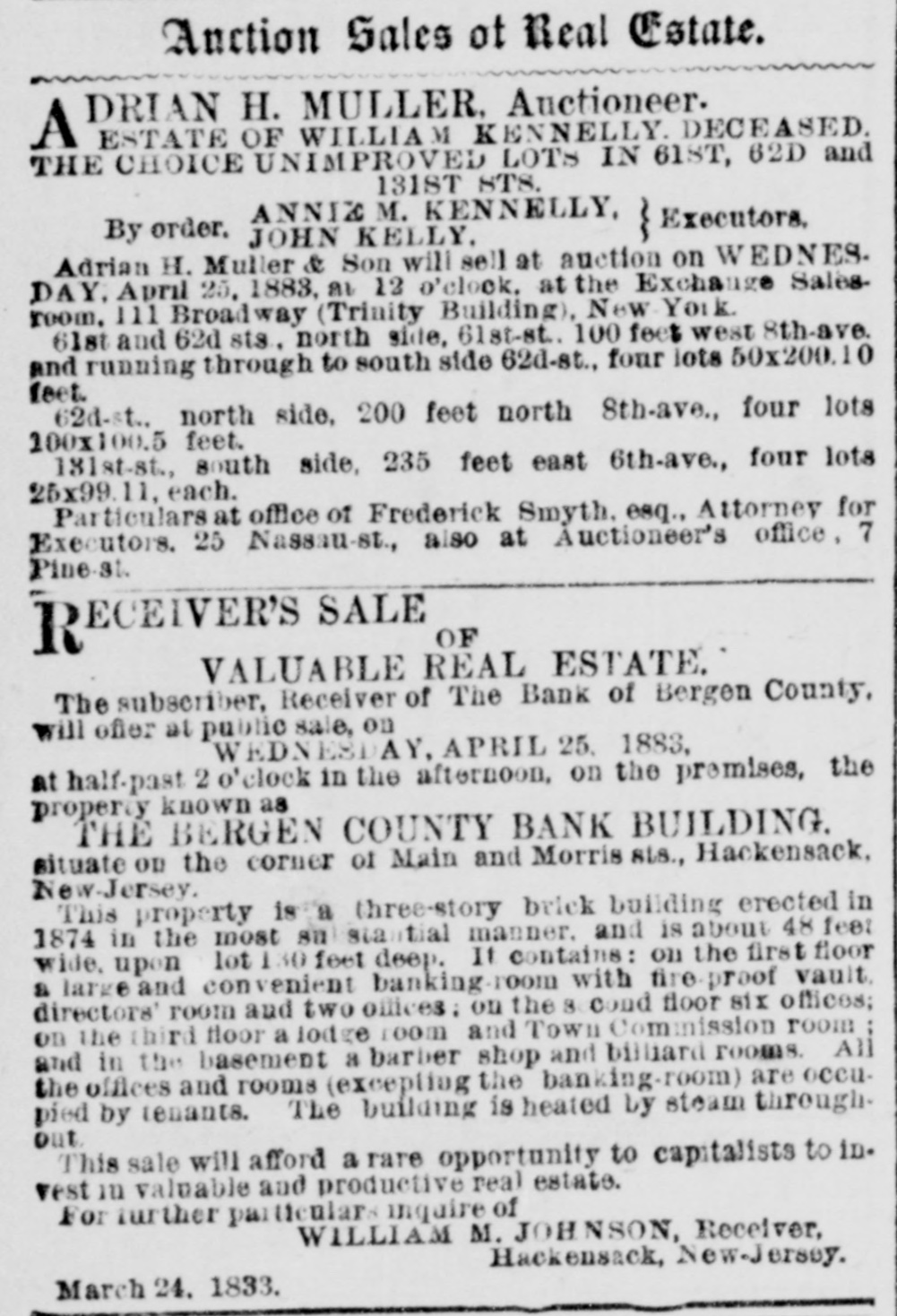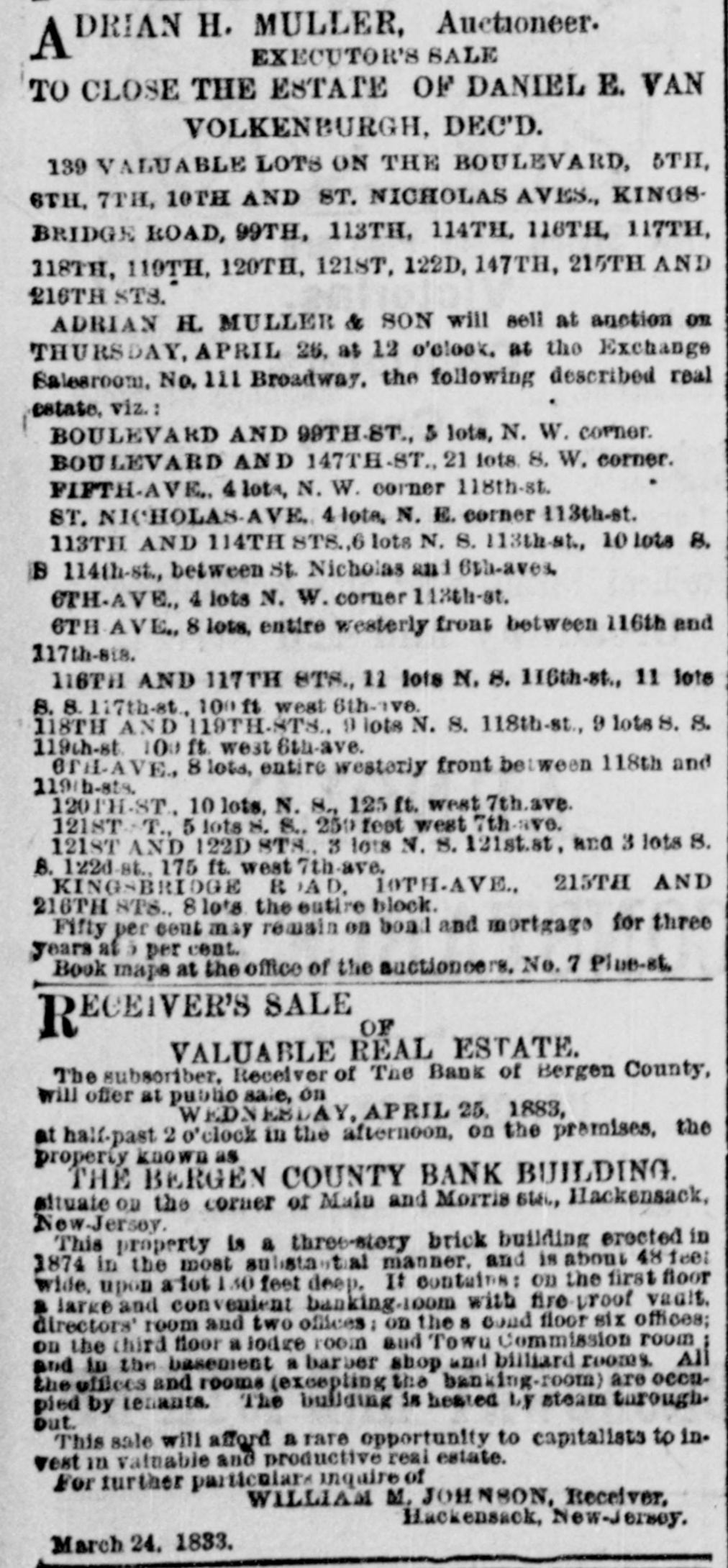 DRIAN H. MULLER, Auctioneer. A EXECUTOR'S SALE TO CLOSE THE ESTATE OF DANIEL E. VAN VOLKENBURGH, DEC'D. 139 VALUABLE LOTS ON THE BOULEVARD, 5TH 6TH, 7TH, 10TH AND ST. NICHOLAS AVES., KINGS BRIDGE ROAD, 99TH, 113TH, 114TH, 116TH, 117TH, 118TH, 110TH, 120TH, 121ST, 122D, 147TH, 215TH AND 216TH STS. ADRIAN H. MULLER & SON will sell at anotion OR THURSDAY, APRIL 26, at 12 o'clook. at the Exchange Salesroom. No. 111 Broadway. the following described real estate, viz.: BOULEVARD AND 99TH-ST., 5 lots, N. W. corner. BOULEVARD AND 147TH-ST. 21 lots. 8. W. corner. FIFTH-AVE. 4 lots, N. W. corner 118th-st. ST. NICHOLAS-AVE. 4 lota, N. E. corner 113th-st. 113TH AND 114TH STS.,6 lots N. S. 113th-st., 10 lots 8. B 114th-st., between St. Nicholas and 6th-aves. 6TH-AVE., 4 lots N. W. corner 113th-st. 6TH AVE. 8 lots, entire westerly front between 116th and 117th-sis. 116TH AND 117TH STS., 11 lots N. 8. 116th-st., 11 lots 8.8.117th-st. 100ft west 6th-vve. 118TH AND 119TH-STS.. 9 lots N. S. 118th-st., 9 lots S. S. 119th-st 100 ft. west 6th-ave. OTH-AVE. 8 lots, entire westerly front between 118th and 119(b-sts. 1201H-ST. 10 lots, N. S., 125 ft. west 7th.ave. 121ST T., 5 lots 8. 8.. 250 feet west 7th ave 121ST AND 122D STS., 3 lots N. S. 121st.st, and 3 lots 8. B. 122d-st., 175 ft. west 7th-ave. KING&BRIDGE R AD, 10TH-AVE., 215TH AND 216TH STS., 8 lots the entire block. Fifty per cont may remain on board and mortgage for three years at à per cent. Book maps at the office of the auctioneers. No. 7 Plue-st. ECEIVER'S SALE OF R VALUABLE REAL ESTATE. The subscriber, Receiver of The Bank of Bergen County, will offer at public sale, on WEDNESDAY, APRIL 25. 1883, at half-past 2 o'clock in the afternoon, on the premises, the property known as THE BERGEN COUNTY BANK BUILDING. situate on the corner of Main and Morris BLU, Hackensack, New-Jersey. This property is a three-story brick building erected in 1874 in the most substantial manner. and is about 48 feel wide, upon a lot 130 feet deep. It Contains: on the first floor a larke and convenient banking.100m with fire broof vault. directors' room and two offices: on the 8 coud floor six offices; on the chird floor a lodge room and Town Commission room and in the basement a barber shop and billiard rooms. All the offices and rooms (excepting the banking-room) are occupied by tenants. The building is heated Ly steam through. out. This sale will afford a rare opportunity to capitalists to in. vest in valuable and productive real estate. For further particulars inquire of WILLIAM M. JOHNSON, Receiver, Hackensack, New-Jersey. March 24. 1833.