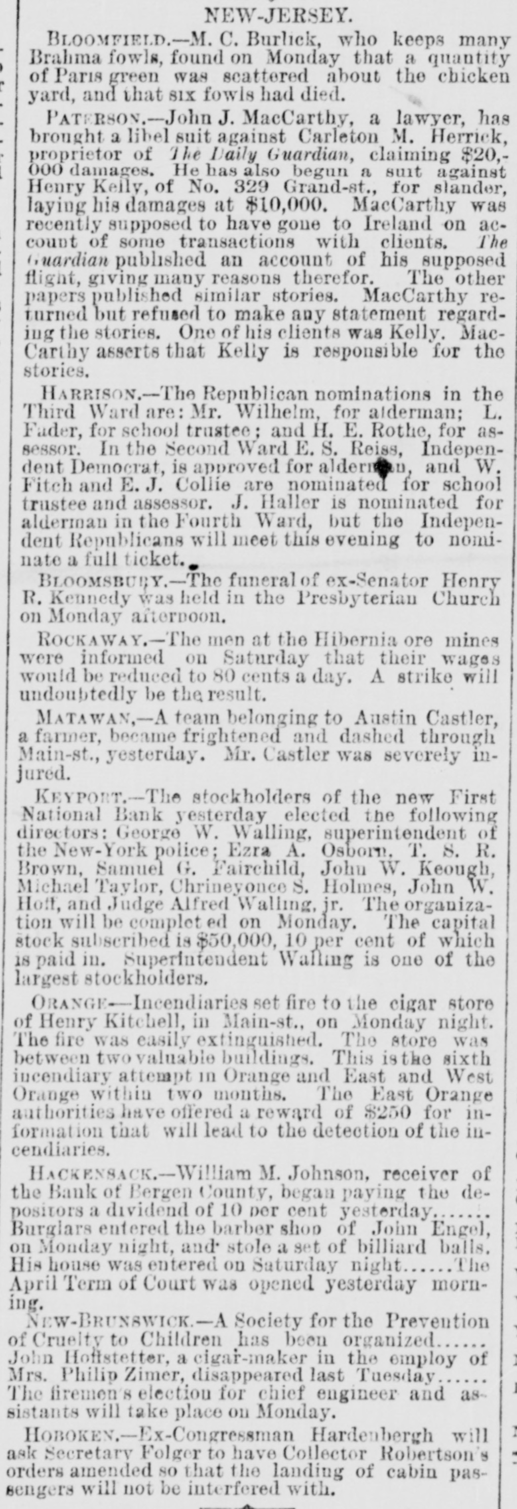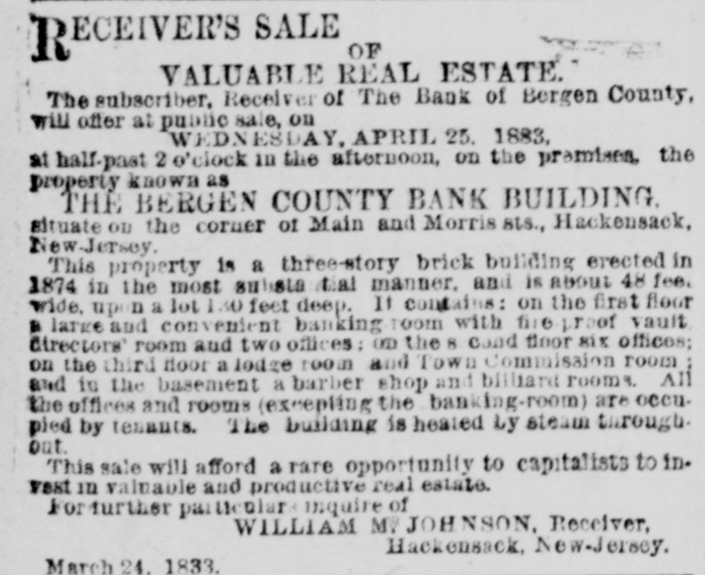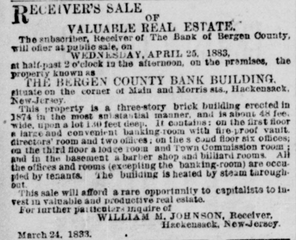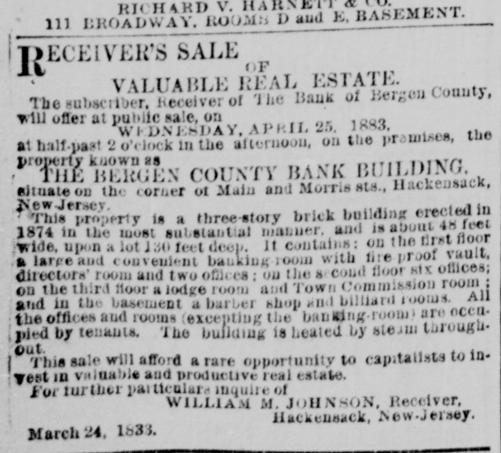 DRIAN H. MULLER, Auctioneer. A EXECUTOR'S SALE TO CLOSE THE ESTATE OF DANIEL E. VAN VOLKENBURGH, DEC'D. 139 VALUABLE LOTS ON THE BOULEVARD, 5TH 6TH, 7TH, 10TH AND ST. NICHOLAS AVES., KINGS BRIDGE ROAD, 99TH, 113TH, 114TH, 116TH, 117TH, 118TH, 110TH, 120TH, 121ST, 122D, 147TH, 215TH AND 216TH STS. ADRIAN H. MULLER & SON will sell at anotion OR THURSDAY, APRIL 26, at 12 o'clook. at the Exchange Salesroom. No. 111 Broadway. the following described real estate, viz.: BOULEVARD AND 99TH-ST., 5 lots, N. W. corner. BOULEVARD AND 147TH-ST. 21 lots. 8. W. corner. FIFTH-AVE. 4 lots, N. W. corner 118th-st. ST. NICHOLAS-AVE. 4 lota, N. E. corner 113th-st. 113TH AND 114TH STS.,6 lots N. S. 113th-st., 10 lots 8. B 114th-st., between St. Nicholas and 6th-aves. 6TH-AVE., 4 lots N. W. corner 113th-st. 6TH AVE. 8 lots, entire westerly front between 116th and 117th-sis. 116TH AND 117TH STS., 11 lots N. 8. 116th-st., 11 lots 8.8.117th-st. 100ft west 6th-vve. 118TH AND 119TH-STS.. 9 lots N. S. 118th-st., 9 lots S. S. 119th-st 100 ft. west 6th-ave. OTH-AVE. 8 lots, entire westerly front between 118th and 119(b-sts. 1201H-ST. 10 lots, N. S., 125 ft. west 7th.ave. 121ST T., 5 lots 8. 8.. 250 feet west 7th ave 121ST AND 122D STS., 3 lots N. S. 121st.st, and 3 lots 8. B. 122d-st., 175 ft. west 7th-ave. KING&BRIDGE R AD, 10TH-AVE., 215TH AND 216TH STS., 8 lots the entire block. Fifty per cont may remain on board and mortgage for three years at à per cent. Book maps at the office of the auctioneers. No. 7 Plue-st. ECEIVER'S SALE OF R VALUABLE REAL ESTATE. The subscriber, Receiver of The Bank of Bergen County, will offer at public sale, on WEDNESDAY, APRIL 25. 1883, at half-past 2 o'clock in the afternoon, on the premises, the property known as THE BERGEN COUNTY BANK BUILDING. situate on the corner of Main and Morris BLU, Hackensack, New-Jersey. This property is a three-story brick building erected in 1874 in the most substantial manner. and is about 48 feel wide, upon a lot 130 feet deep. It Contains: on the first floor a larke and convenient banking.100m with fire broof vault. directors' room and two offices: on the 8 coud floor six offices; on the chird floor a lodge room and Town Commission room and in the basement a barber shop and billiard rooms. All the offices and rooms (excepting the banking-room) are occupied by tenants. The building is heated Ly steam through. out. This sale will afford a rare opportunity to capitalists to in. vest in valuable and productive real estate. For further particulars inquire of WILLIAM M. JOHNSON, Receiver, Hackensack, New-Jersey. March 24. 1833.