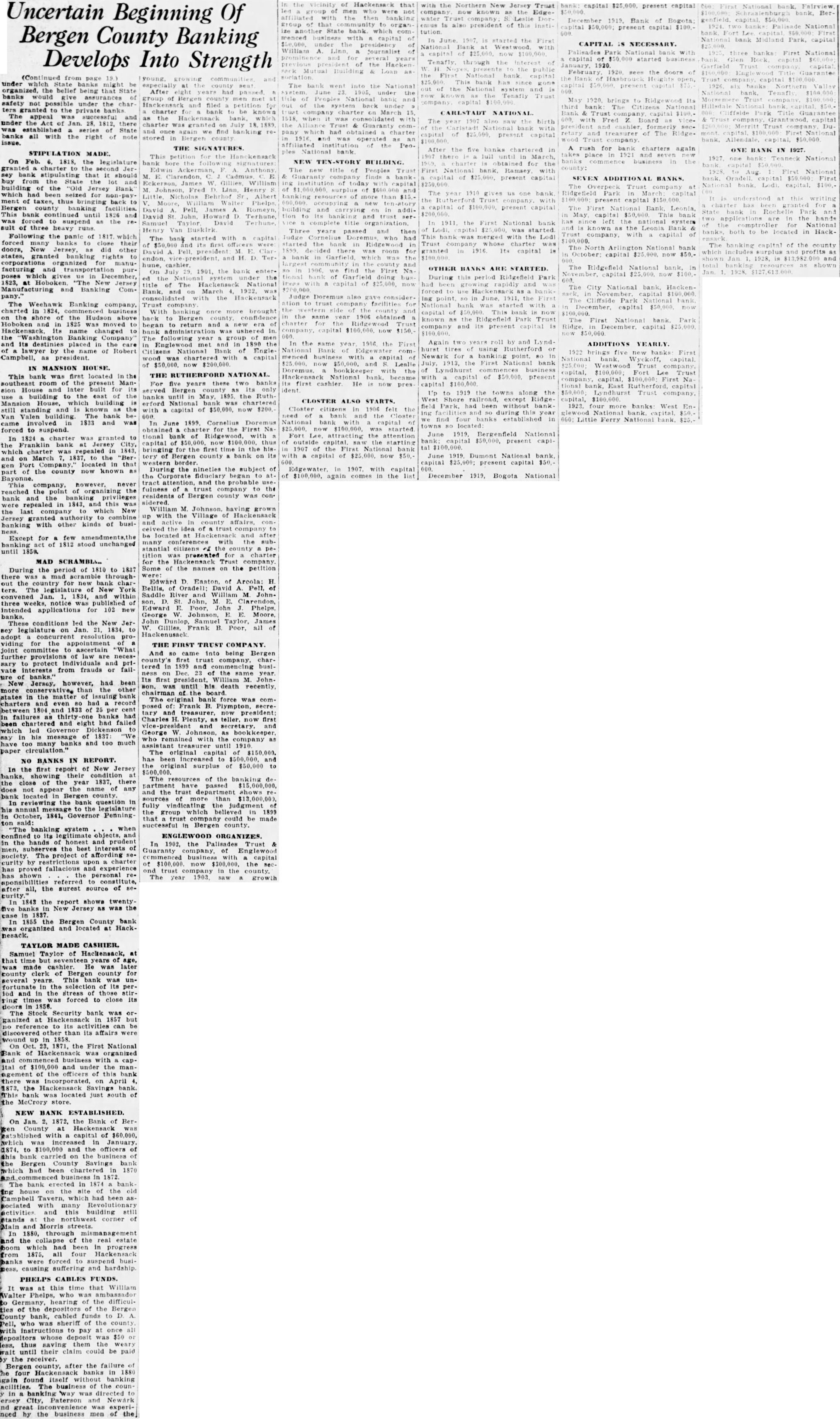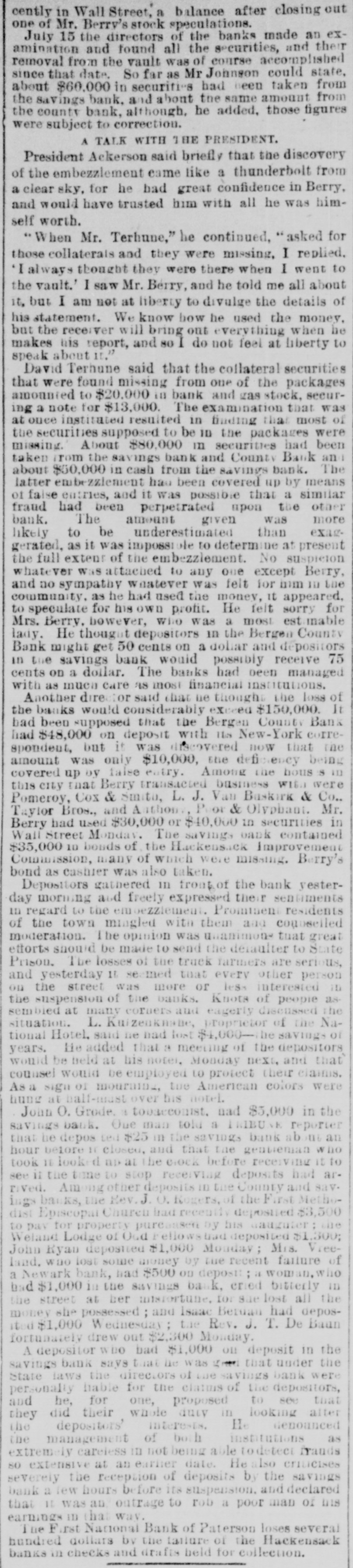 cently in Wall Street," a balance after closing out one of Mr. Berry's stock speculations. July 15 the directors of the banks made an examination and found all the securities, and their removal from the vault was of course accomplished since that date. So far as Mr Johnson could state, about $60,000 in securities had been taken from the savings bank, and about the same amount from the county bank, although, he added, those figures were subject to correction. A TALK WITH THE PRESIDENT. President Ackerson said briefly that the discovery of the embezzlement came like a thunderbolt from a clear sky, for he had great confidence in Berry, and would have trusted him with all he was himself worth. When Mr. Terhune," he continued, "asked for those collaterais and they were missing, I replied. 'I always thought they were there when I went to the vault.' I saw Mr. Berry, and he told me all about it, but I am not at liberty to divulge the details of his statement. We know how he used the money, but the receiver will bring out everything when he makes his report, and 80 I do not feel at liberty to speak about it." David Terhune said that the collateral securities that were found missing from one of the packages amounted to $20,000 in bank and was stock, securing a note for $13,000. The examination that was at once instituted resulted in finding that most of the securities supposed to be ID the packages were missing. About $80,000 in securities had been taken from the savings bank and County Bank and about $50,000 in cash from the savings bank. The latter embezziement has been covered up by means of false entries, and it was possible that a similar fraud had been perpetrated upon the other bank. The amount given was more likely to be underestimated than exaggerated, as it was impossi de to determine at present the full extens of the embezzlement. No suspicion whatever Was attached to any one except Berry, and no sympathy whatever was felt for mm ID the community, as he had used the money, it appeared, to speculate for his own profit. He felt sorry for Mrs. Berry, however, who was a most est mable lady. He thought depositors in the Bergen County Bank might get 50 cents on a dollar and depositors in the savings bank would possibly receive 75 cents on a dollar. The banks had been managed with as much care as most financial institutions. Another dire or said that ne thought the loss of the banks would considerably exceed $150,000. It bad been supposed that the Bergen County Bank had $48,000 on deposit with His New-York correspondent, but it was discovered now that the amount was only $10,000, the deficiency being covered up by false entry. Among the hous S in this city that Berry transacted business WITH were Pomeroy, Cox & Smito, L. J. Van Buskirk & Co., Taylor Bros., and Anthony, Poor & Olypbant. Mr. Berry had used $30,000 or $40,000 in securities in Wall Street Monday. The savings bank contained $35,000 10 bonds of the Hackensack Improvement Commission, many of which were missing. Berry's bond as cashier was also taken. Depositors gathered in frontof the bank yesterday morning and freely expressed their sentiments in regard to the emoezziement. Promisent residents of the town mingled with them and counselled moderation. The opinion was unanimons tuat great efforts should be made to send the délaulter to State Prison. The losses of tue truck farmers are serious, and yesterday 11 seemed that every other person on the street was more or less interested in the suspension of the banks. Knots of people as sembled at many corners and eagerly discussed the situation. L. Kuizenknabe, proprietor of the National Hotel, said ne had lost $4,000- savings of years. He added that a meeting of the depositors would be held at his notel, Monday next, and that counsel would be employed to protect their claims. As a sign or mourning, tue American colors were hung at half-must over his notel. John O. Grode. a tooacconist. had $5,000 in the savings bank. Que man told a IRIBUNE reporter that be depos ted $25 in the savings bank ab 01 an hour before IT closed, and that the gentleman no took 11 look di no at the Clock before receiving it to see il the time to stop receiving deposits had arrived. Am other deposits in the County and sav. ings banks, the Rev. J. O. Rogers, of the First Methodist Episcopal Church bad recently deposited $3,500 to pay for property purceased by his cauguter the Weland Lodge of Oud Fellows trad deposited $1,300; John Ryan deposited $1,000 Monday Mrs. Vreeland. wao lost some money by tue recent failure of a Newark bank, had $500 on depost: a woman, who bad $1,000 111 the savings bank, cried bitterly in the street at her misrortune. for sue lost all the money she possessed ; and Isaac Berdan had deposited $1,000 Wednesday the Rev. J. T. De Baun fortunately drew out $2,300 Monday. A depositor who bad $1,000 on deposit in the savings bank says that De was grad that under the State laws the directors of the savings bank were personalty hable for the claims of the depositors, and he, for one, proposed to see that they did their whole duty in looking after the depositors' interests. He denounced the management of both institutions as extrem ly careless in not being able todetect frauds so extensive at an earlier date. He also criticises severely the reception of deposits by the savings bank a few hours be fore its suspension, and declared that II was an outrage to rob a poor man or his tha will