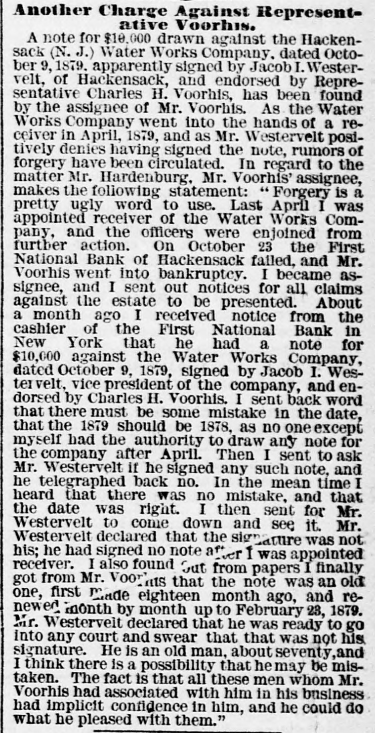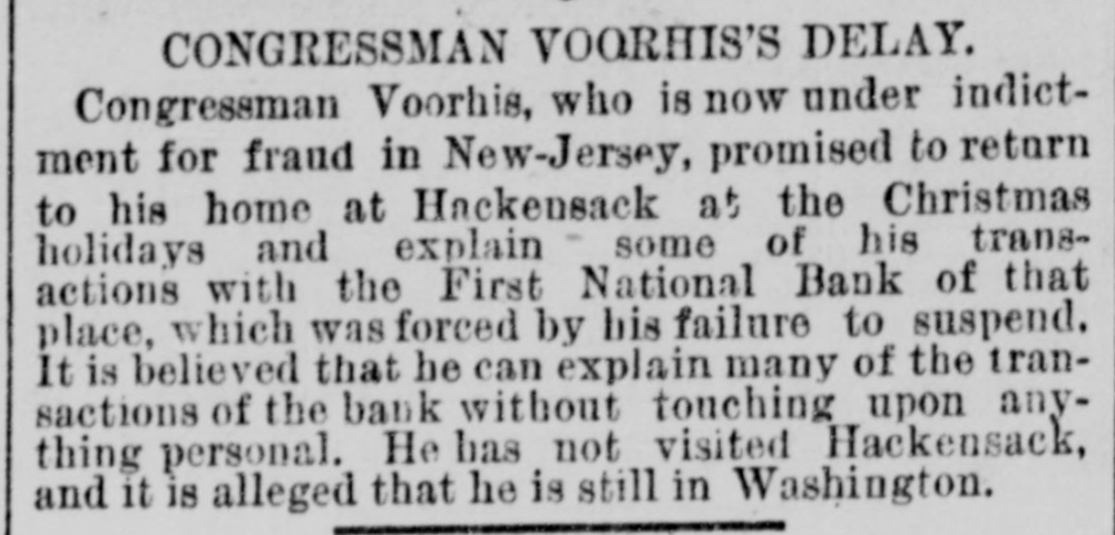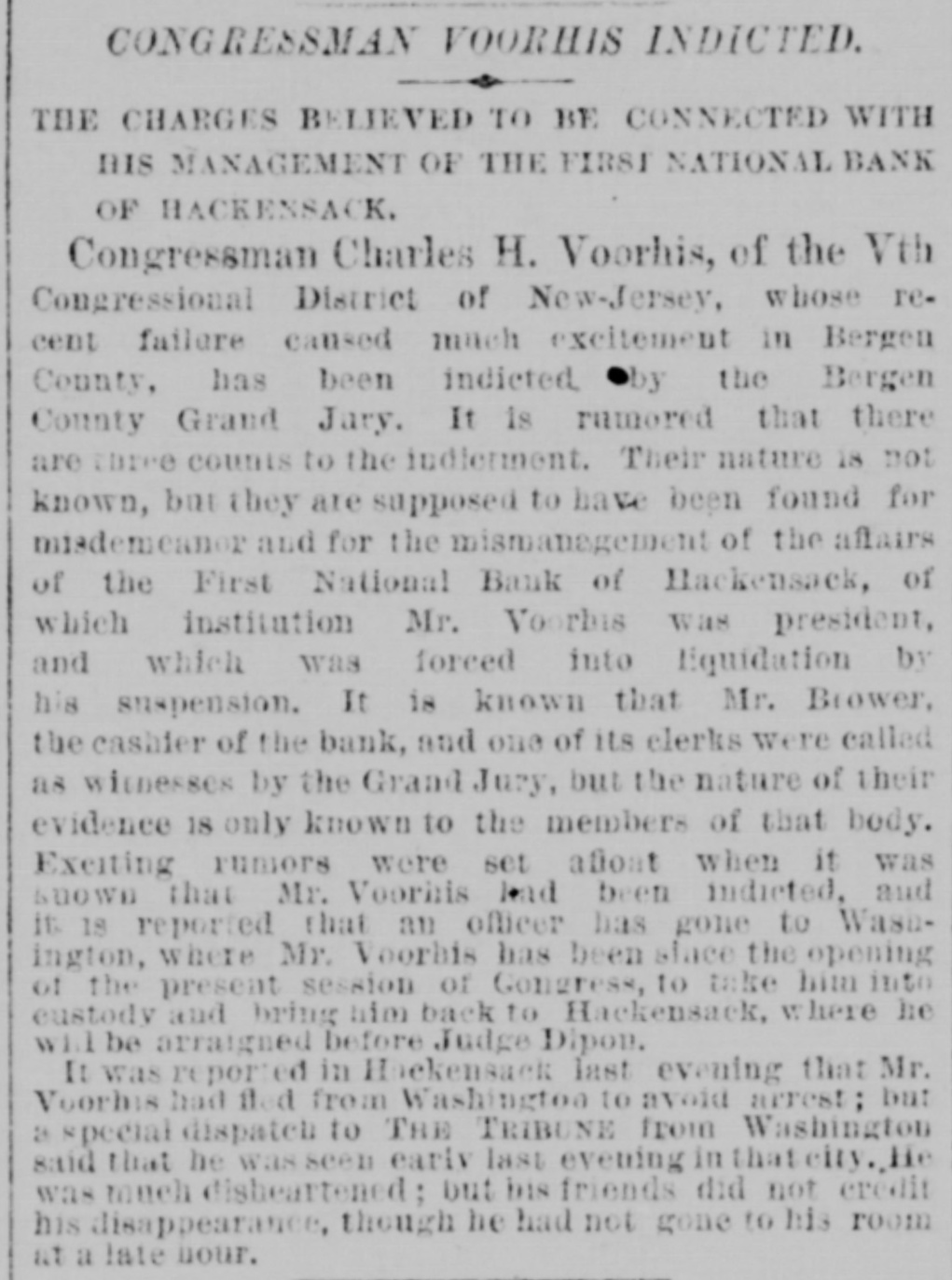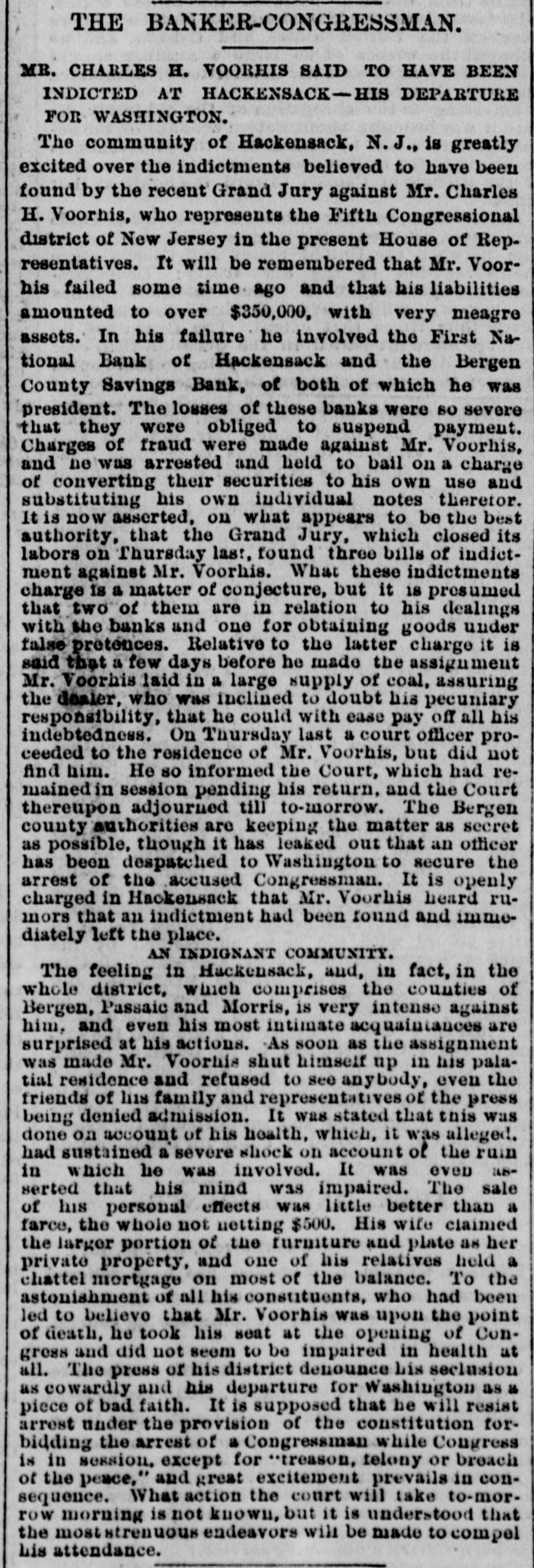 Congressman Charles H. Voorhis, Fifth Congressional District of New Jersey, has been indicted by the Bergen County Grand Jury for fraud in connection with his management as President of the First National Bank of Hackensack. The bank has gone into bankruptcy in consequence of Voorhis's suspension.