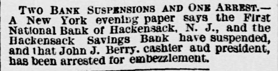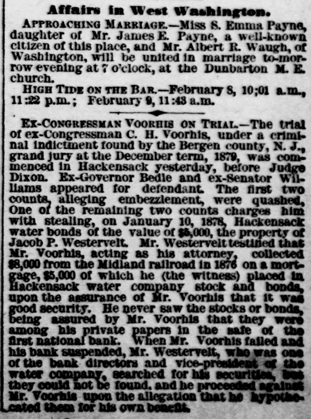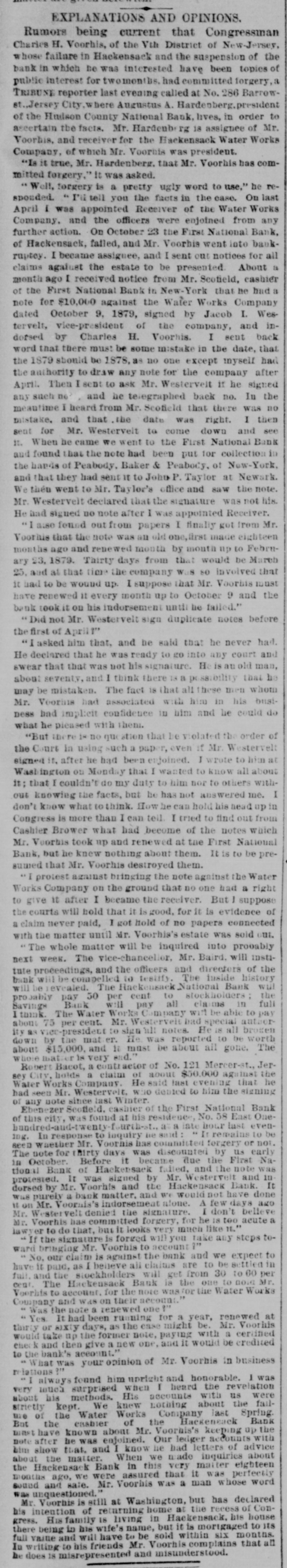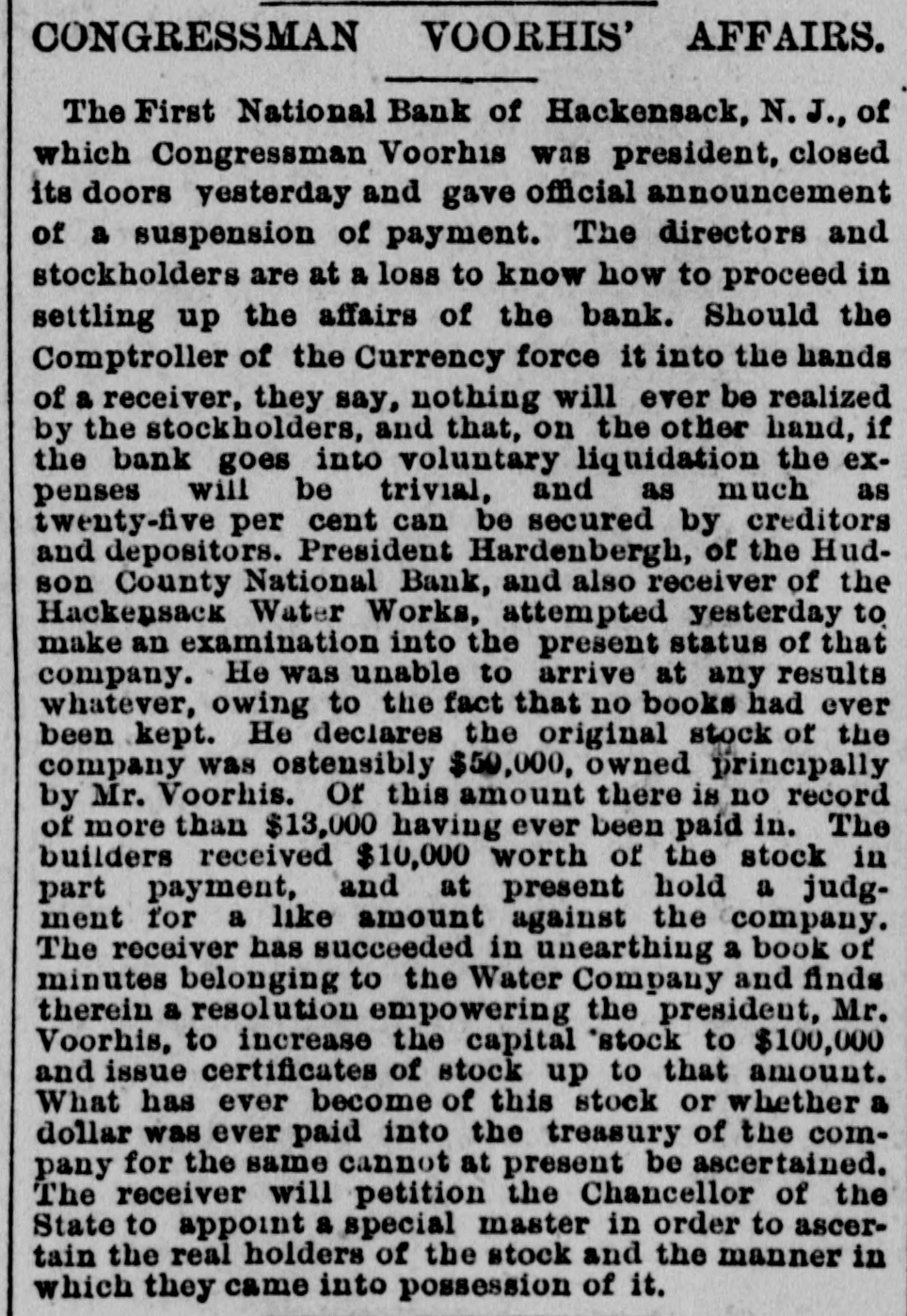 Congressman Charles H. Voorhis, Fifth Congressional District of New Jersey, has been indicted by the Bergen County Grand Jury for fraud in connection with his management as President of the First National Bank of Hackensack. The bank has gone into bankruptcy in consequence of Voorhis's suspension.