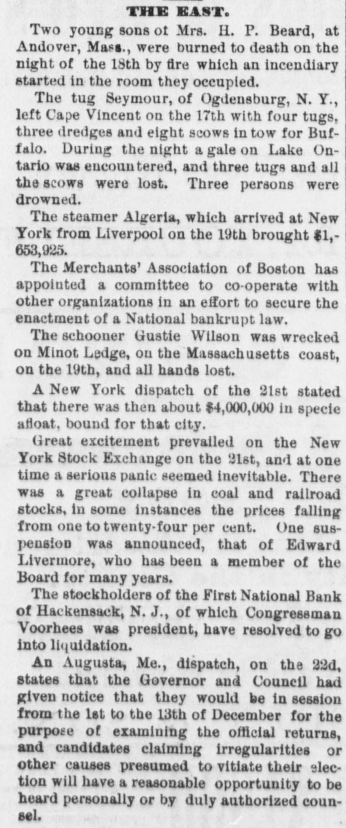 An immense Republican indignation meeting was held at Bangor, Me., on the night of the 19th, to protest against the alleged fraudulent counting out of Republican members of the Legislature by the Democratic Governor and Counsel. Ex-Gov. Connor presided and Senator Blaine made a speech.